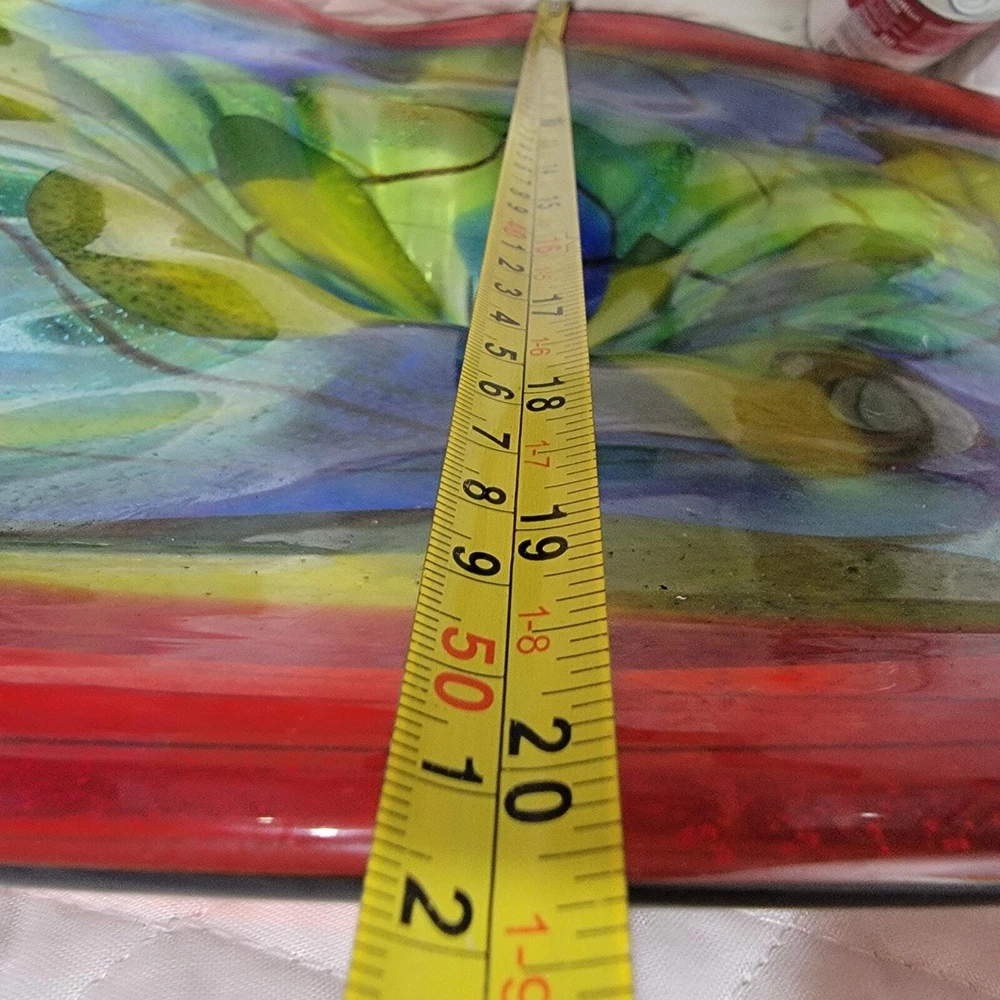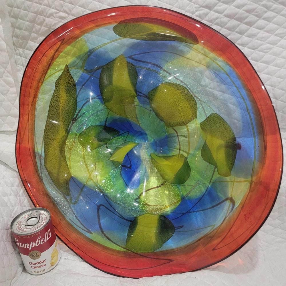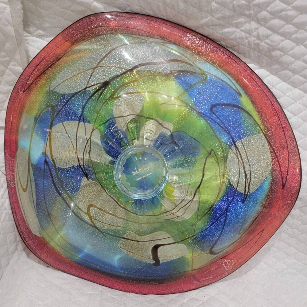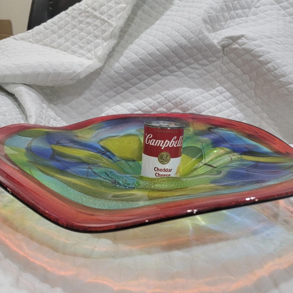 Dale Tiffany 20" Hankley, large hand blown glass dish is very versatile and can be used as an art display, plate platter fruit bowl, or can be secured at base as wall décor. Slightly curved edges, light green and olive colored swirls with blue mixed in, thin red band and black trim. Has a 1" glass base. I have multiple Dale Tiffany dishes in various sizes. You can use a variety of them to create a stunning, artistic wall mural with wall brackets that are not included but can be found at home improvement stores. Soup can is pictured to show size and dimension. Measures 20.5 inches across and 4 inches at the highest part of the curved edge. Like new condition. Never used & label still on the base. Nonsmoking home with awesome pugs.