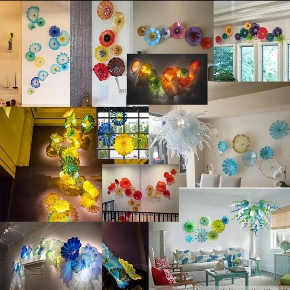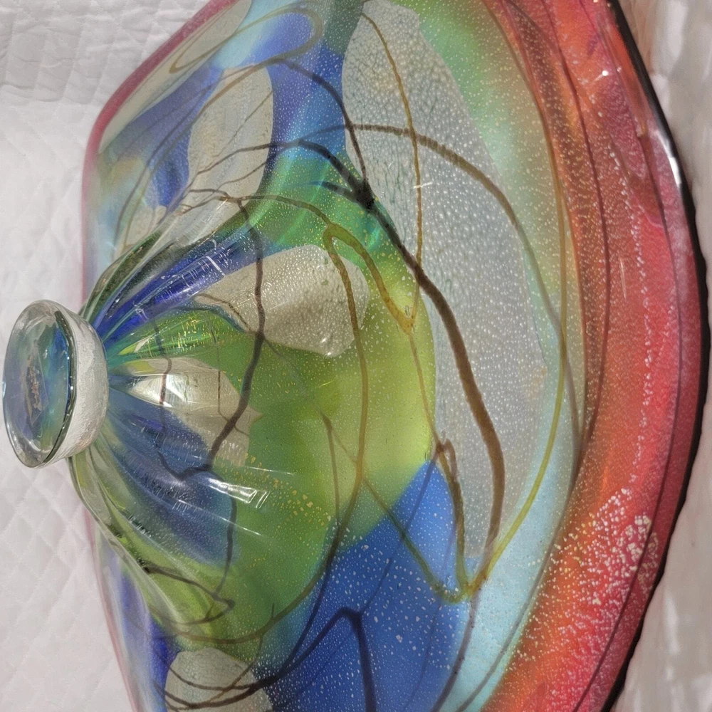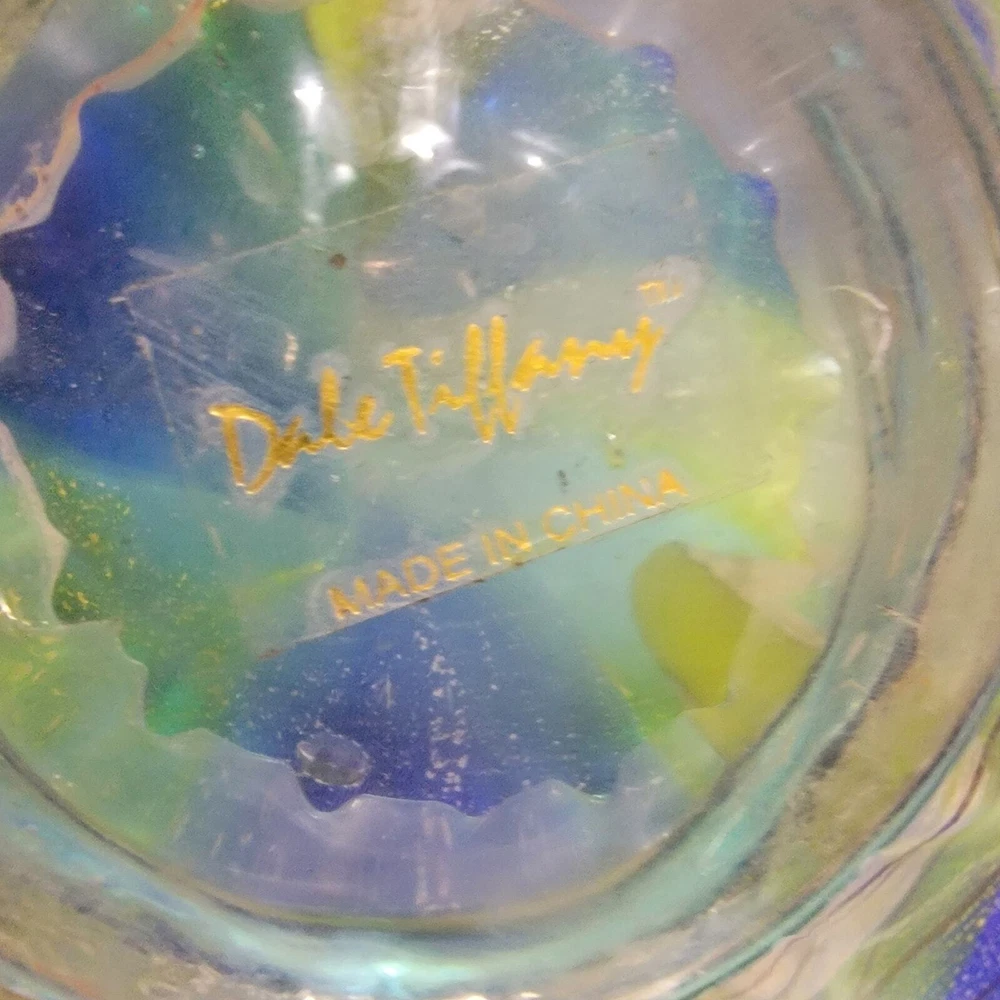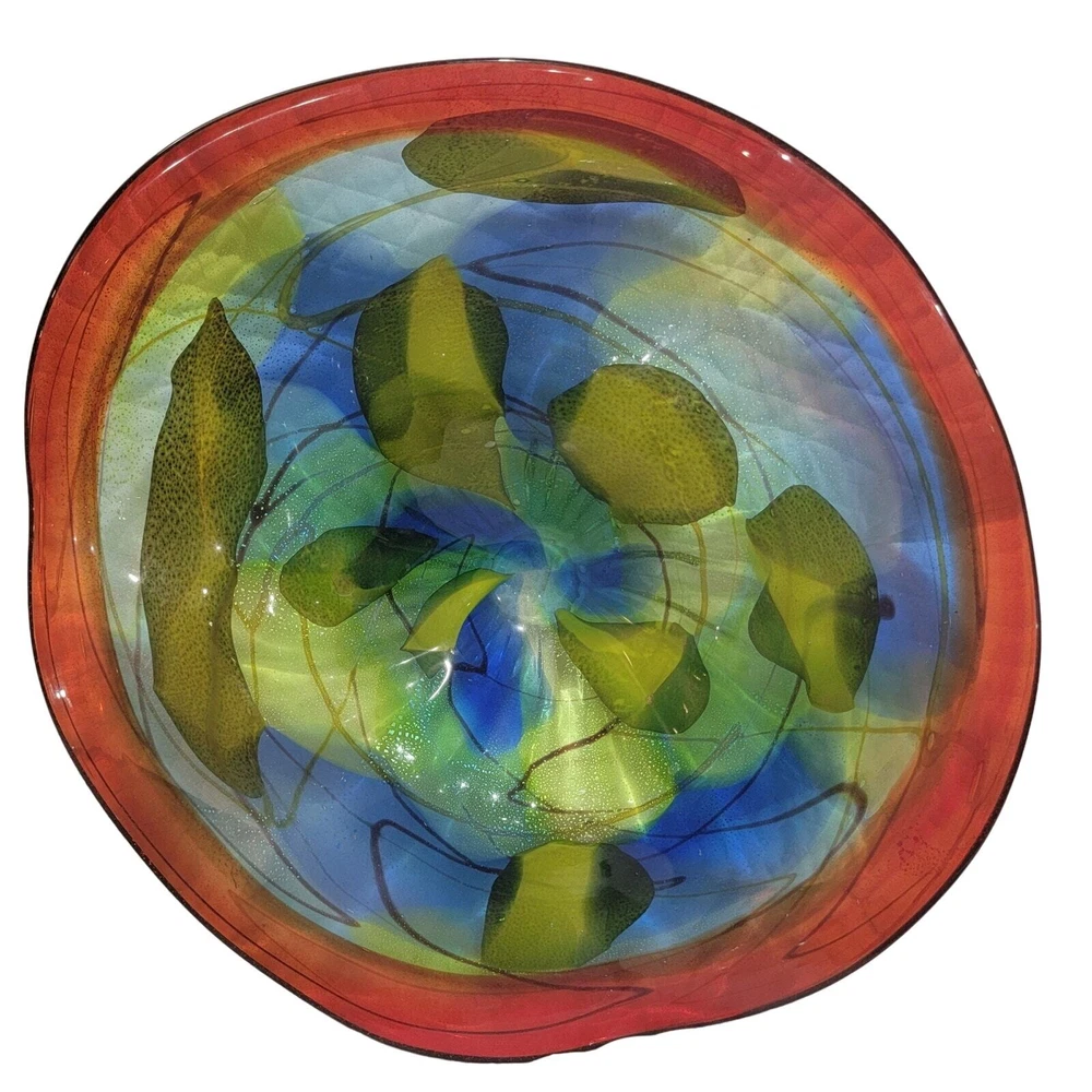 Dale Tiffany 20" Hankley, large hand blown glass dish is very versatile and can be used as an art display, plate platter fruit bowl, or can be secured at base as wall décor. Slightly curved edges, light green and olive colored swirls with blue mixed in, thin red band and black trim. Has a 1" glass base. I have multiple Dale Tiffany dishes in various sizes. You can use a variety of them to create a stunning, artistic wall mural with wall brackets that are not included but can be found at home improvement stores. Soup can is pictured to show size and dimension. Measures 20.5 inches across and 4 inches at the highest part of the curved edge. Like new condition. Never used & label still on the base. Nonsmoking home with awesome pugs.