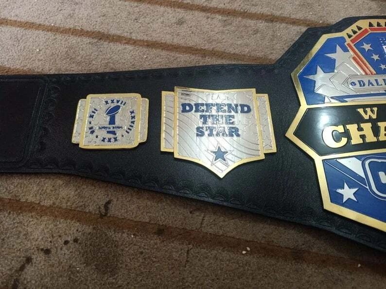Welcome to our shop ------------------------------------------- We are specialist in manufacturing handmade products:: Our wide range of products include: >>>>Championship Belts WWE | WWF | AEW | UFC | WBC | WCW Product Description ** Dallas Cowboys championship belt *** Plate Metal: Brass (Zinc available on request with additional cost) Strap: 100% Leather Largest Waist Size: Fits upto 46'' Belt Length: ~50" Weight: 6.17 lbs | 2.81 Kg Plate Thickness: 2mm (4mm Version available on demand with additional cost) ::The belt is well crafted and manufactured to meet the quality demands of fans:: Get your hands on this marvelous piece now! Note: If you need further details kindly inbox us, we will try to be as responsive as possible. ------------------------------------------- Return Policy: Generally we don't have much complains on our products and we make sure to 100% satisfy our clients. We send the product in well Bubble Wrapped packaging so there is highly unlike chance of getting damaged item. In case there is a damage, we will try to give partial refund or you can ask for full refund within 30 days after returning the belt to origin. NOTE: 1. If you have placed the order by mistake or you have purchased a wrong item then we are not going to refund that. 2. Buyer will pay the shipping fee of returning the belt. ------------------------------------------- Happy Shopping! :)