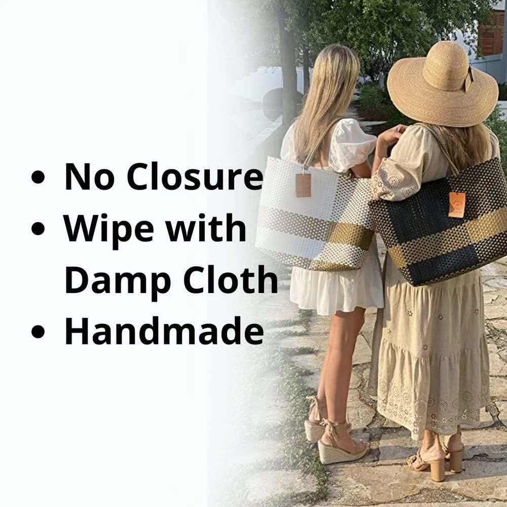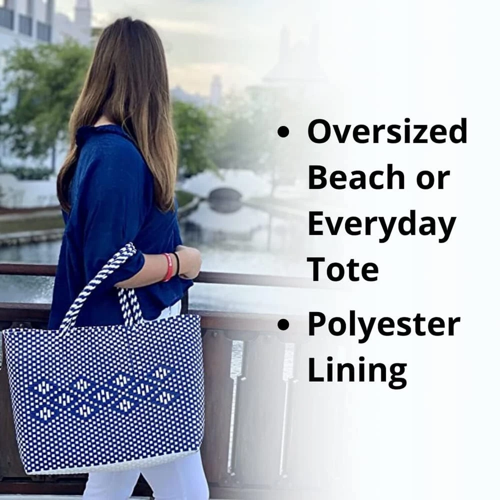 Dallas Hill Designs Handwoven Super Tote Bag for Women | Recycled Plastic Shoulder Purse | Summer Beach, Pool, and Travel Handbag (Navy & White) Product Details Color: Black Multi Brand: Dallas Hill UPC: 608028522216 EAN: 0608028522216 MPN: Does not apply Model Name: Woven Plastic Age Range Description: Adult UPC: 608028522216 Brand: Dallas Hill Fill Material: Handwoven Recycled Plastic Outer Material: Plastic Material Features: Recycled Material Fabric: Plastic Lining Description: Handwoven Recycled Plastic Inner Material: Plastic Item Weight: 8 Ounces Strap Length: 9.5 Inches Item Dimensions: 15 x 5 x 14 inches Capacity: 48 Cubic Inches Item Shape: rectangular prism Pattern: Plaid Color: Black Multi Style Name: Woven Plastic Closure Type: No Closure Handle Type: Double Shoulder Strap Number of Sections: 1 Number of Handles: 2 Pocket Description: Jetted Pocket Strap Type: Double Shoulder Strap FASHION MEETS FUNCTION Oversized designer tote bag is ideally sized for weekend getaways, afternoons spent at the beach or by the pool, and more. Choose from an assortment of colors, plaids, and pattern styles. COMFORTABLE TO CARRY Lightweight bag is easy to transport via stylish double shoulder straps. DURABLE CONSTRUCTION Fashioned from premium recycled plastic, this sturdy material resists rips and tears. All-weather material is highly water-resistant. SIZE Large capacity tote measures 18 x 13 x 5.5. Handle drop 9.5. EASY TO CLEAN With this low maintenance bag, simply hand wash in cold water with mild soap and air dry.