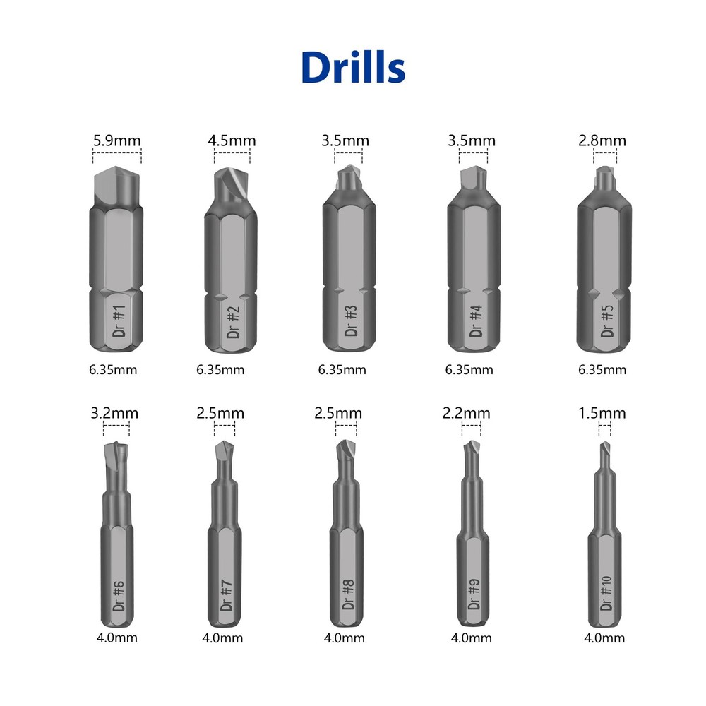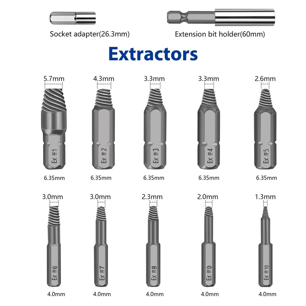 NEW ARRIVAL ⚡⚡⚡ change the traditional ideas and devoted to studying professional broken bolt extractor ✅ High-Speed Steel 4341 ✅ Suitable for general sizes and all kinds of broken bits ✅ Universal chuck that suitable for most electric hand drills ✅ Remove broken screw in one step(Do not need to conversion the extractor or adjust the chuck) How to Use the Screw Extractor? 1. The size of #6 - #10 needs to be installed in the socket adapter first, and then attach it to the extension bit holder (The other sizes can be attached to the extension bit holder directly) 2. Use the drill(Dr) bit to drill a hole in broken screws 3. Change to use the extract(Ex) bit with the same size 4. Reverse use the drill and take out the broken bit Warm Tips : - Must drill a hole first when the break screw surface is smooth. Otherwise the drill bit will slip - Must be vertical and low speed when drilling, reverse use this bit, drill the first hole deeper will easier to take out - It is best to use electric hand drill, can not be used the hammer drill mode! Must be low speed during use! Package Included: 20*Kelepopo damaged screw extractor(Ex#1 - #10, Dr#1 - #10) 1*Magnetic Extension Bit Holder 1*Socket Adapter Kelepopo - Your Professional Tool House We are committed to providing the best quality products, and largely dependent on product feedback from wonderful customers such as yourself. ✦✦✦If you have any questions or concerns about our product, please do not hesitate to contact us, we always here to service you Damaged Screw Extractor : screw extractor is made of high quality High-Speed Steel 4341. High hardness, durable and easily remove damaged screws In one step : The stripped screw extractor set is included two extension bit holder. Can remove in one step, do not need to conversion the extractor or adjust the chuck Extremely Versatile : The stripped screw extractor kit is includes 20 pieces of stripped screw extractor in 10 different sizes to satisfy all you demand. Suitable for any sizes screw or bolt Multipurpose : Suitable for allen bolts, machine screws, lag bolts, wood screws, hex bolts, sheet metal screws and other screws Important : It is best to use electric hand drill, can not be used the hammer drill mode! Must be low speed during use!