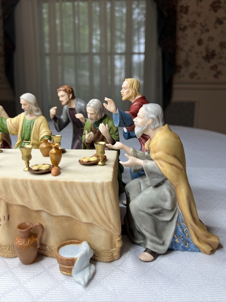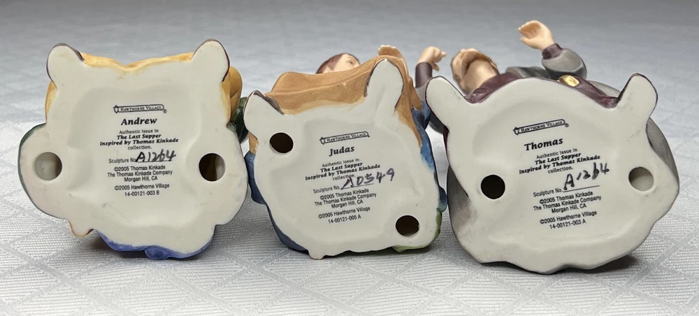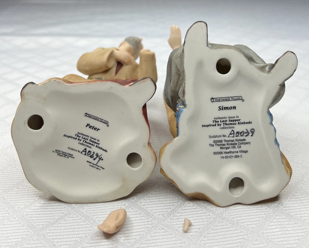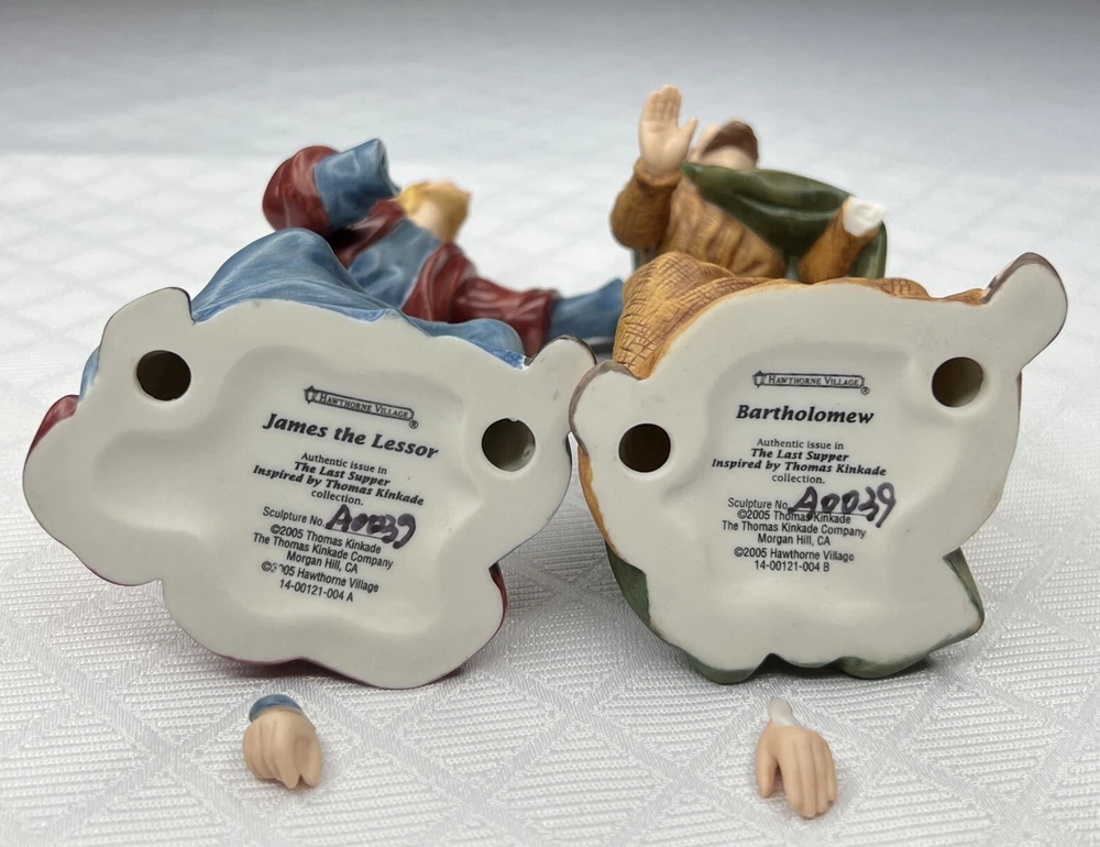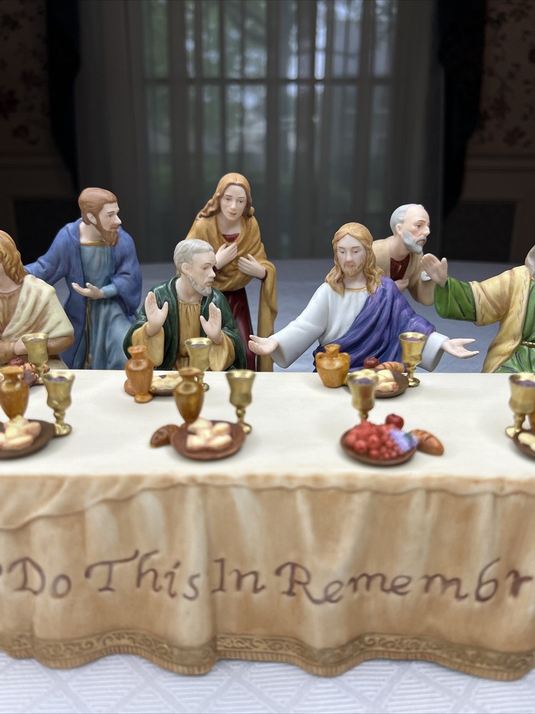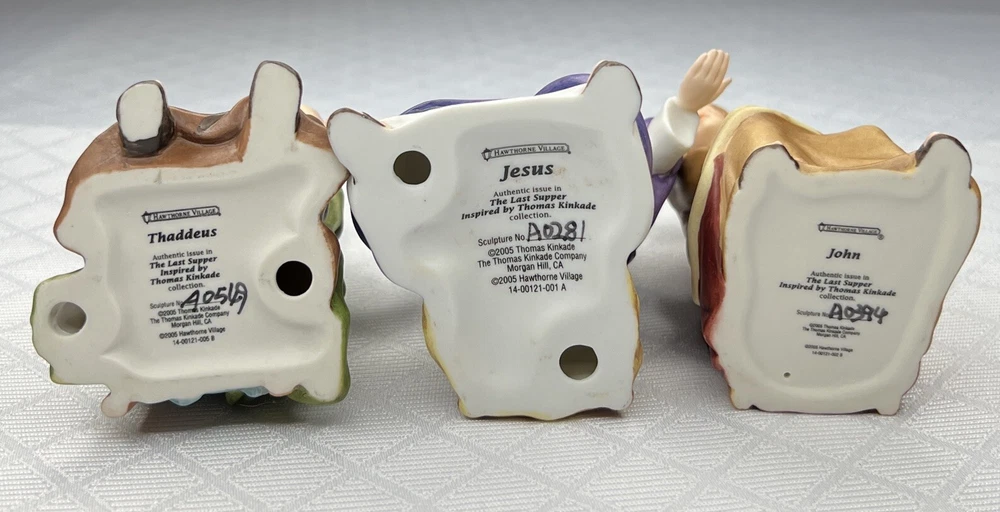 Thomas Kincade Hawthrone Village The Last Supper Porcelain Figures - Damaged. "Remembrance Table" measures approximately 16" W x 2-1/2" H x 3-1/2" D. Please note- one has chipped a finger and three have hands chipped off. The hands and the finger are included and can be reattached with glue. Please see pictures for accurate description of the item and condition. The original foam and box are not included. #27I