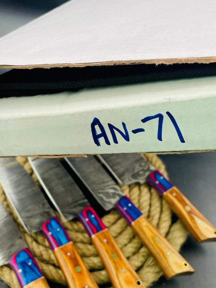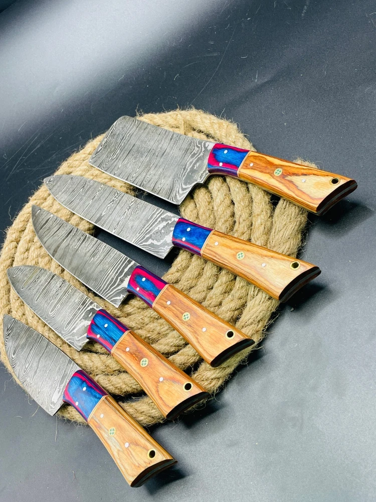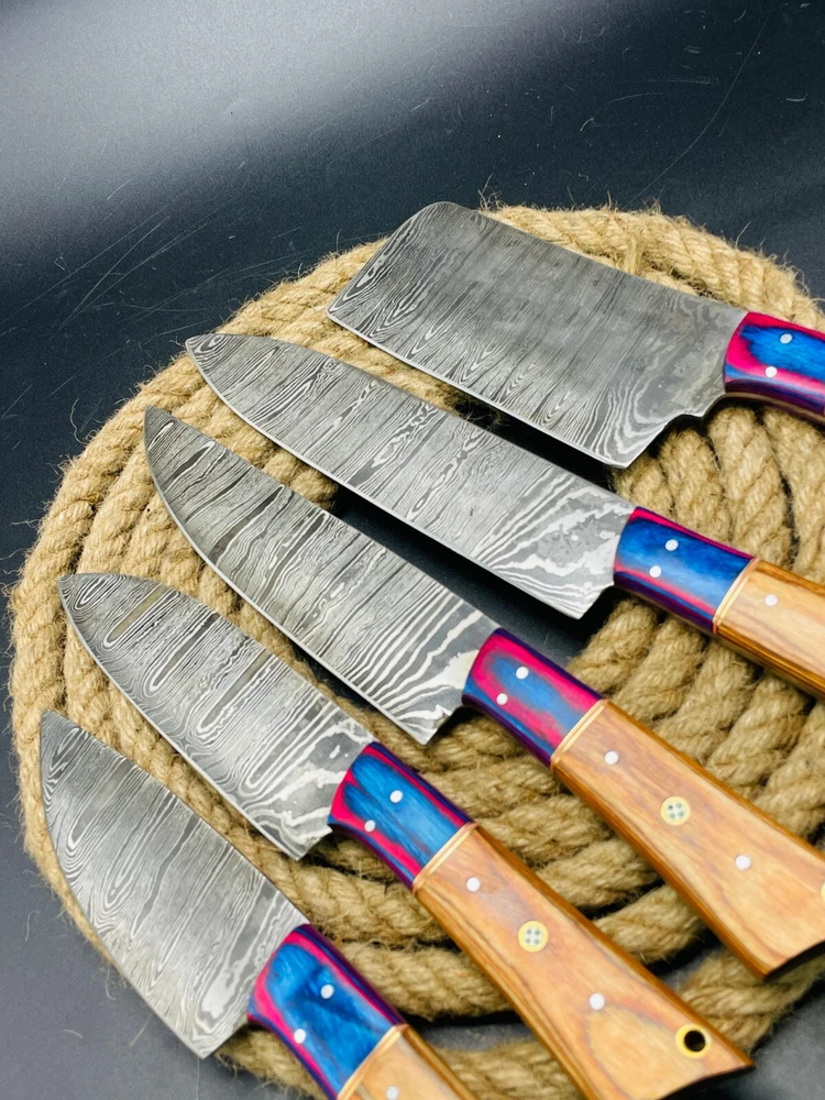 Introducing the Damascus Hand Forged Professional Kitchen 5 Pc Cutlery Chef Knife Set with Bag. This set includes a butcher knife, carving and slicing knives, cleaver, and chef's knife, all made of high-quality damascus steel. The straight edge blade length of each knife is approximately 5-8 inches, making them suitable for a variety of food items such as deep fry, vegetables, fruit, sugar, icing sugar and cocoa, salad, and meat. The Wildcatco brand knives feature a soft grip handle made of wood and come with a leather protective bag for easy storage and transport. These multi-functional knives are easy to clean, but please note that they should be hand washed only. Made in the United States, this knife set is a must-have for any professional kitchen or home cook. Blade material: Damascus Steel Knifes Length: Between 8-13 inches approximately Handle Material: Wood Knifes in Set : 5 Comes with Protective Bag DISCLAIMER: By Bidding / buying, you certify that you are 18 years of age or older and legally authorized to purchase this product in your country. We are not responsible for any injuries associated with the use of our tools. Our products are intended for legal use only by responsible buyers. Before bidding please check your country laws as some countries Custom don't allow this. If your purchase is held by Custom Authorities in your country we will not be responsible for that and no refund will be issued. CUSTOMER SATISFACTION: I’m confident that you will like my products as we struggle hard to provide you TOP QUALITY PRODUCTS. In case of problem please write me before leaving a negative feedback and I will absolutely resolve it. “Your satisfaction is my actual reward!” OUR GUARANTEE: The assurance in our quality allows us to offer you a 15 days money back guarantee. HOW TO TAKE CARE OF YOUR KNIFE: (1) Put a thin layer of oil or lubricant on the blade after each use. This procedure will avoid direct contact of moisture on the blade. Moisture helps the rusting phenomena. (2) DO NOT store it in leather sheath for a LONG period of time. Oil it and store it rather in a plastic bag.