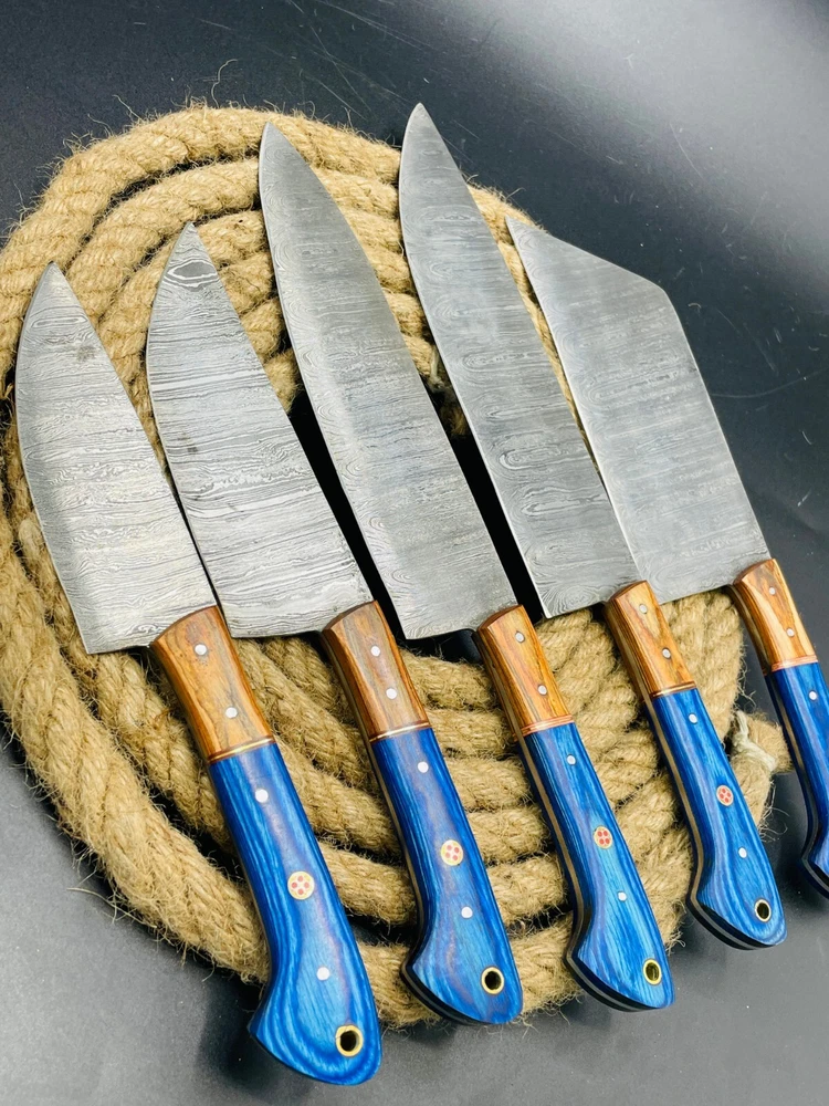 Introducing the Damascus Hand Forged Professional Kitchen 5 Pc Cutlery Chef Knife Set with Bag. This set includes a butcher knife, carving and slicing knives, cleaver, and chef's knife, all crafted from high-quality damascus steel. The knives feature a straight blade edge and a blue color, with a blade length of approximately 5-8 inches. The Wild Catco brand knives are perfect for deep frying, slicing through vegetables, fruits, and meats with ease. The set also includes a leather protective bag for safe and convenient storage. The knives are magnetic, multi-functional, and have soft grips for a comfortable hold. This set is a must-have for any professional kitchen or home chef. Blade material: Damascus Steel Knifes Length: Between 8-13 inches approximately Handle Material: Wood Knifes in Set : 5 Comes with Protective Bag DISCLAIMER: By Bidding / buying, you certify that you are 18 years of age or older and legally authorized to purchase this product in your country. We are not responsible for any injuries associated with the use of our tools. Our products are intended for legal use only by responsible buyers. Before bidding please check your country laws as some countries Custom don't allow this. If your purchase is held by Custom Authorities in your country we will not be responsible for that and no refund will be issued. CUSTOMER SATISFACTION: I’m confident that you will like my products as we struggle hard to provide you TOP QUALITY PRODUCTS. In case of problem please write me before leaving a negative feedback and I will absolutely resolve it. “Your satisfaction is my actual reward!” OUR GUARANTEE: The assurance in our quality allows us to offer you a 15 days money back guarantee. HOW TO TAKE CARE OF YOUR KNIFE: (1) Put a thin layer of oil or lubricant on the blade after each use. This procedure will avoid direct contact of moisture on the blade. Moisture helps the rusting phenomena. (2) DO NOT store it in leather sheath for a LONG period of time. Oil it and store it rather in a plastic bag.