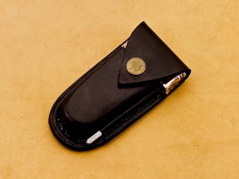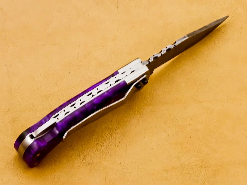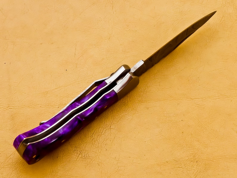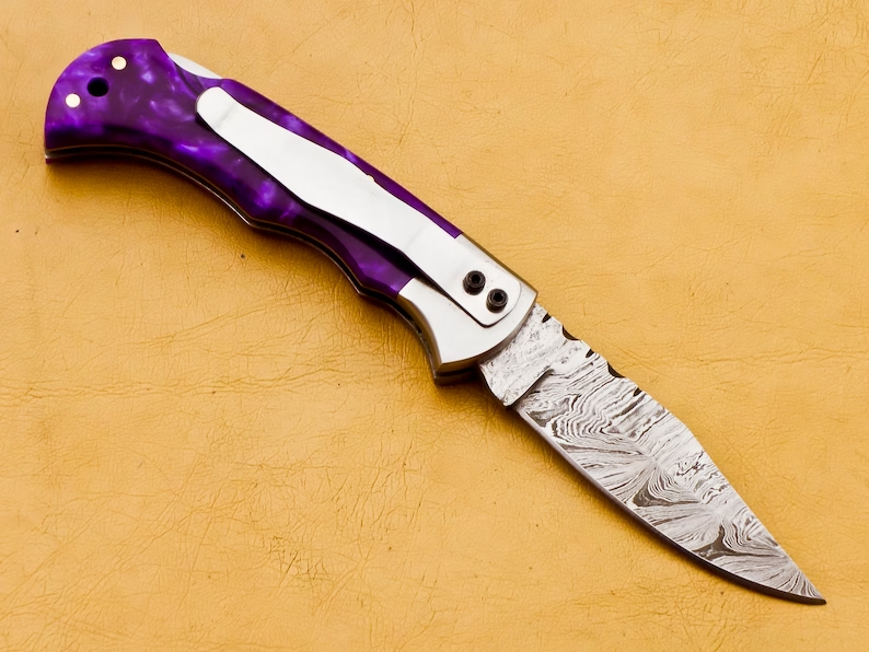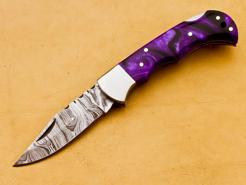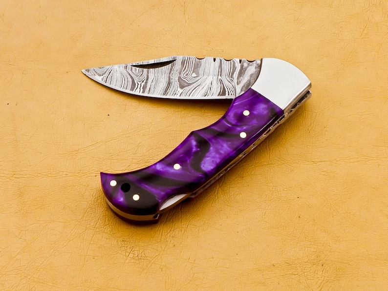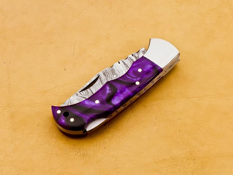 FATHER DAY GIFT.Thank you for visiting our shop. - Dimensions of this product: -- Overall Length: 6.5" Inches -- Blade Length: 2.75" Inches -- Handle Length: 3.75" Inches - Package Includes: Hand Forged Damascus Knife 100% COW LEATHER SHEATH ROD 7" Damascus steel pocket knife with Resin handle. Handmade Damascus steel folding pocket knife with back lock. The knife comes with a leather sheath. All our knives are handmade similar to the photo, differences as such as color and patterns of the natural materials used will differ somewhat because these are all natural materials. Every item will be considered as an original because no one item is ever identical to the other, they are handmade and natural materials are never identical. The combination of layered hard and soft steel creates blade flexibility, toughness and produces invisible serrations on the blade that aid cutting. Care Tips: To prevent rust here are some tips; do not store knife for long periods in the leather sheath. Leather pulls moisture from the air and could rust the blade if not stored properly. After you used your knife wash in soap and water, dry completely. Oil or wax the blade to prevent rust. Care Tips: After you used your knife wash in soap and water, dry completely. Oil or wax the blade to prevent rust. To prevent rust do not store knife for long periods in the leather sheath. Leather pulls moisture from the air and could rust the blade if not stored properly.