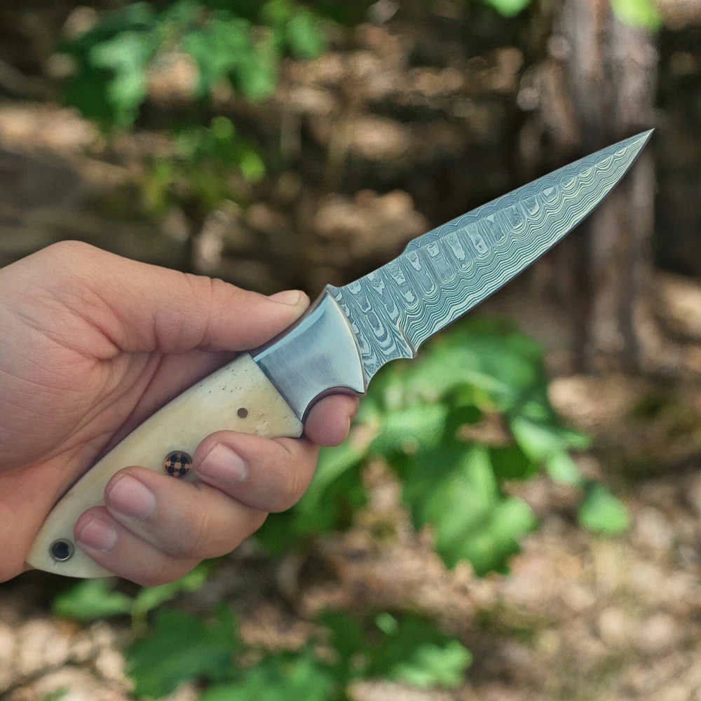 Custom Handmade Damascus Steel Blade Fixed Blade Hunting Knife with Bone Handle and Horizontal Carry Leather Sheath , Heavy Duty Skinner Knife , Bushcraft Knife PREMIUM DAMASCUS STEEL : Hand-forged blade featuring distinctive layered pattern, delivering exceptional sharpness and edge retention with Hardness 56 to 58 HRC . FULL TANG CONSTRUCTION : Damascus Steel Blade Made from 1095 high carbon steel and 15N20 Steels runs through entire handle length for maximum strength and durability during heavy-duty use OVERALL LENGTH: 9 inches or 23 cm total length with ergonomically designed camel bone handle for comfortable grip and precise control . Handle and Blade length is 4.5 inches or 12 cm . Blade thickness is 4mm HORIZONTAL CARRY SHEATH : Durably Stitched Premium vegetable tanned leather sheath included for convenient belt carry and easy access VERSATILE DESIGN : Perfect for hunting, bushcraft, outdoor, camping, and everyday carry tasks with its robust fixed blade design
