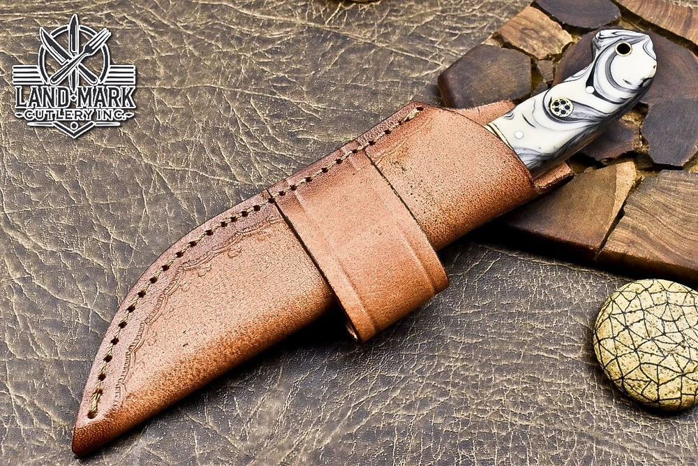 This knife is absolutely stunning! The Damascus steel blade is razor-sharp and holds its edge perfectly, while the white swirl resin handle adds a touch of elegance. The craftsmanship is top-notch—you can tell it’s hand-forged with care. It feels balanced and sturdy in hand, making it great for hunting or outdoor use. The leather sheath is a nice protective touch. Plus, the seller offers shipping discounts for multiple purchases. A must-have for any knife enthusiast!