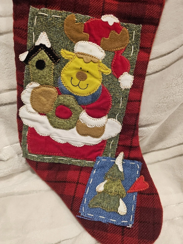 Shape:ReindeerOccasion:ChristmasBrand:Dan DeeNumber of Items:1Set Includes:Christmas StockingMaterial:ClothPersonalize:NoCharacter:ReindeerFeatures:Attached Items, Beaded, DecorativeCountry/Region of Manufacture:ChinaTheme:HolidayPattern:ChristmasFranchise:Dan DeeType:Christmas StockingSubject:ReindeerVintage:YesColor:MulticolorItem Length:16 in