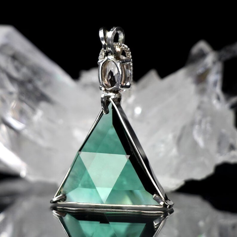 Secondary Stone: Quartz Style: Pendant Color: Green Seller Notes: “NEW” Main Stone: Crystal Type: Necklace Main Stone Color: Green Metal Purity: 925 Pendant Shape: Triangle Brand: Quartz Metal: Silver Theme: Angels, Halloween, Healing, Hip Hop, Inspirational, Love, Luck, Religious, Western Material: Crystal