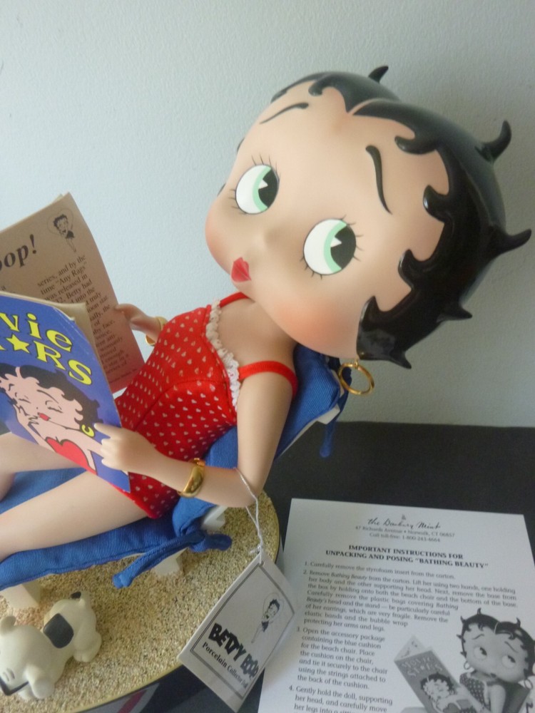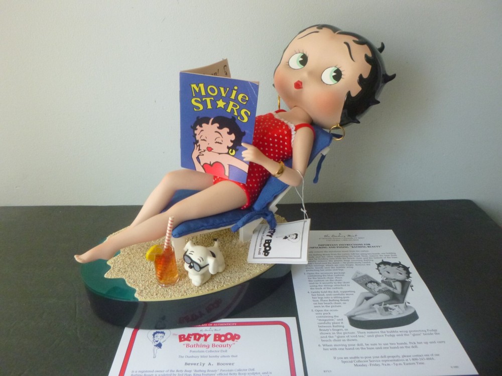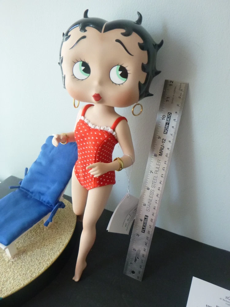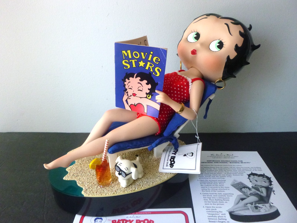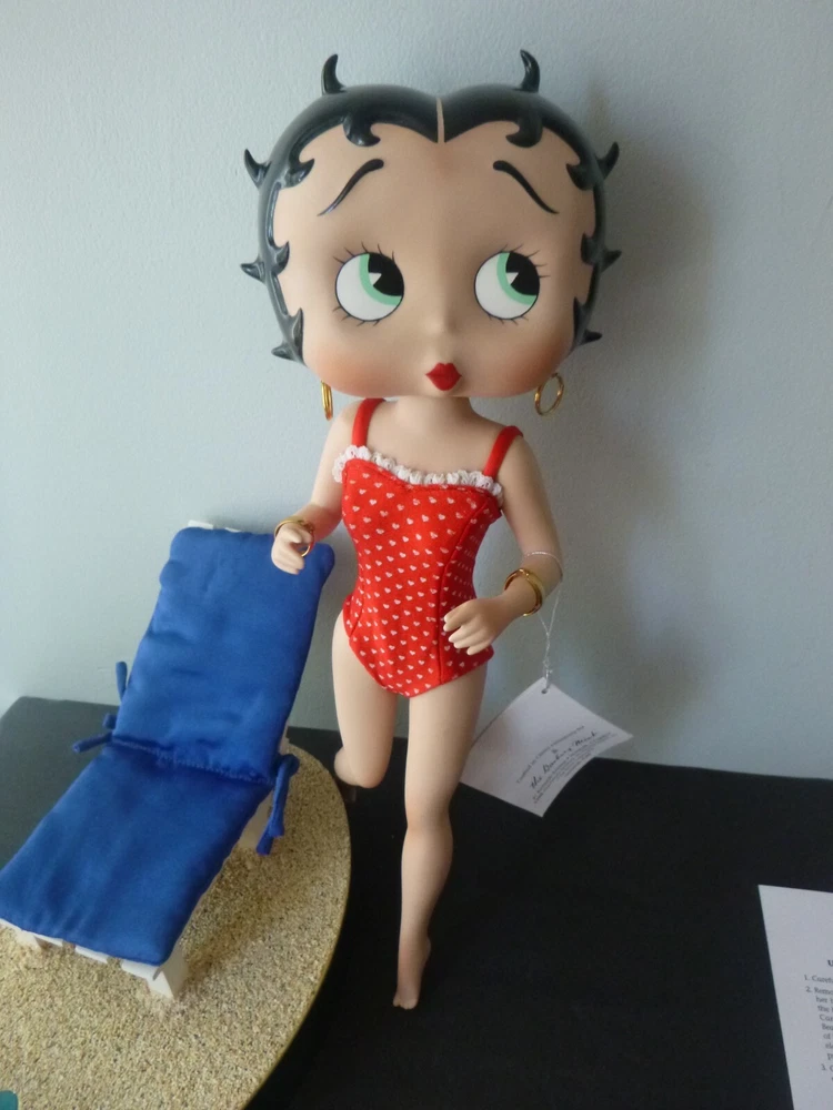 Wonderful Betty Boop large 14" doll all set up for the beach. Excellent condition. The only item worth mentioning is a fold crease at the top of Boop magazine. Comes with all accessories. Chair, chair pad, frosty drink, and Pudgy with sunglasses. (Chair is attached to the beach scene.) She has her hang tag, COA and paper describing how to set up the doll scene. Comes in an oversized original box so sorry about ship costs. Local pick-up is free near Quakertown, PA. Non-smoking home.