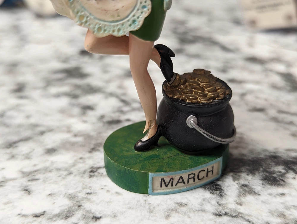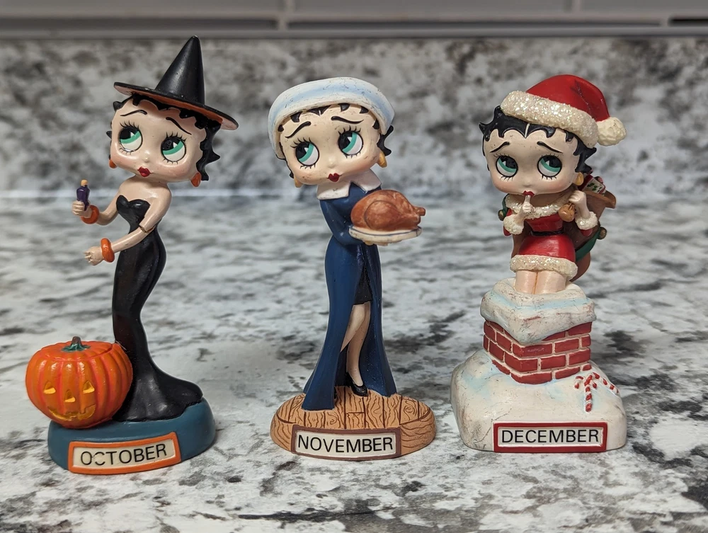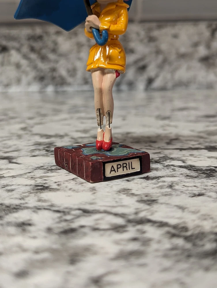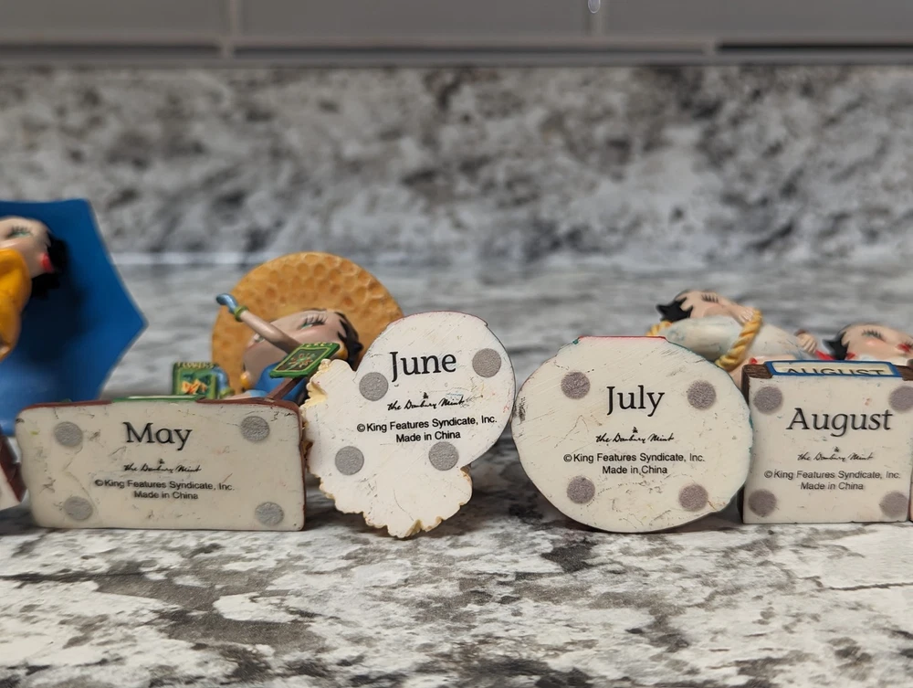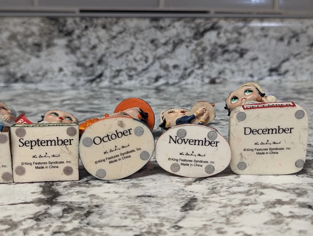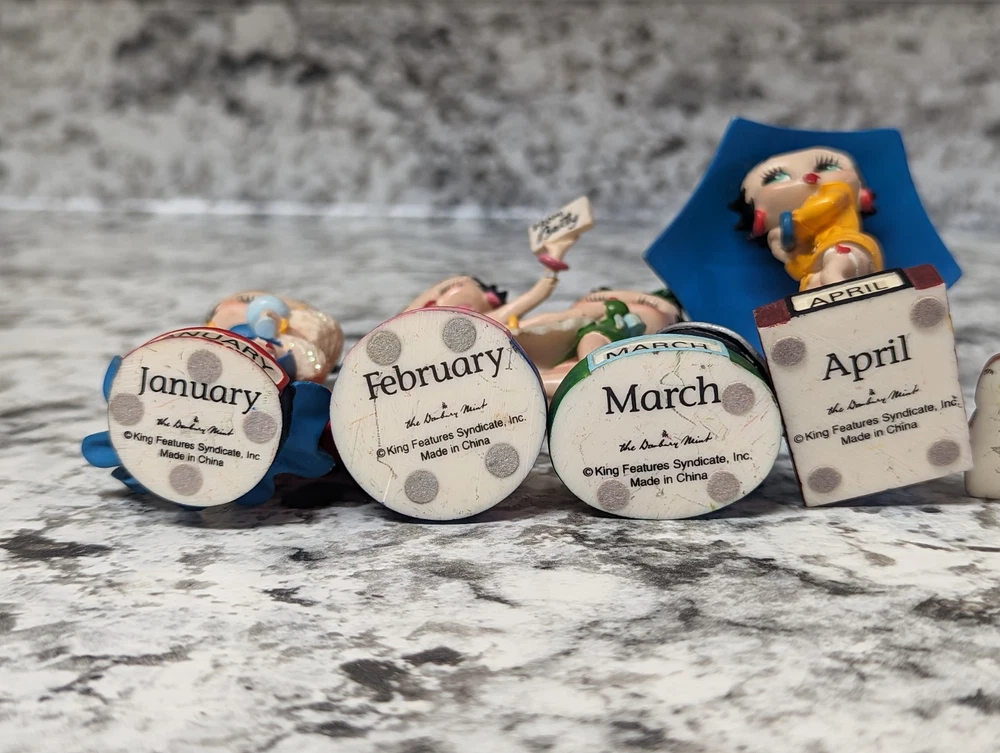 The Danbury Mint Betty Boop Calendar Mth Figurine Booping Through The Years 12. Out of the 12 figures 5 of the months have some slight damage to them. The months of February, March, April, September, and October are the ones with damage, can see in the pictures. The rest of the figurine months are in good condition.