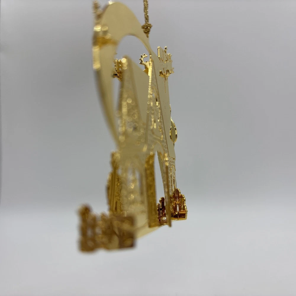 The Danbury Mint Christmas Ornament from 1991 features a charming Santa Claus design with a reindeer sleigh, perfect for adding a touch of holiday cheer to your Christmas tree. This gold-plated vintage ornament is a special addition to any ornament collection, with intricate details and a classic Christmas theme that will be cherished for years to come. Made of gold and metal, this ornament showcases the craftsmanship and quality of Danbury Mint, making it a cherished collectible for any Christmas enthusiast. This item does not come in original packaging/box.
