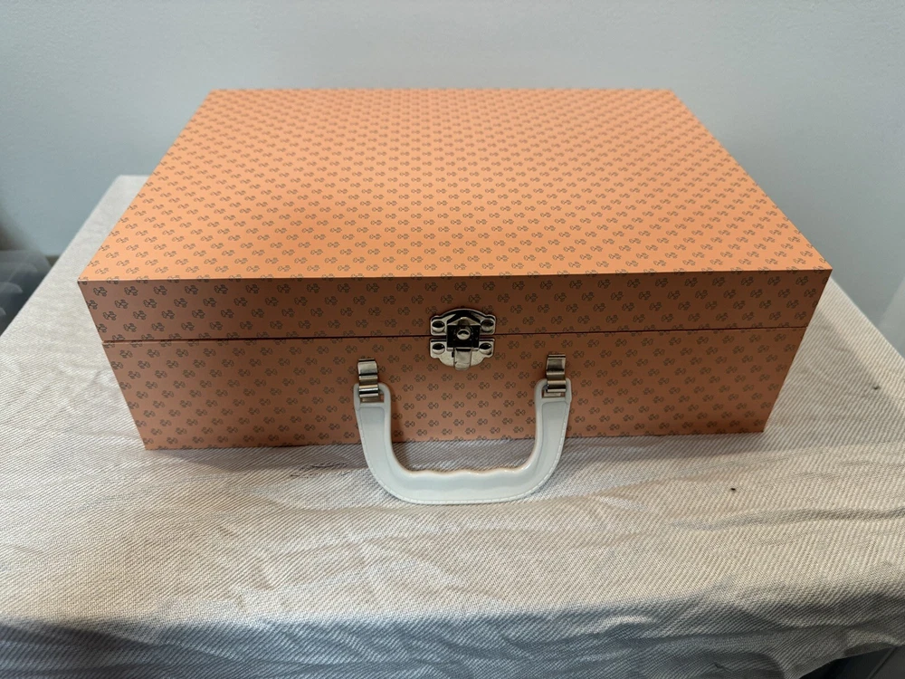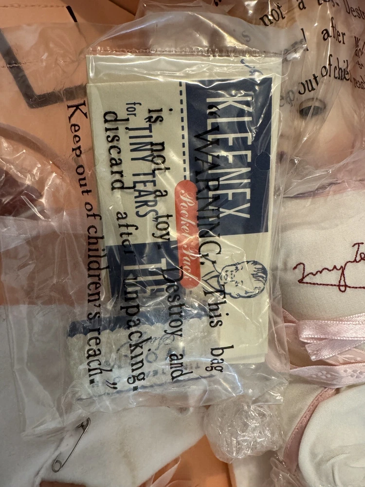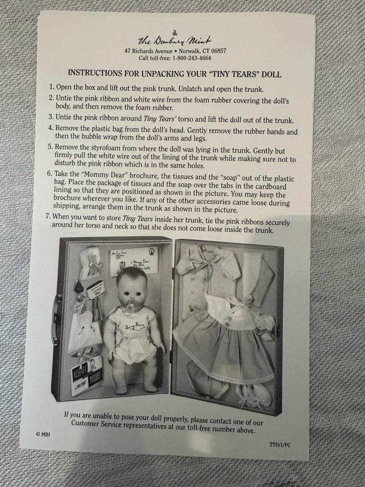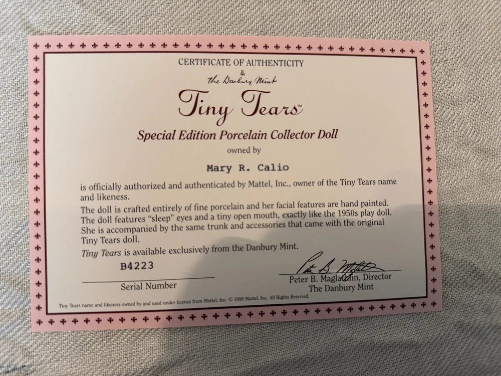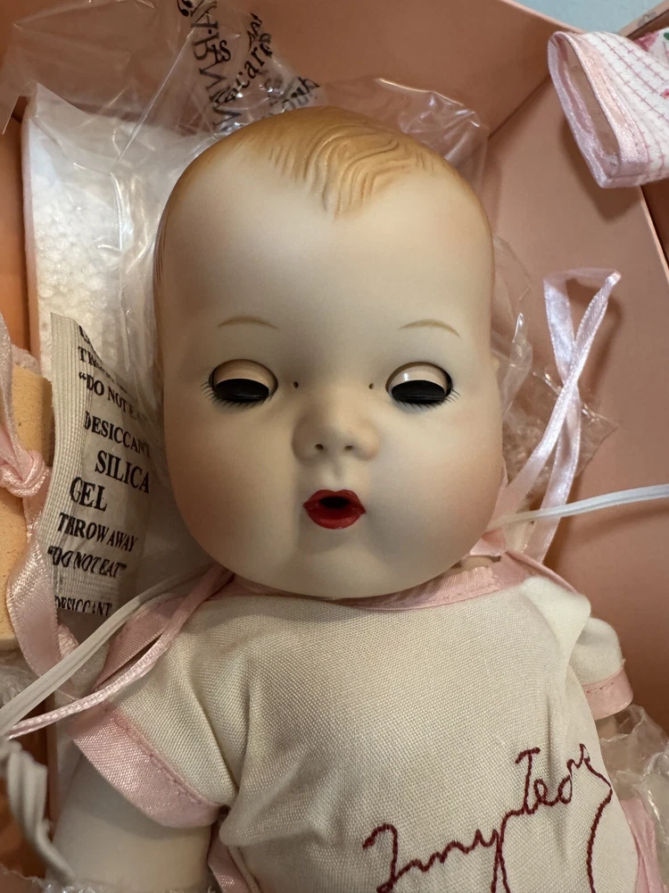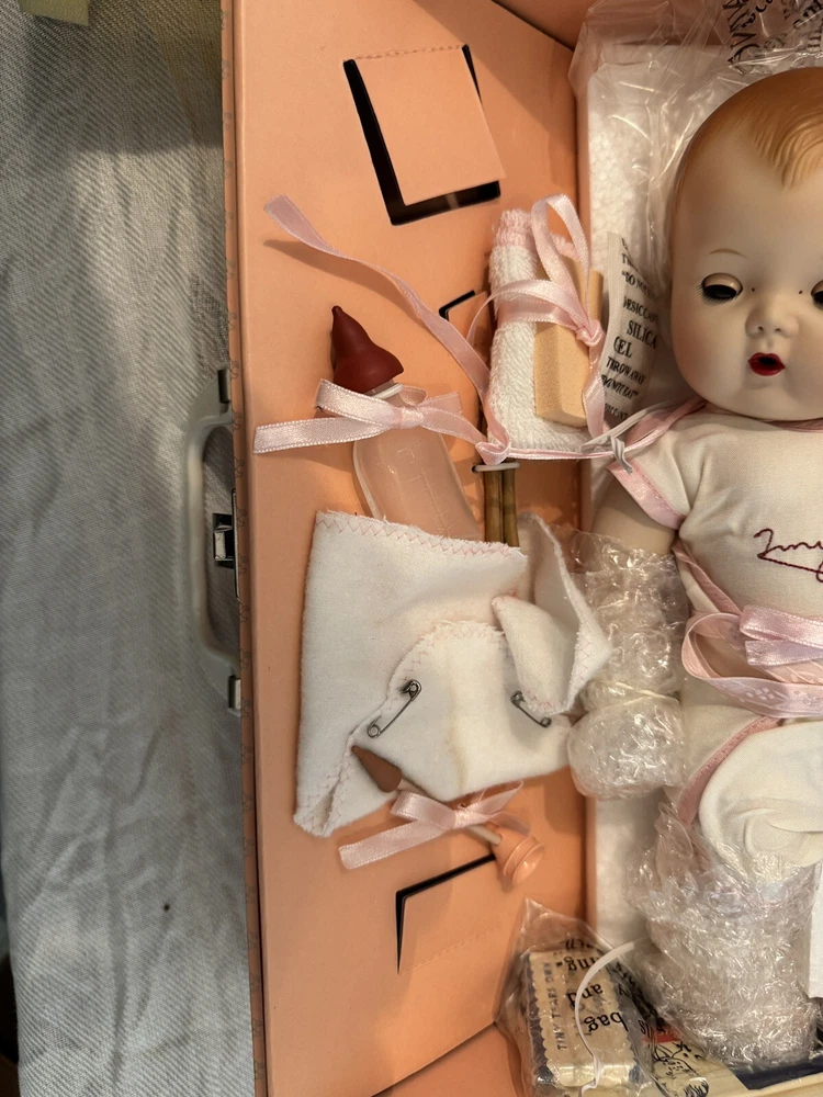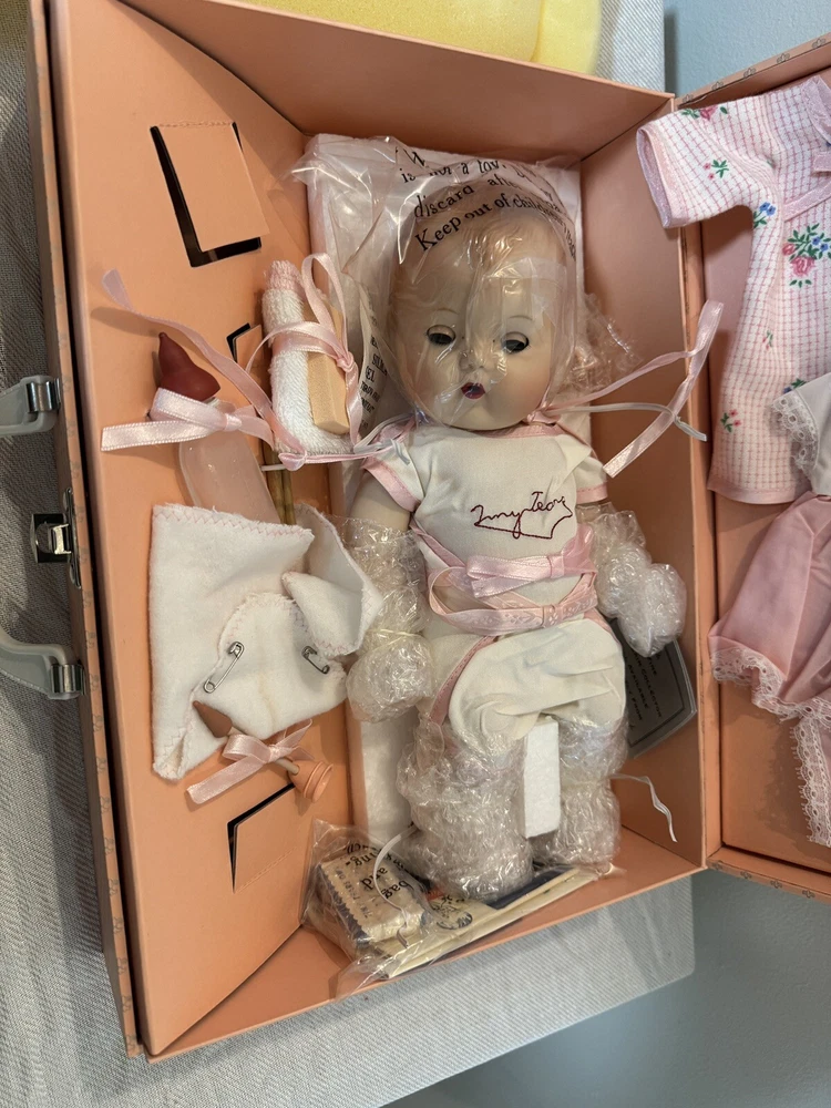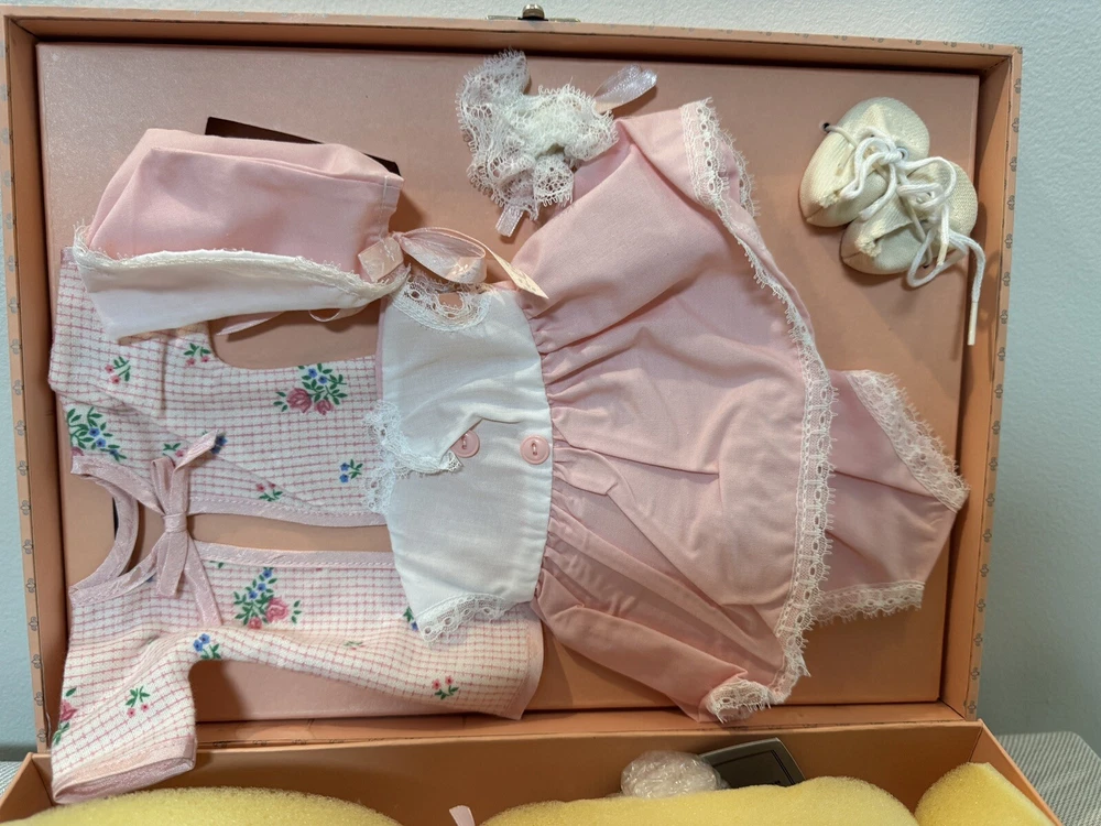 This beautiful Danbury Mint porcelain doll is a special edition. With its vintage charm and licensed reproduction status, it is a must-have for collectors. The doll has light brown hair and blue eyes, with a light complexion. It comes with a set that includes the trunk, doll itself, and many accessories including clothing. The doll comes dressed in a white and pink onesie, and has an additional pink and white dress and other clothes. The doll is made of high-quality porcelain material. It is a perfect addition to any doll collection or a great gift for someone who loves vintage dolls. This set is truly amazing for any doll collector! Certificate of Authenticity and other original paperwork included. Everything has never been removed from the box! PCL12