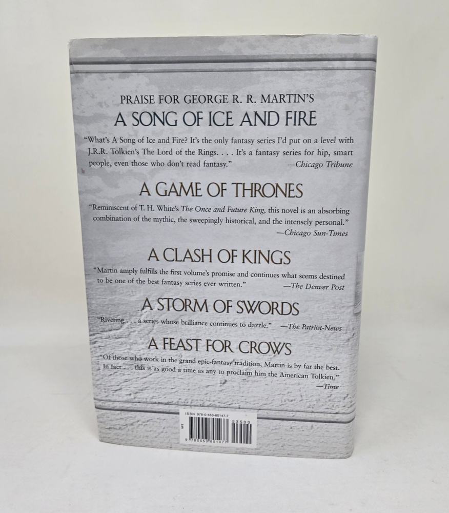 PRAISE FOR GEORGE R. R. MARTIN'S A SONG OF ICE AND FIRE "What's A Song of Ice and Fire? It's the only fantasy series I'd put on a level with J.R.R. Tolkien's The Lord of the Rings . . . . It's a fantasy series for hip, smart people, even those who don't read fantasy."-- Chicago Tribune A Game of Thrones "Reminiscent of T. H. White's The Once and Future King, this novel is an absorbing combination of the mythic, the sweepingly historical, and the intensely personal." --Chicago Sun-Times A Clash of Kings "Martin amply fulfills the first volume's promise and continues what seems destined to be one of the best fantasy series ever written."-- The Denver Post A Storm of Swords "Riveting . . . a series whose brilliance continues to dazzle."-- Patriot News A Feast for Crows "Of those who work in the grand epic-fantasy tradition, Martin is by far the best. In fact . . . this is as good a time as any to proclaim him the American Tolkien."-- Time, PRAISE FOR GEORGE R. R. MARTIN’S A SONG OF ICE AND FIRE “What’s A Song of Ice and Fire? It’s the only fantasy series I’d put on a level with J.R.R. Tolkien’s The Lord of the Rings . . . . It’s a fantasy series for hip, smart people, even those who don’t read fantasy.�- Chicago Tribune A Game of Thrones “Reminiscent of T. H. White’s The Once and Future King, this novel is an absorbing combination of the mythic, the sweepingly historical, and the intensely personal.� -Chicago Sun-Times A Clash of Kings “Martin amply fulfills the first volume’s promise and continues what seems destined to be one of the best fantasy series ever written.�- The Denver Post A Storm of Swords “Riveting . . . a series whose brilliance continues to dazzle.�- Patriot News A Feast for Crows “Of those who work in the grand epic-fantasy tradition, Martin is by far the best. In fact . . . this is as good a time as any to proclaim him the American Tolkien.�- Time, PRAISE FOR GEORGE R. R. MARTIN'S A SONG OF ICE AND FIRE "What's A Song of Ice and Fire? It's the only fantasy series I'd put on a level with J.R.R. Tolkien's The Lord of the Rings . . . . It's a fantasy series for hip, smart people, even those who don't read fantasy."- Chicago Tribune A Game of Thrones "Reminiscent of T. H. White's The Once and Future King, this novel is an absorbing combination of the mythic, the sweepingly historical, and the intensely personal." -Chicago Sun-Times A Clash of Kings "Martin amply fulfills the first volume's promise and continues what seems destined to be one of the best fantasy series ever written."- The Denver Post A Storm of Swords "Riveting . . . a series whose brilliance continues to dazzle."- Patriot News A Feast for Crows "Of those who work in the grand epic-fantasy tradition, Martin is by far the best. In fact . . . this is as good a time as any to proclaim him the American Tolkien."- Time From the Hardcover edition., "Epic fantasy as it should be written: passionate, compelling, convincingly detailed and thoroughly imagined." -- The Washington Post "Long live George Martin . . . a literary dervish, enthralled by complicated characters and vivid language, and bursting with the wild vision of the very best tale tellers." -- The New York Times "One of the best series in the history of fantasy." -- Los Angeles Times "Martin has produced--is producing, since the series isn't over--the great fantasy epic of our era . . . His skill as a crafter of narrative exceeds that of almost any literary novelist writing today." --Lev Grossman, Time "By turns thrilling, funny, scary, emotionally devastating, oddly inspirational, and just plain grand . . . Grade: A" -- Entertainment Weekly "A taut and relentless masterpiece that reaffirms the reader's obsession with the panoply of unforgettable characters that Martin has created, and the brutal, glittering, terrible world in which these novels are set . . . Machiavelli, you have met your match in Martin." -- The Daily Beast