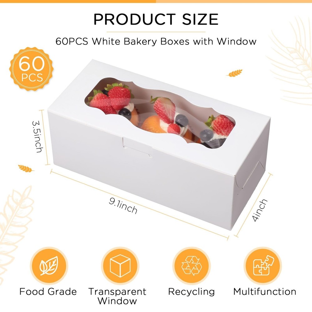 Dandat 60 Pack White Bakery Boxes with Window Large Cookie Box Treat Boxes Strawberries Chocolate Pies Donut Cakes Muffins Pastries Desserts for Wedding (9 x 4 x 3 Inch) Product Details Brand: Dandat Color: White Material: Cardboard Material Feature: Food Grade Product Dimensions: 9.84"L x 5.9"W x 2.16"H Product Dimensions : 9.84 x 5.9 x 2.16 inches; 5.03 Pounds Item model number : Dandat-YURD9098 Date First Available : May 14, 2023 Manufacturer : Dandat Best Sellers Rank: #77,556 in Industrial & Scientific (See Top 100 in Industrial & Scientific) #1,118 in Bakery Take Out Containers #1,118 in Bakery Take Out Containers Customer Reviews: 4.5 4.5 out of 5 stars (19) Package Includes: 60 pieces of bakery boxes for cookies, enough for your daily use or replacement; Patterned open window design makes it cute and stylish, suitable as gift boxes for family or friends for birthday, Valentine's Day, New Year, Thanksgiving and Christmas Optimal Size: each box measures 9 x 4 x 3 inches/ 23 x 10.2 x 8.8 cm, which provides ample space to store and display the baked goods; The optimal dimensions make it easier to handle and transport the boxes, while the clear windows offer high visibility to the contents inside; Manual measurement, please allow 1-2 cm errors on size Elegant Bakery Boxes for Any Occasion: these white colored boxes with clear windows are ideal for displaying your home-made baked treats at any event, whether it's a birthday party, wedding, holiday party, or baby shower; These versatile boxes can hold various baked goodies like cakes, pies, cookies, cupcakes, muffins, donuts, macarons, pastries, chocolates, strawberries and more Easy to Assemble: the boxes can be easily assembled at home, without the need for any additional tape or tools; The preset creases make it convenient for anyone to assemble the boxes manually; The easy-to-assemble feature saves time and effort while packaging your baked goods Features: Practical boxes: The white cookie boxes are useful supplies for packing gifts to your loved ones or customers without worrying about the cakes getting damaged during transit. Easy to deal with: These bakery pastry boxes will help you a lot in holding a party. They will support and display the delicious food, thus your guests are willing to eat them. After the party, you can directly throw away the boxes if they get dirty. Specifications: Material: white cardboard Color: white Size: 9 x 4 x 3 inches/ 23 x 10.2 x 8.8 cm Package includes: 60 x Cookie boxes with window Notes: Manual measurement, please allow slight errors on size. The color may exist a slight difference due to different screen displays.