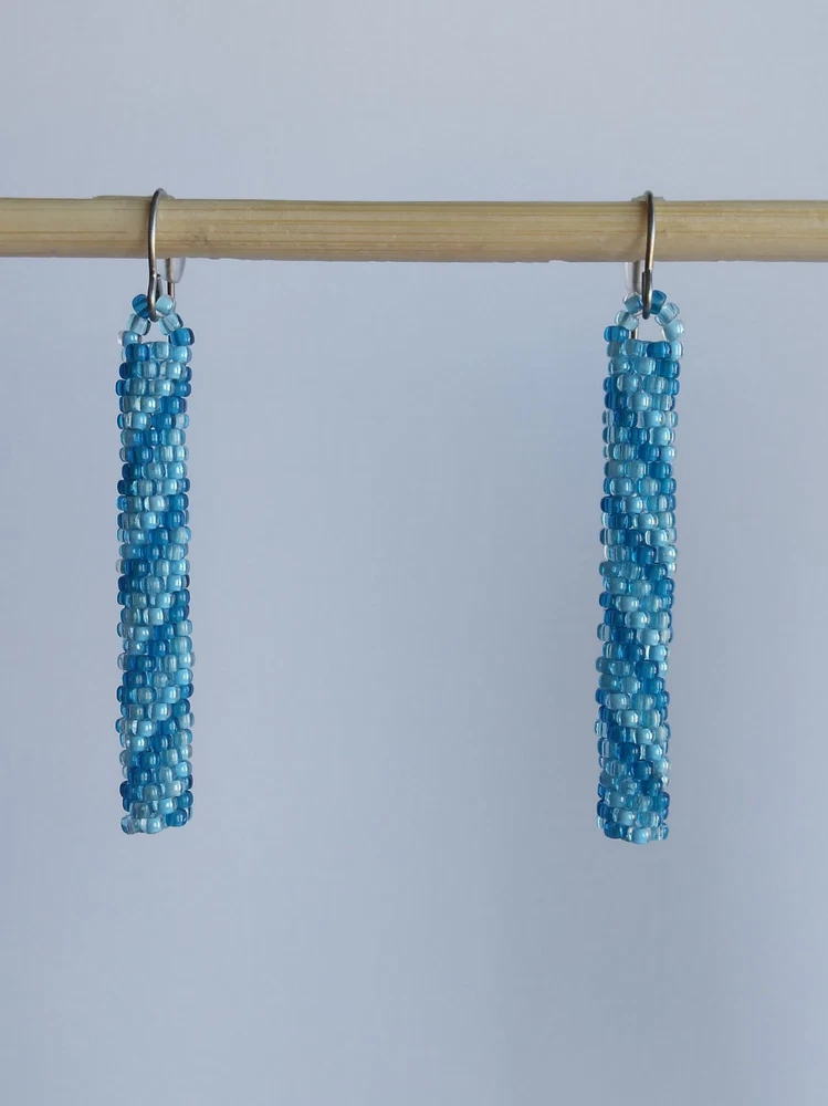 Made for any occasion such as birthdays, parties, graduations, weddings, holidays and casual or professional wear, These pairs of 57mm long, 6mm wide seed bead tube earrings are handmade using peyote stitch technique, with blue Miyuki glass seed beads arranged into a spiral design and light blue Nymo nylon thread. Earring Hooks are nickel and lead free, Pure titanium for sensitive skin hypoallergenic needs.