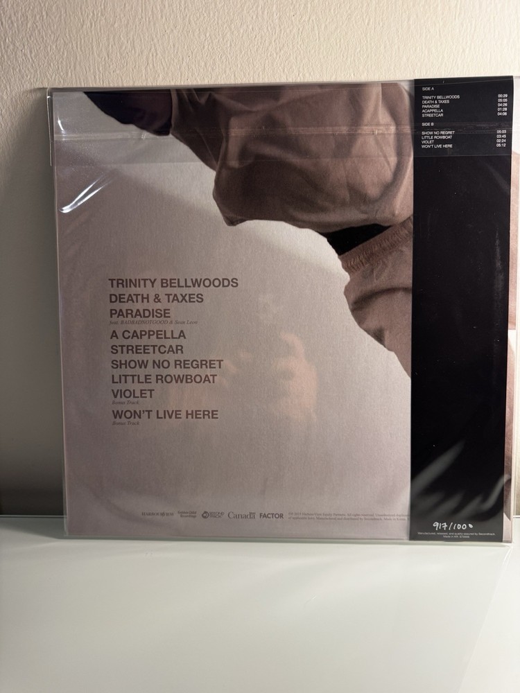 180 1LP Liquid Gold Gloss Laminated Tip-on Single Sleeve 2P Insert Limited to 1,000 A-1 Trinity Bellwoods A-2 Death & Taxes A-3 Paradise (feat. BADBADNOTGOOD) A-4 A Cappella A-5 Streetcar B-1 Show No Regret B-2 Little Rowboat B-3 Violet (Bonus Track) B-4 Won’t Live Here (Bonus Track)