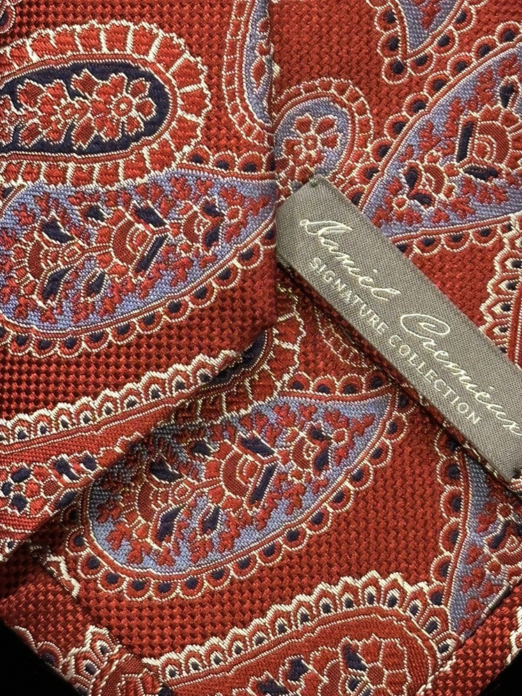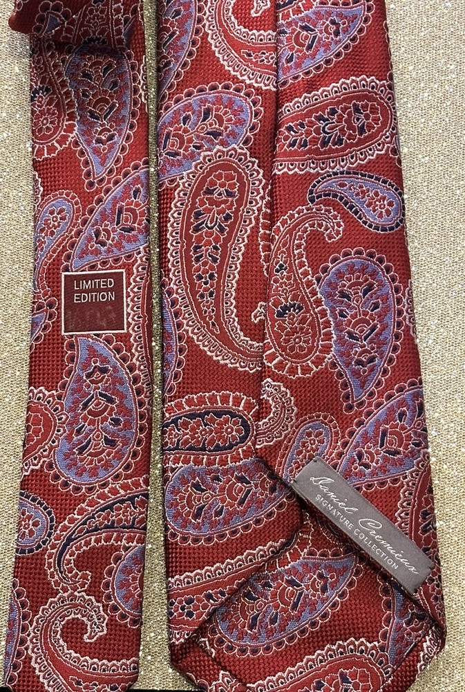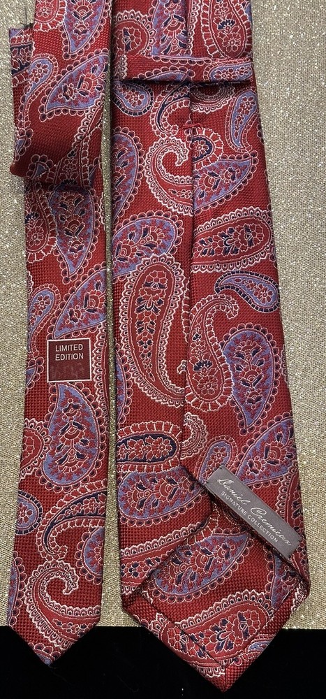 Elevate your style with this limited edition Daniel Cremieux Signature Collection bold red paisley silk tie. Made in Italy with 100% silk material, this tie features a classic 57-60 inch length and a 3-1/2 inch width, perfect for any occasion. The eye-catching paisley pattern adds a touch of sophistication to your outfit, while the durable silk fabric ensures long-lasting wear. This power tie is a must-have for any fashion-forward man's wardrobe. The attachment type is tied, and the style is designer. The tie is suitable for any department, and the theme is American classic. Don't miss out on the chance to add this exquisite piece to your collection.