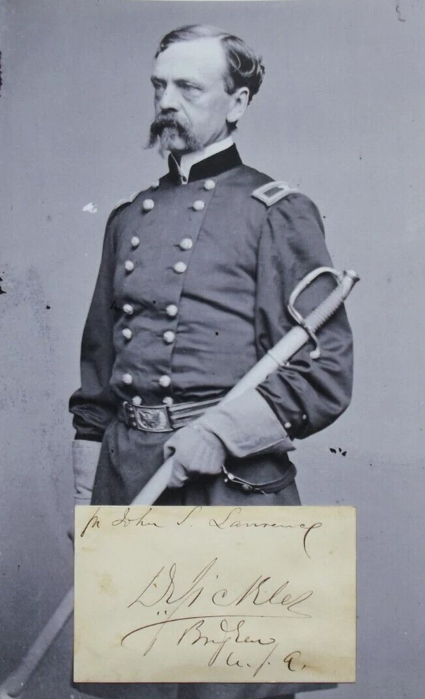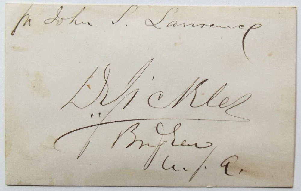 General Daniel Edgar Sickles [1819 1914] was an American politician, soldier and diplomat. Sickles was appointed as a Brigadier General at the opening of the American Cilil War and was later promoted to Major General. General Sickles commanded at the Peninsula Campaign, the Seven Days Battle, the Battle of Fredericksburg, and the Battle of Gettysburg. Listed for auction is the autograph of general Daniel Edgar Sickles signed on a card. The autograph is inscribed and signed '' D.E. Sickles Brig Genl U.S.A'' in black fountain pen. The card measures 3.25 x 2.25 inches, it has toning otherwise is in very good condition. The autograph is authentic and is a nice example of this prominent Union Army commander. Dear Collector, we are regularly adding autographed framed displays to our eBay Store. The following is a sample of our inventory, Harry Houdini, Marilyn Monroe, George Custer, Elvis Presley, U.S. Presidents John F. Kennedy, Harry S. Truman, Franklin D. Roosevelt, Theodore Roosevelt, James Garfield, James Monroe, Erwin Rommel, Robert Oppenheimer, Bela Lugosi, Boris Karloff, Ernest Hemingway, Abner Doubleday, Auguste Bartholdi, Buffalo Bill Cody, Walt Whitman, Charles Dickens, Margaret Mitchell, Thomas Edison, Charles Lindbergh, Amelia Earhart, Alexander Graham Bell, Laurel & Hardy, Charlie Chaplin, George Patton, Gutzon Borglum, Samuel F. B. Morse, Brigham Young, Wernher von Braun, Lon Chaney Jr, P.T. Barnum, Apollo Astronaut crews, and many more. Please have a look and feel free to contact us with any questions. Happy collecting from collectors.view Autographs. Authenticity/Return Policy/About Us. Dear collector, we are lifetime autograph collectors and an autograph dealer with over 20 years of autograph sales on eBay. We believe the purchase of an autograph is a monetary investment. Our policy is simple, all our autographs are researched and guaranteed authentic with ''No'' time limits. All sales will be accompanied with our Certificate of Authenticity, and we also offer a 30-day unconditional return policy, If the autograph or display you purchased is not as stated or is not to your expectation simply return and we will refund your full purchase price along with your return shipping costs. We are also a Top-Rated eBay seller with thousands of satisfied customers. We feel you should be comfortable with your purchase and our policy reflects this. United States and Overseas Shipping/Handling. Please Read.... Dear collector, shipping in the U.S is free unless otherwise noted in the auction description. Your auction will be well packed and shipped United States Postal Service 1st class with delivery tracking with the exception of larger framed items which will be shipped United States Priority Mail with signature confirmation. To our overseas customers shipping is as follows, your auction will be shipped through eBay's Global Shipping Program. Note, the limit for shipping an auction overseas is 2500.00 dollars, any auction above this price cannot be shipped. We do combine shipping on paper items [letters, photographs, album pages, etc.] purchased together. Also please note we do not have control over a package once it has shipped and import duties, taxes and custom charges are determined by the Global Shipping Program. Thank you for your purchase, your auctions will be well packed and shipped upon payment.