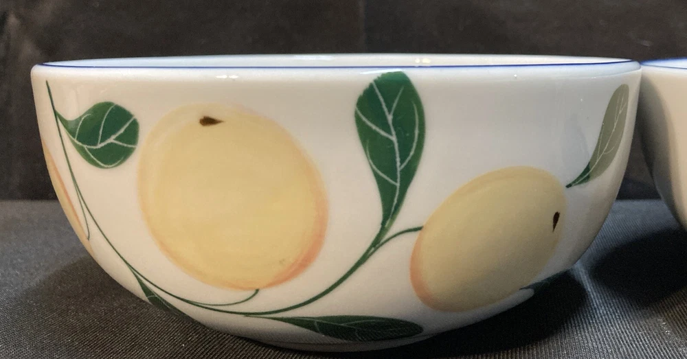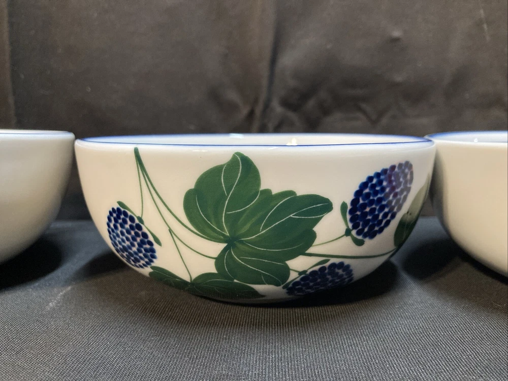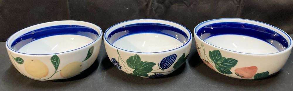 The set of 3 Dansk cereal bowls features a berries pattern: blackberry, strawberry, and peach. Each bowl has a diameter of 5.25 inches and a height of 2.25 inches. The set is pre-owned and comes in good, clean condition with no chips, cracks, or breaks. Please see pictures for details. If you have any questions or concerns, please do not hesitate to contact us. Check out our other items and message us if interested in more than one listing as combining items could save you money on shipping.