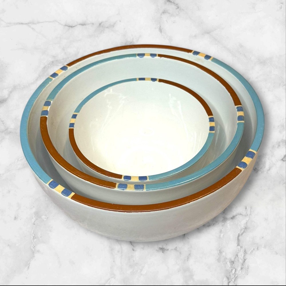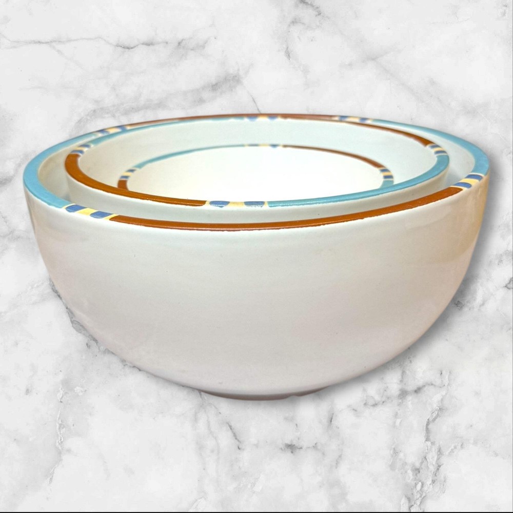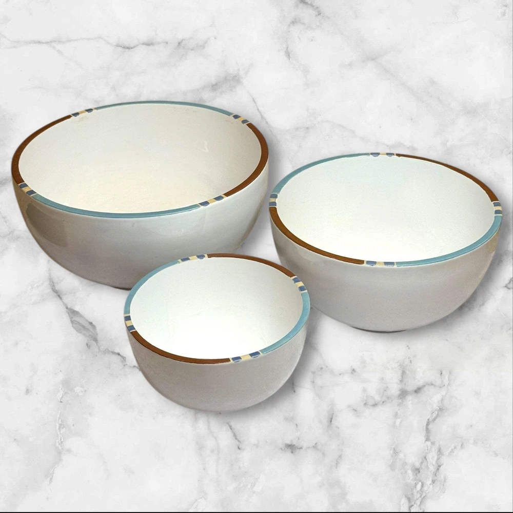 Dansk Mesa White Sand Portugal Mixing Bowl Set | Set of 3 | Great Condition This Dansk Mesa White Sand 3-piece mixing bowl set, made in Portugal, features the signature hand-painted rim in teal, blue, and terra cotta. These durable ceramic bowls nest perfectly for easy storage and work beautifully for baking, prep, serving, or display. A discontinued and highly collectible Dansk pattern. All three bowls are in great condition with minor utensil marks from gentle use.Product DetailsMaterial: Glazed ceramicRetail Price:• 6” Bowl – $59.99• 8” Bowl – $69.99• 10” Bowl – $69.99 (correct original retail)Sizes:• Small: 6 3/8” diameter × 3 3/8” height• Medium: 8 5/8” diameter × 4.5” height• Large: 10.25” diameter × 5 1/8” heightCollection: Dansk Mesa White Sand – Made in PortugalWhat’s Included: 3 mixing bowls (small, medium, large)Country of Origin: PortugalCondition: Great Condition – minor utensil marks from gentle use Dansk Mesa White Sand Portugal Mixing Bowl Set | Set of 3 | Great Condition This Dansk Mesa White Sand 3-piece mixing bowl set, made in Portugal, features the signature hand-painted rim in teal, blue, and terra cotta. These durable ceramic bowls nest perfectly for easy storage and work beautifully for baking, prep, serving, or display. A discontinued and highly collectible Dansk pattern. All three bowls are in great condition with minor utensil marks from gentle use. Product Details Material: Glazed ceramic Retail Price: • 6” Bowl – $59.99 • 8” Bowl – $69.99 • 10” Bowl – $69.99 (correct original retail) Sizes: • Small: 6 3/8” diameter × 3 3/8” height • Medium: 8 5/8” diameter × 4.5” height • Large: 10.25” diameter × 5 1/8” height Collection: Dansk Mesa White Sand – Made in Portugal What’s Included: 3 mixing bowls (small, medium, large) Country of Origin: Portugal Condition: Great Condition – minor utensil marks from gentle use × × × × × × × × × × × × × × × × × Buy now and save! Shipping info Click the Shipping & Payments tab above the listing description for more info Click the Shipping & Payments tab above the listing description for more info! Additional delivery notes PICK UP OPTION Sorry, our items are NOT available for pick-up. PAYMENT Immediate payment is required upon selecting "Buy It Now" or upon checking out through the cart. We accept payment via U.S. PayPal accounts and all Major Credit Cards, Debit Cards & Google Pay. We are legally required to collect sales tax in those states and localities where we maintain a physical presence (nexus). The applicable amount of sales tax charged to an order will be calculated based on the shipment destination's state and local sales tax laws. Thank you for shopping with us on eBay! Additional Information No additional information at this time Ask seller a question You might also like Egg Wooden Serving Board - Threshold Houdini Winged Corkscrew Flex Strainer Sink Strainer & Stopper 2-N-1 Fits Most 3.5” Drains & Disposals, C Pyrex Verde Divided Dish | 1.5 Quart Contact To contact our Customer Service Team, simply click the button here and our Customer Service team will be happy to assist. Ask seller a question © Kitchen Switchen Shipping & Payments Click the Shipping & Payments tab above the listing description for more info Payment Accepted Payment Methods Immediate payment is required upon selecting "Buy It Now" or upon checking out through the cart. We accept payment via U.S. PayPal accounts and all Major Credit Cards, Debit Cards & Google Pay. We are legally required to collect sales tax in those states and localities where we maintain a physical presence (nexus). The applicable amount of sales tax charged to an order will be calculated based on the shipment destination's state and local sales tax laws. Thank you for shopping with us on eBay! Returns Returns are accepted Items must be returned within 30 days of the auction ending Buyer will pay for return shipping. eBay integration by