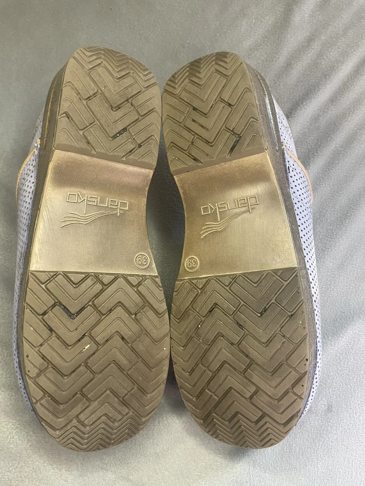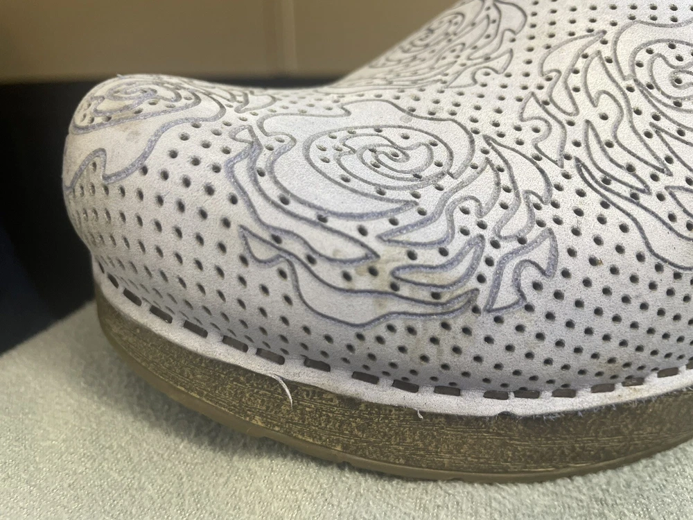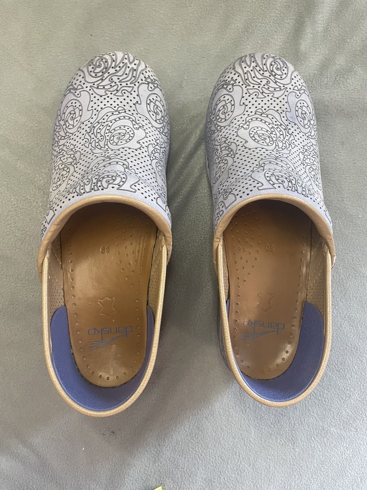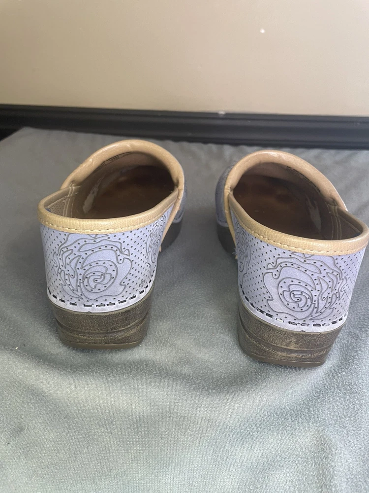 Dansko clogs are perfect for women who want both style and comfort. These blue suede clogs feature a round toe shape, slip-on closure, and a mid-height rocker heel style. The shoes are cushioned and have a comfortable feel, making them suitable for casual and workwear occasions. The clogs are perforated with a floral pattern, which adds a touch of bohemian and classic style to them. These shoes are handmade in China and are available in a standard shoe width. They are perfect for walking and are available in all seasons, including winter, summer, fall, and spring. The lining material is leather, and the upper material is also leather. These shoes are a great addition to any wardrobe and are perfect for those who want a comfortable and stylish pair of shoes.