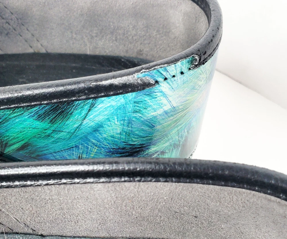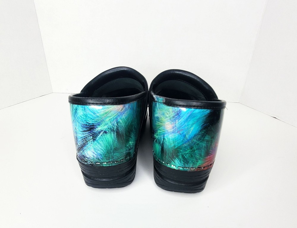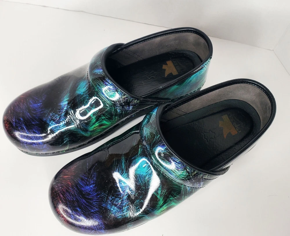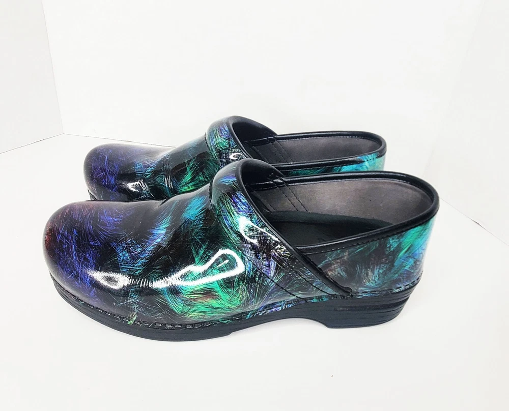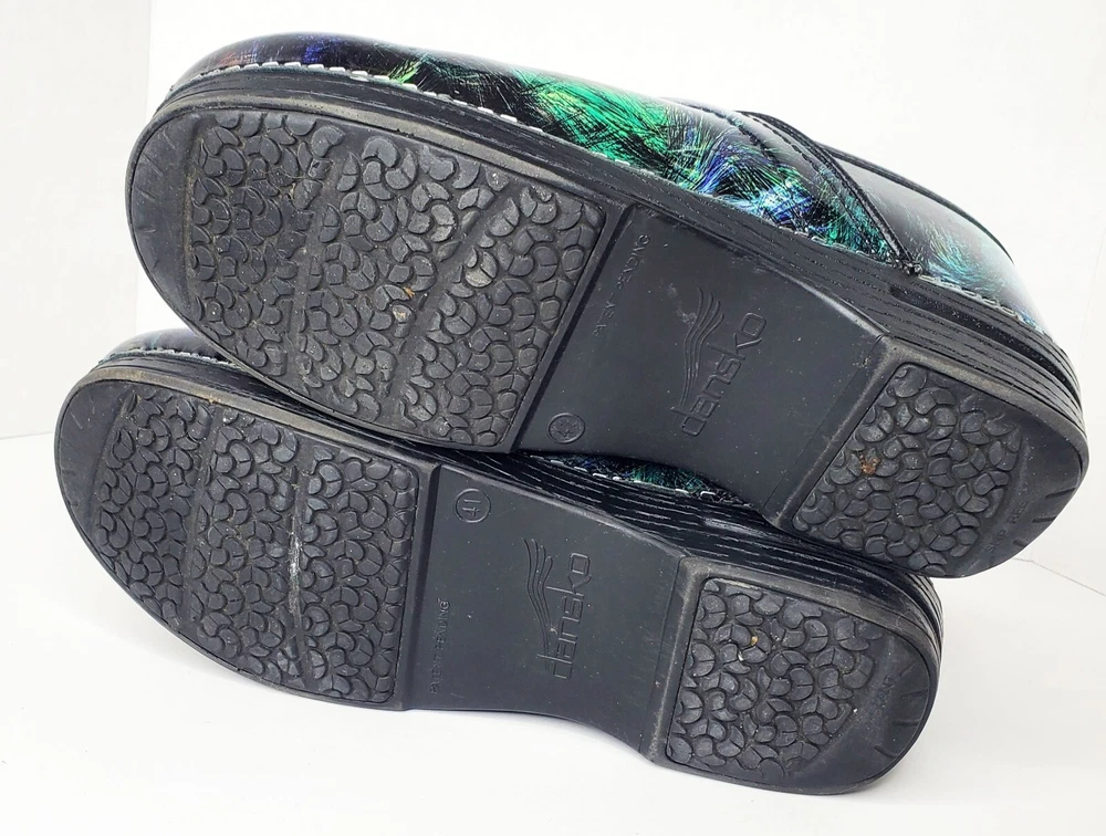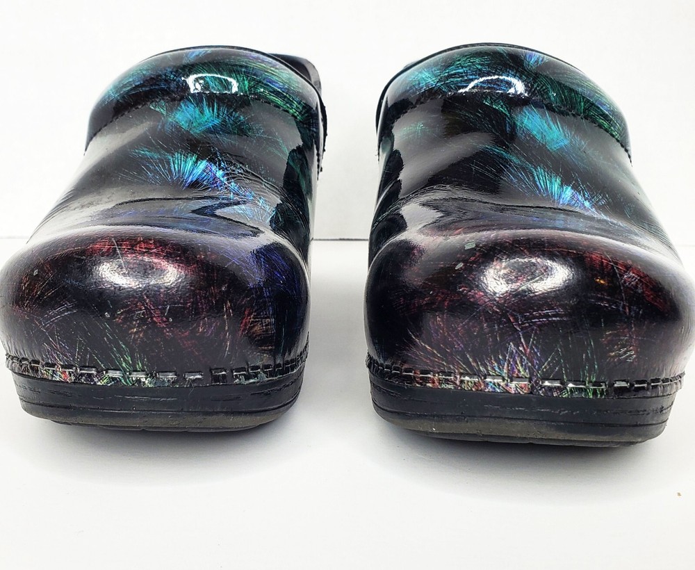 Dansko Patent Leather Multicolored Slip On Clog Comfort Nurse Shoes 41 US 10.5 Does have some wear. Please see photos. These shoes still have a lot of life left in them Slip Resistant Length heel to toe; 11 inches Width at wides part; 3.5 inches Heel height: 1.5 inches 19-3279