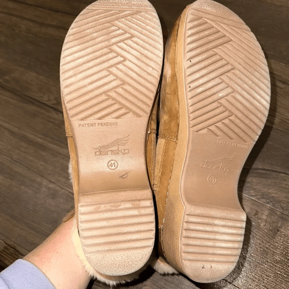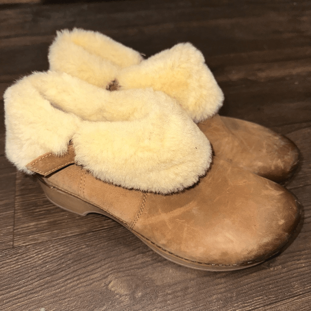 Dansko ortho, comfortable, Sherpa lined, distressed, tan, slip on, European clogs. In good, gently used condition. From a pet and smoke free house.