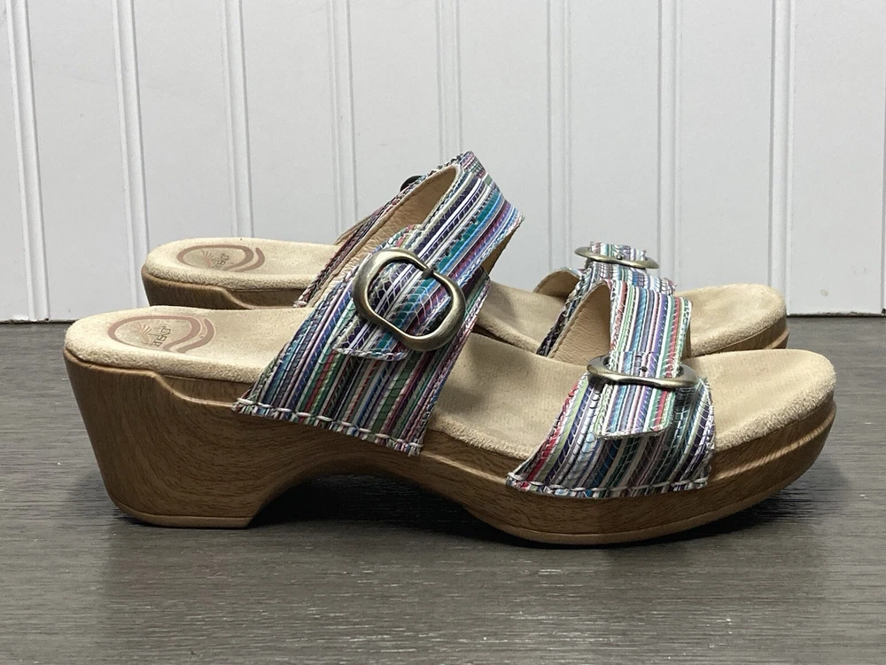 These Dansko Sophie sandals are perfect for the woman who loves both comfort and style. They are slip-on with adjustable buckle straps for closure and the perfect fit. Made of leather and featured in a multicolor striped pattern with a faux wood exterior. They are suitable for travel and casual wear. Available in a women’s EU size 39. They are in great condition with no damage. Add these stylish sandals to your shoe collection today! FAST SHIPPING!!