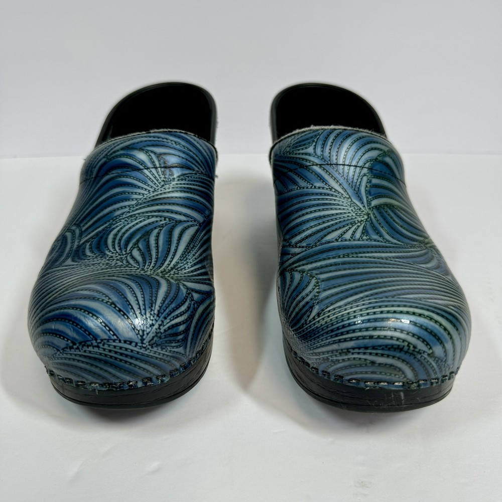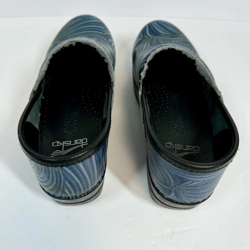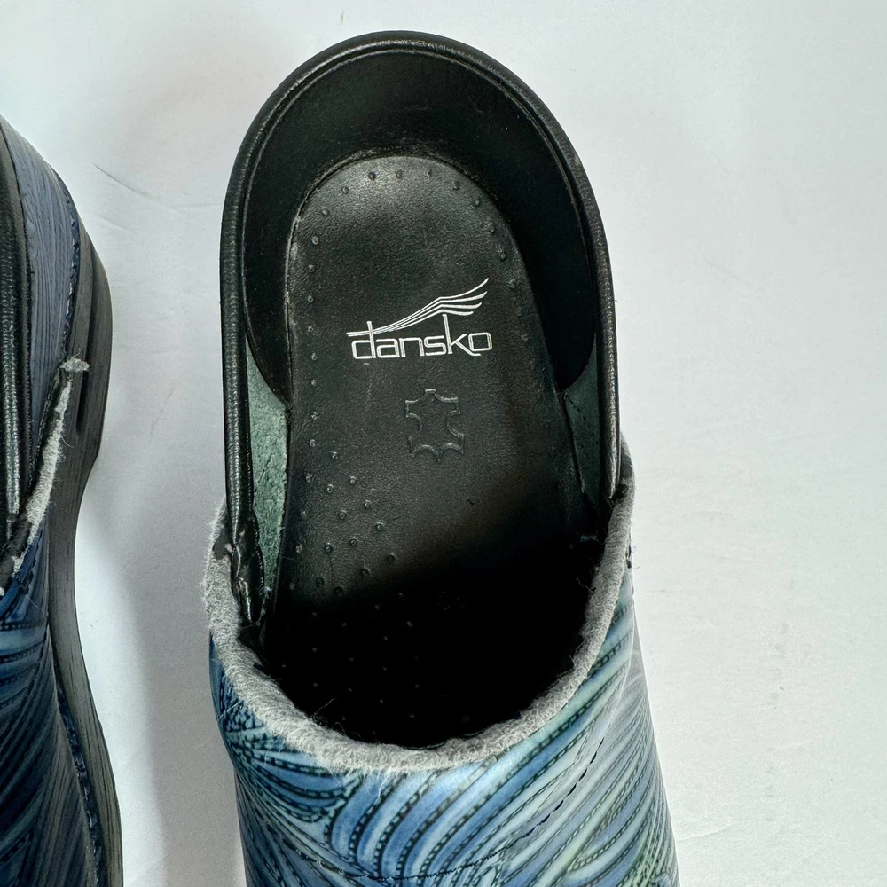 Experience ultimate comfort and style with these Dansko clog shoes featuring a beautiful blue swirl pattern. These shoes are perfect for women who love walking and want a pair of shoes that provide arch support and comfort. The slip-on design makes them easy to wear, while the rubber outsole ensures durability and stability. Crafted from high-quality leather, these clogs are designed to last and are perfect for travel, workwear, or casual occasions. The round toe shape and standard width make them a great fit for most women. These shoes are perfect for those who love classic and vintage designs, with a touch of modernity.