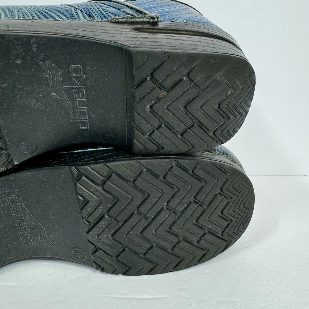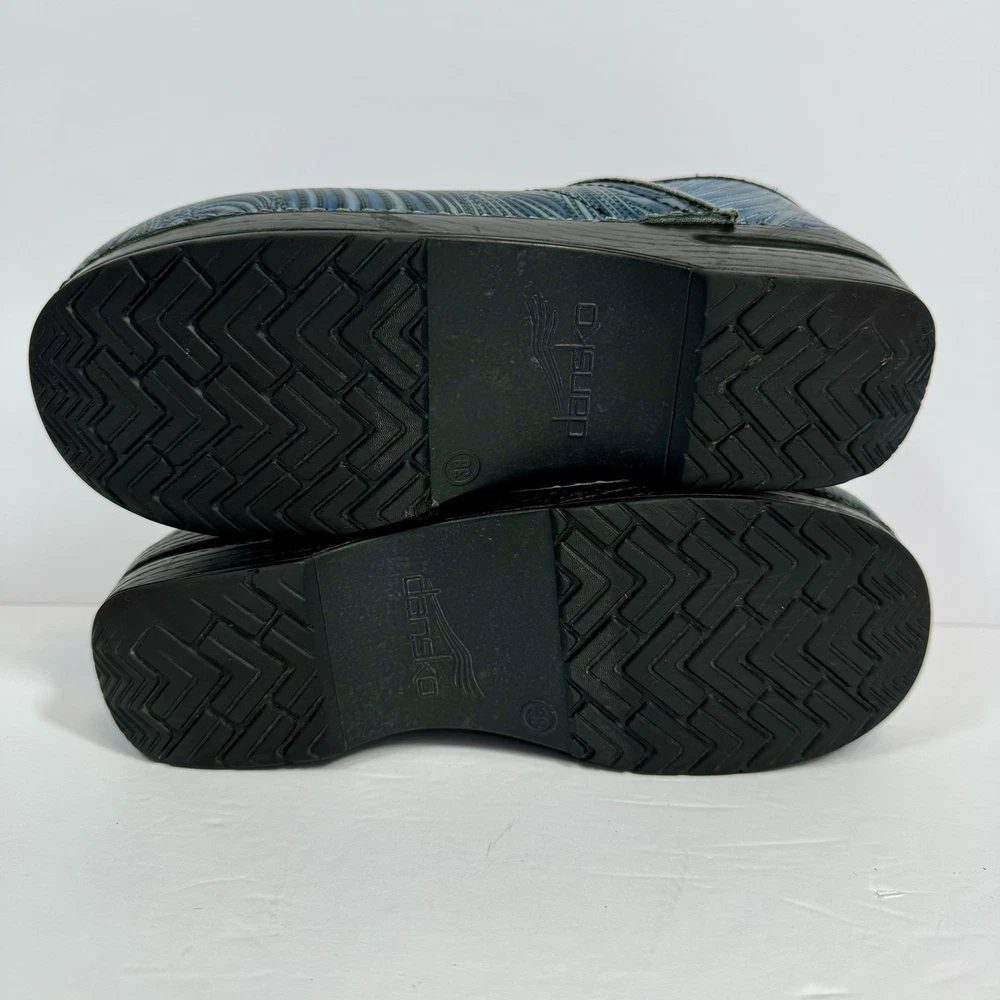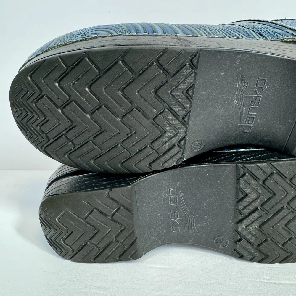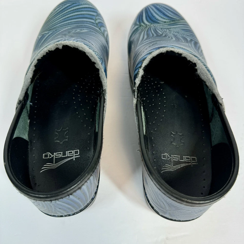 Experience ultimate comfort and style with these Dansko clog shoes featuring a beautiful blue swirl pattern. These shoes are perfect for women who love walking and want a pair of shoes that provide arch support and comfort. The slip-on design makes them easy to wear, while the rubber outsole ensures durability and stability. Crafted from high-quality leather, these clogs are designed to last and are perfect for travel, workwear, or casual occasions. The round toe shape and standard width make them a great fit for most women. These shoes are perfect for those who love classic and vintage designs, with a touch of modernity.