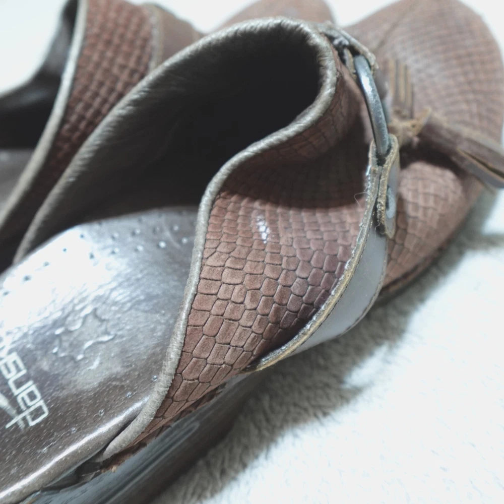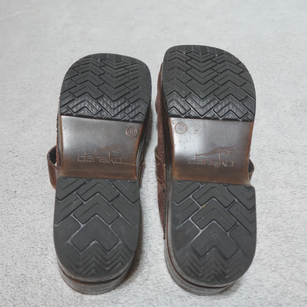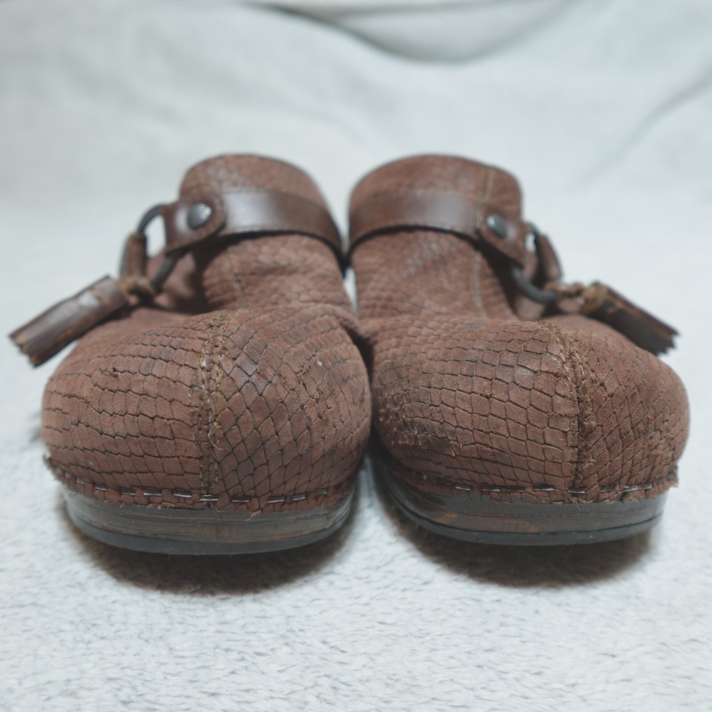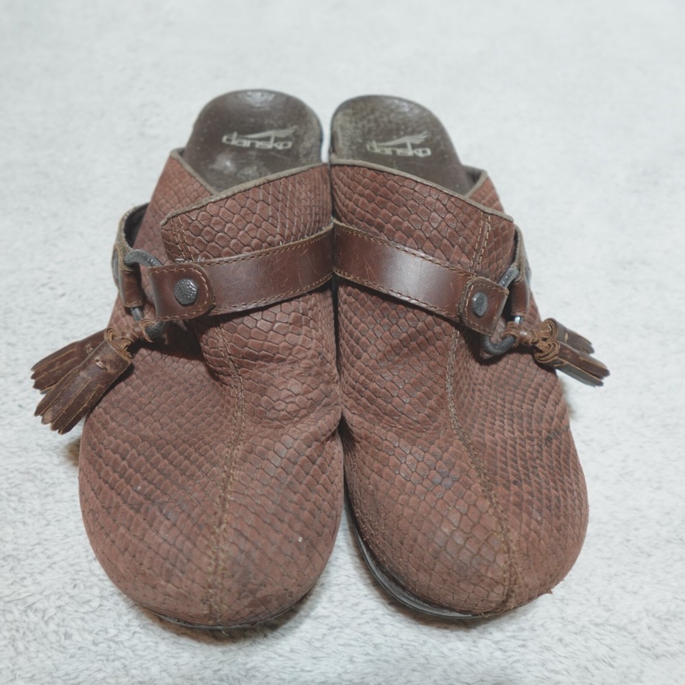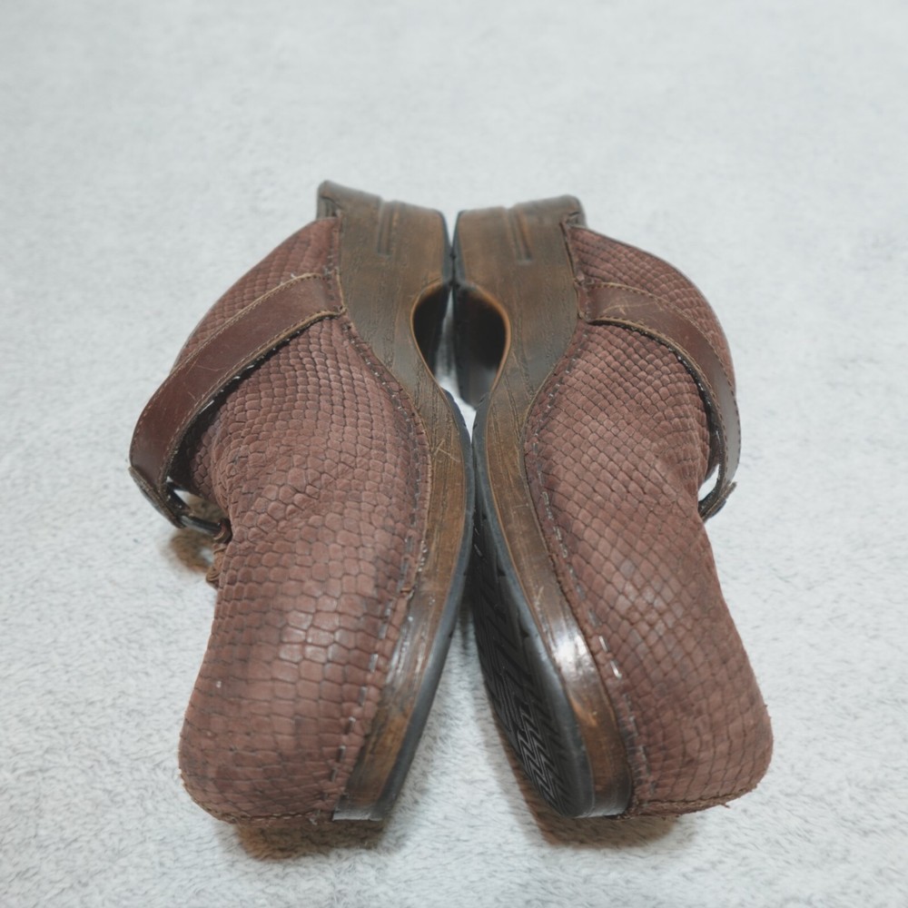 Dansko Clogs Shoe Womens EU 40 US 9.5 Shandi Brown Leather Snake Print 174807878. Good condition, no stains or tears, one minor white scuff on the outside edge of the right shoe as pictured, minimal wear noted on the soles/bottoms, please review all photos. If we missed something, don’t worry, we offer free returns. Just indicate, “just didn’t like it,” for any reason, and we’ll pay for the return. Thanks for visiting!