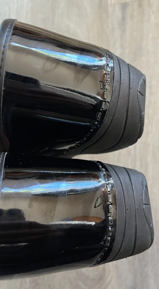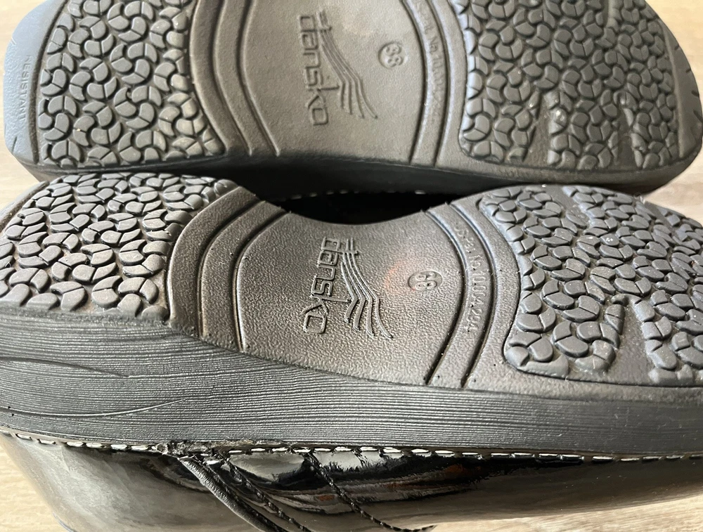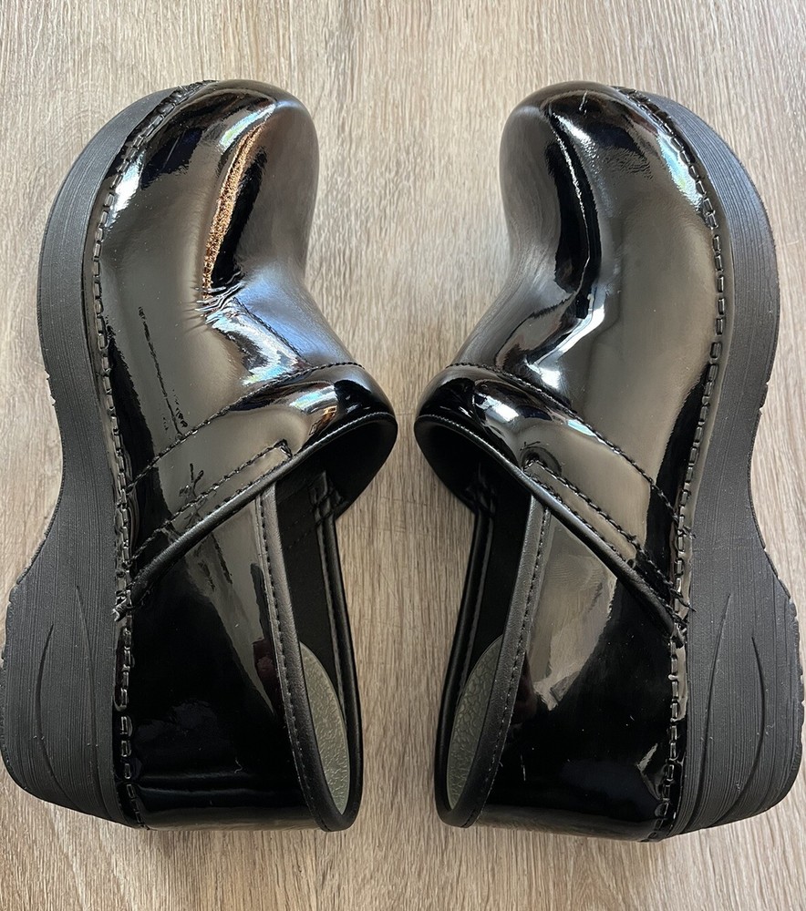 The Dansko XP 2.0 Patent Leather Clogs in black are designed for women in size EU 38/US 7.5. These slip-resistant clogs feature a round toe, mid heel height, and comfortable block heel style. They are ideal for casual or workwear occasions, with a classic style and logo accents. Made with patent leather upper material, leather lining, and rubber outsole, these clogs provide both style and functionality for walking activities. Perfect for all seasons, these Dansko Professional clogs offer a standard shoe width and are a timeless addition to any wardrobe. Awesome shoe. Like new!!!!! Comfortable!!!