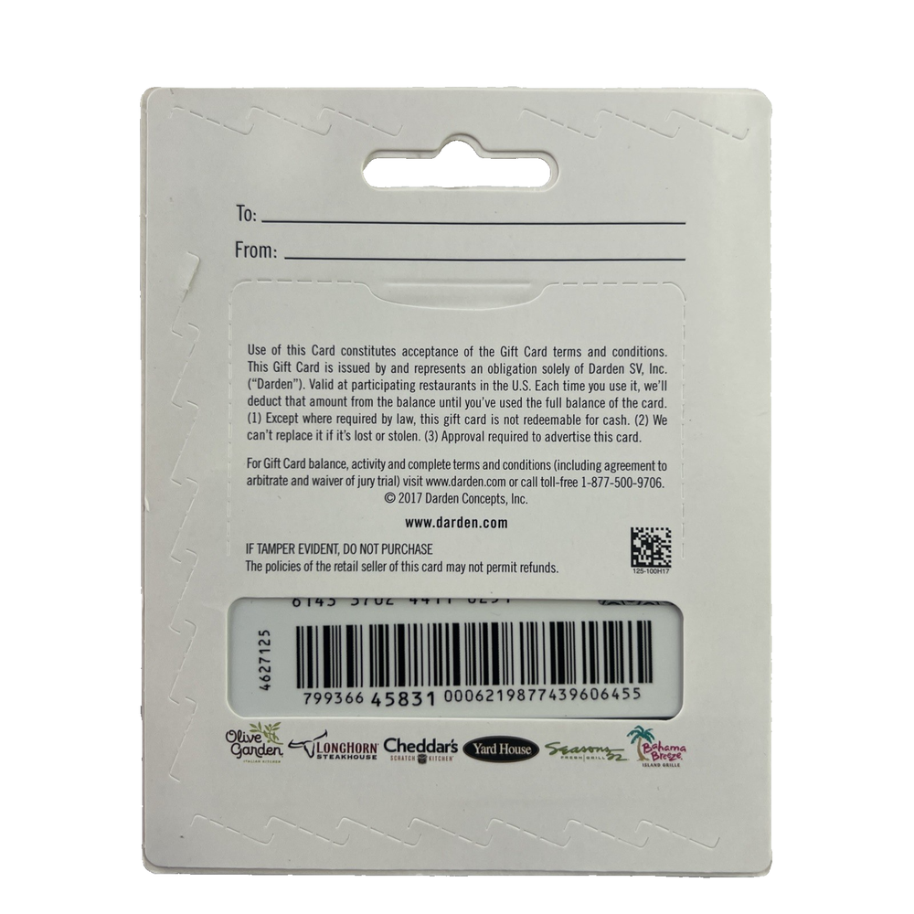 Darden Gift Card $25-$100 Physical – Olive Garden LongHorn Cheddar’s – No Expiration – Fast Ship Treat yourself or someone special to a delicious meal! This Darden Restaurants physical gift card can be used at Olive Garden, LongHorn Steakhouse, and Cheddar’s Scratch Kitchen. Choose any amount between $25 and $100. No expiration date. Not reloadable. Enjoy great dining experiences across the U.S. 🍽️ Valid at Olive Garden, LongHorn Steakhouse, Cheddar’s Scratch Kitchen Choose your preferred amount ($25–$100) No expiration date – use anytime Great for dining, celebrations, and gifts Fast shipping – physical card delivered to you