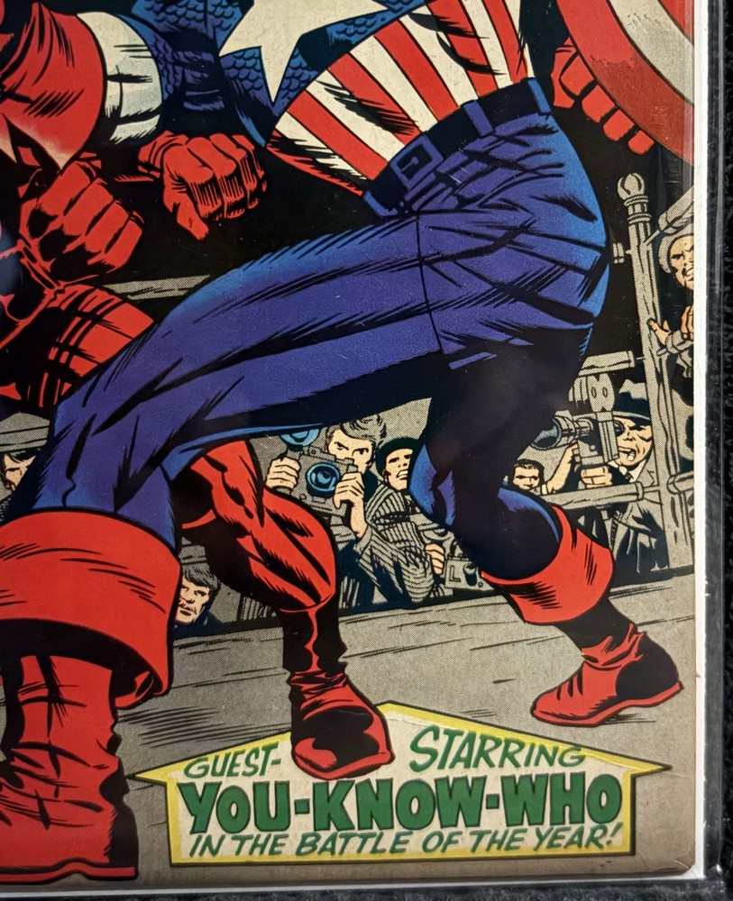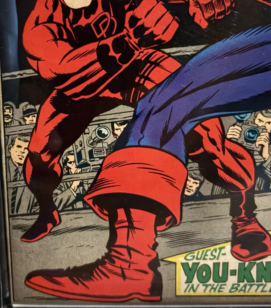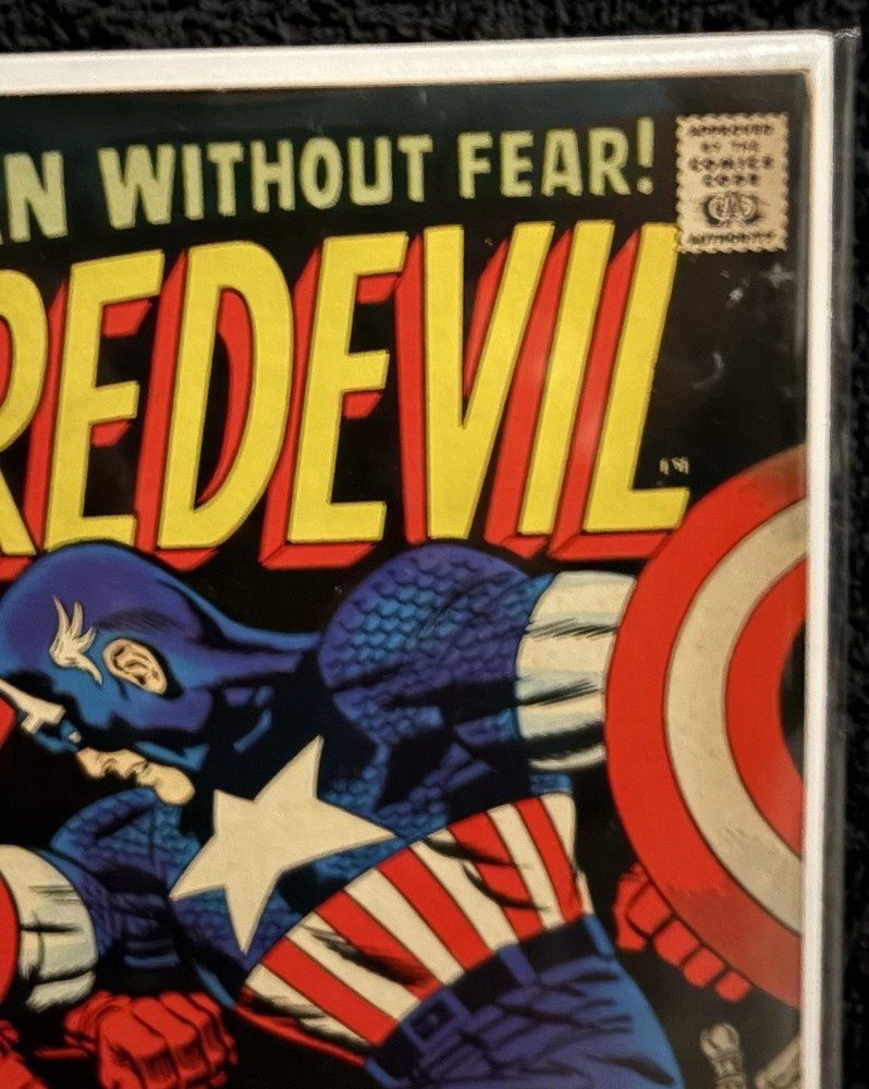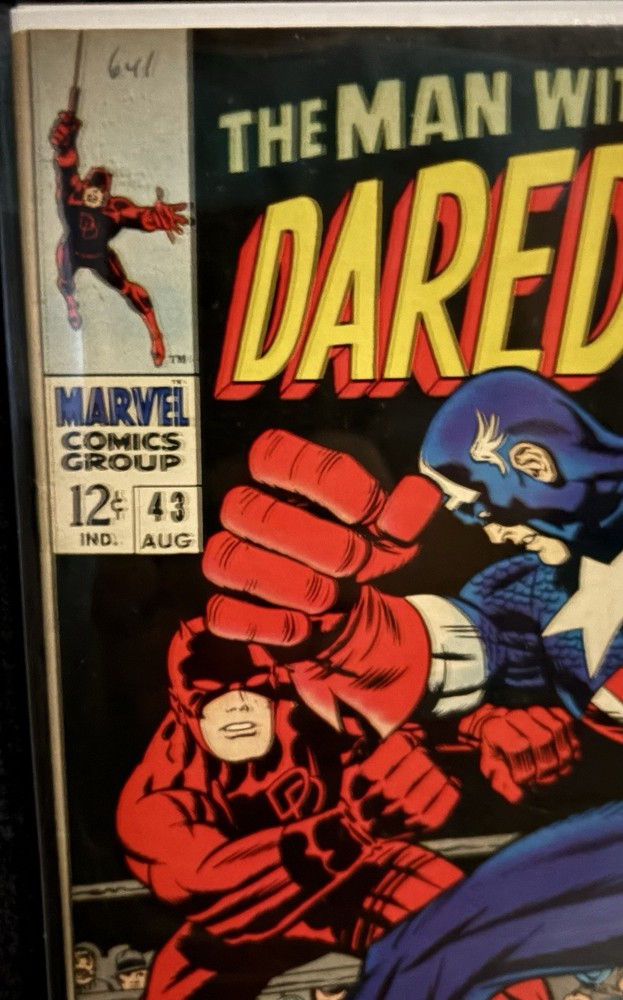 The product is a vintage comic book, Daredevil #43 from 1968, featuring the key issue of the first battle between Daredevil and Captain America. This issue, part of the Silver Age era, was written by Stan Lee, Gene Colan, Vince Colletta, and Jack Kirby, with art by Jack Kirby. The story, titled "In Combat With Captain America!", includes characters like Karen Page, Captain America, The Jester, Daredevil, and Foggy Nelson in an action-packed superhero adventure. This single issue comic book from Marvel Comics is a must-have for fans of US Comics and MCU universe.