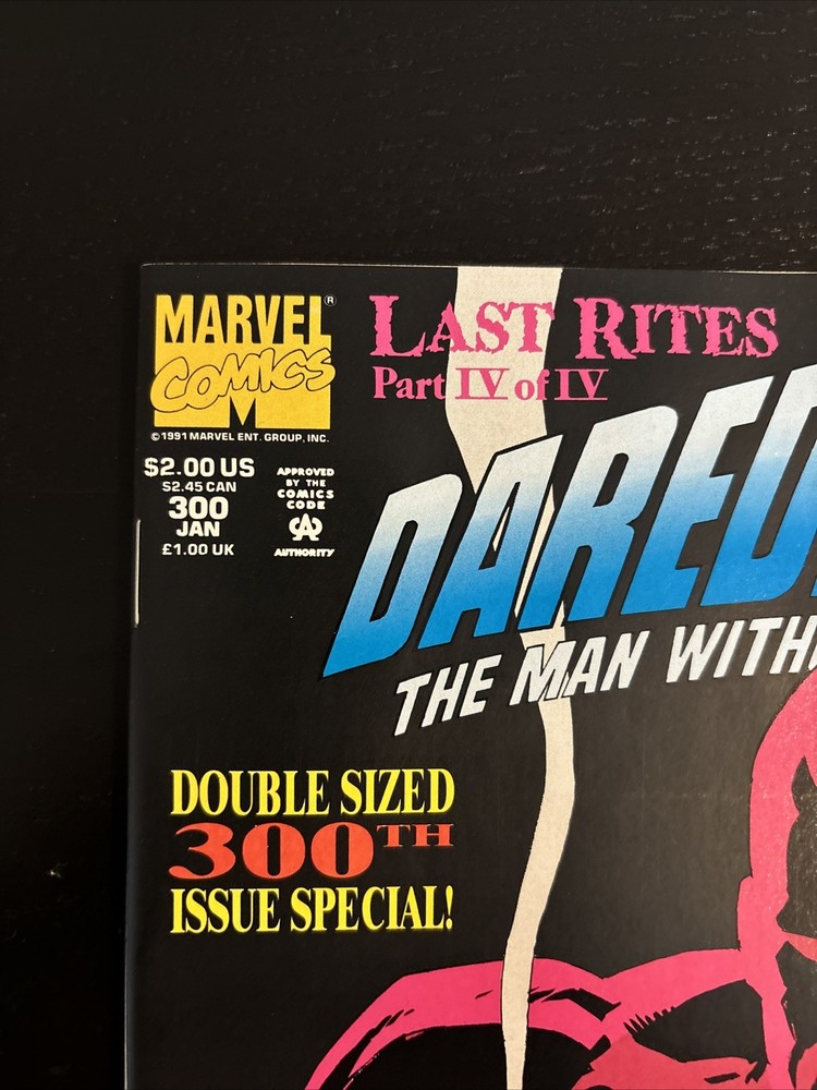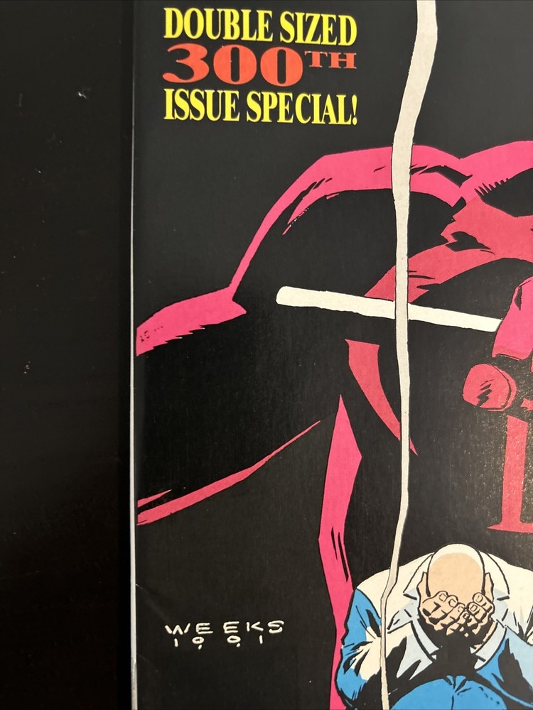 The product is a vintage Marvel Comics book titled Daredevil The man without fear #300. This single issue is part of the modern age era, published in 1992. It features the superhero team Defenders and is written in English. The cover artist is Lee Weeks and the comic is first printing, boarded, and comes with a dust jacket. This collectible comic is intended for a general audience and is a part of the Marvel Universe.