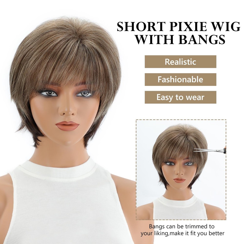 Color Brown mixed Blonde Material Synthetic Fiber Hair Type Straight Style Classic Special Feature Heat Resistant About this item Color: Dark brown mixed creamy white or blonde(As the photo color) , The color of the short wig will match your complexion color, make you more beautiful and sexy.Due to the differences in manual machine production, shooting lighting, display and personal understanding, the color and details may be slightly different, please understand, we will try our best to improve Material: This short blonde mixed brown wig adopt the top quality heat resistant synthetic fiber, which is very suitable for long term use, looks natural and fashion Wig Cap Size: Average 22.5'', there are two adjustment straps inside the blonde bob cut wig, which can be intertwined to a fixed position to suit most head sizes Design: Very stylish design with natural pretty looking and soft touch. You can wear this pixie cut wig to parties or daily use SEVENCOLORS wig is a registered Brand,We have 10 years of experience in wig manufacturing,and offer high quality and affordable wigs.If you have any question about this short natural hair wig,please tell ue in time,we will try our best to reply to you ASAP.Warm-tip:Due to the long-term transportation,when you receive the product,it may not be exactly the same as the picture.This requires you to take care of it a bit.You can also modify it according to your desired hairstyle.