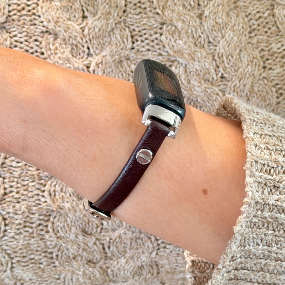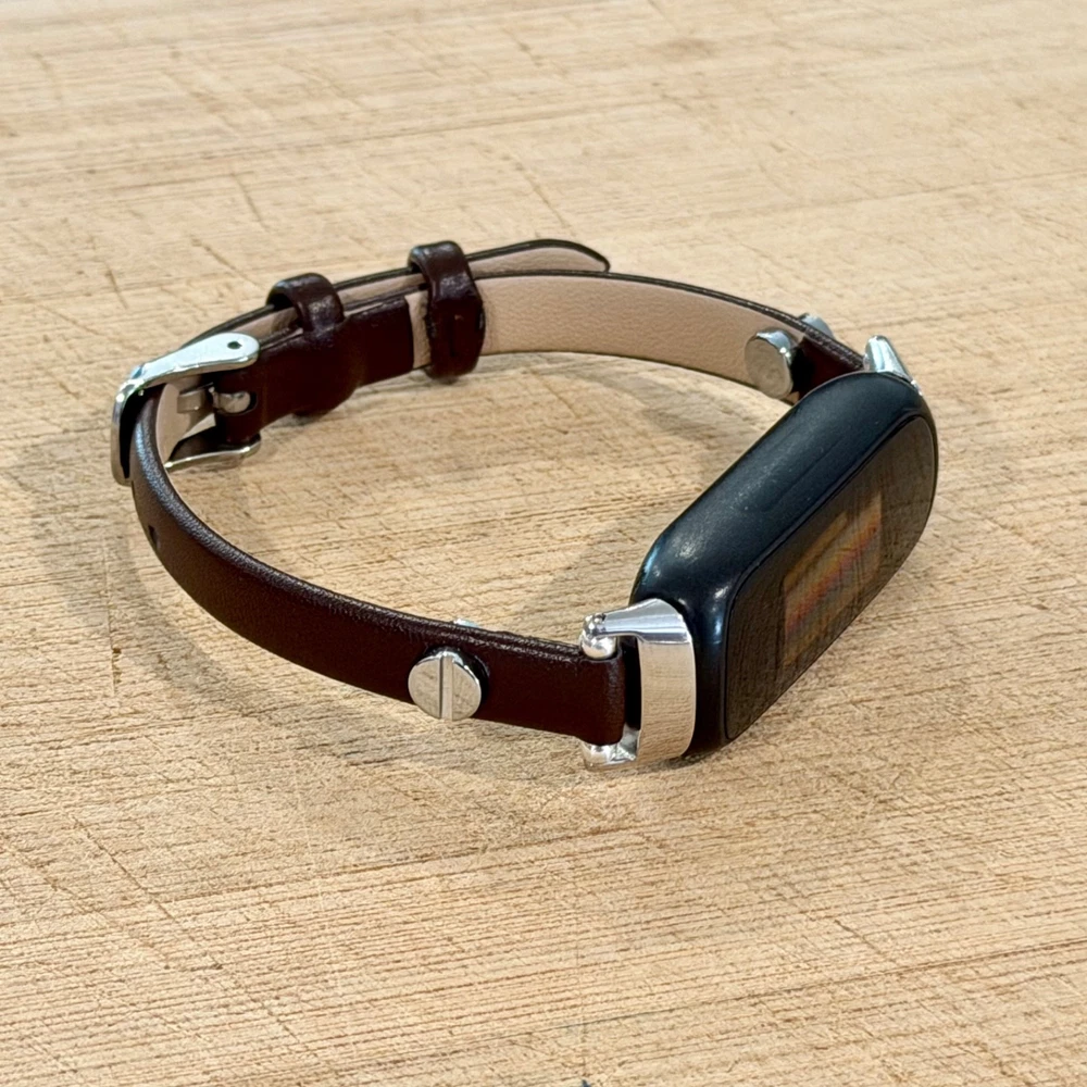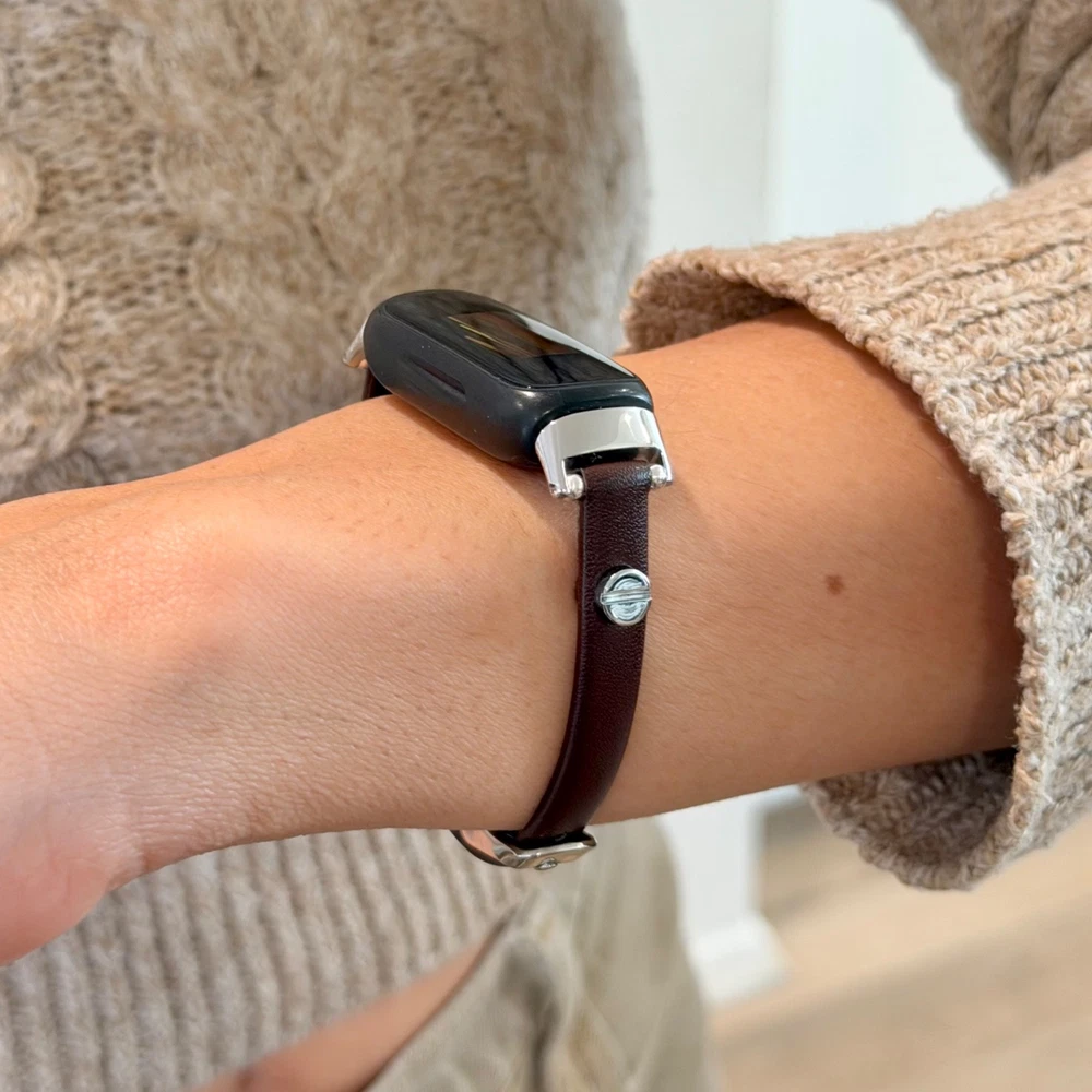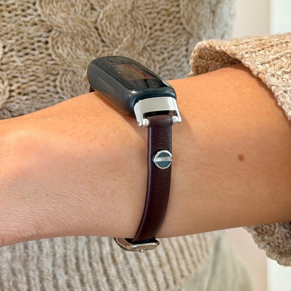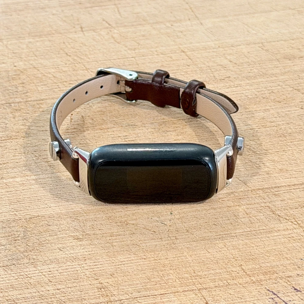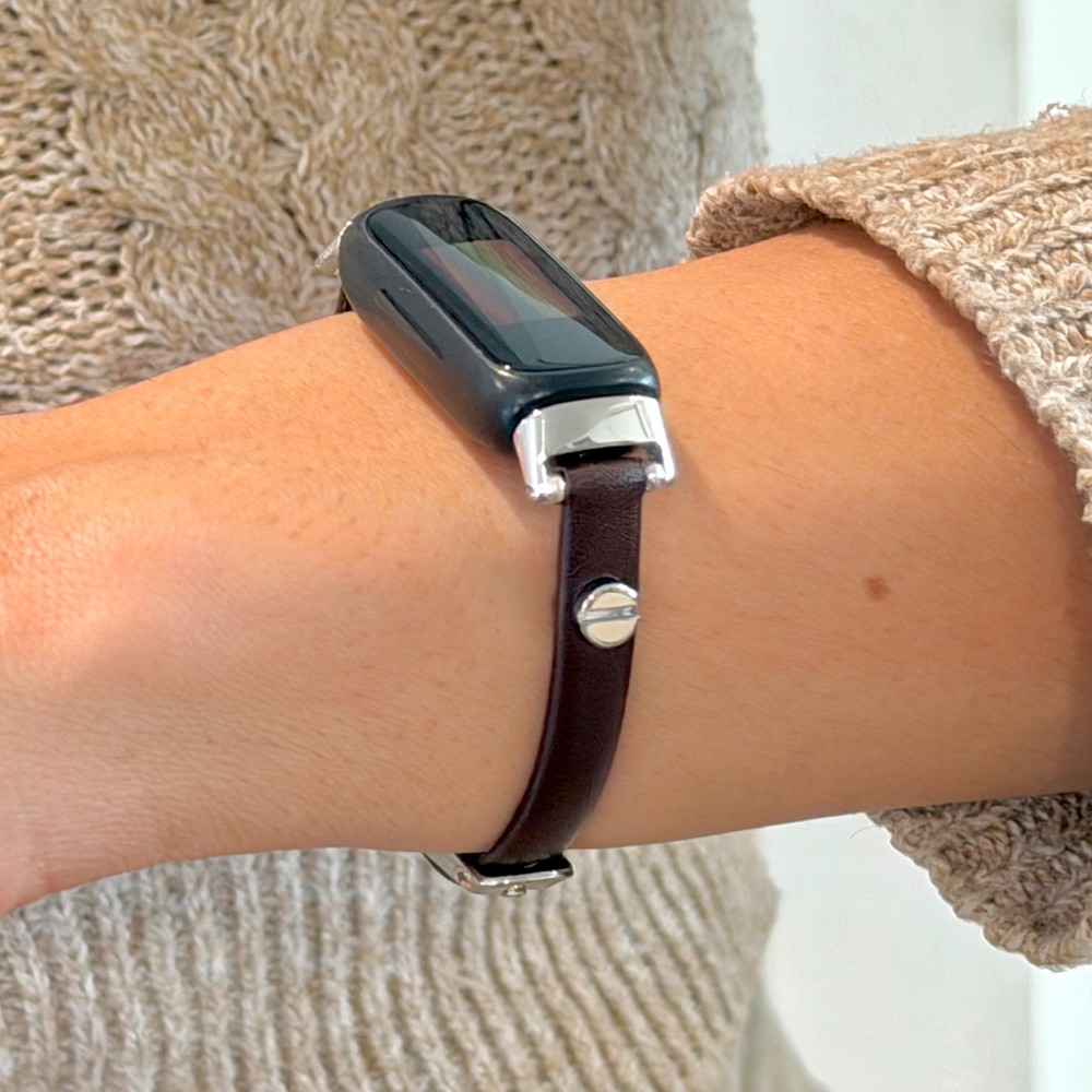Slim dark brown leather Fitbit Inspire 3 band for women with elegant silver accents. This handmade 8mm genuine leather bracelet strap gives your Fitbit Inspire 3 a feminine, jewelry style look while staying lightweight and comfortable for everyday wear. What you’ll receive 1 dark brown leather Fitbit Inspire 3 bracelet band Slim 8mm genuine leather strap Silver tone accent hardware / buckle Features Slim, feminine bracelet style Adjustable buckle fit Lightweight and comfortable for daily wear Refined minimalist look for everyday outfits Compatibility Designed for Fitbit Inspire 3 Please double-check your tracker model before ordering. Wrist sizing Fits approx. 5"–7.5" wrist circumference Please measure your wrist before ordering for the best fit. Materials 8mm genuine leather Silver tone hardware/accent details (as shown in listing title/description snippets) Notes Fitbit tracker is NOT included