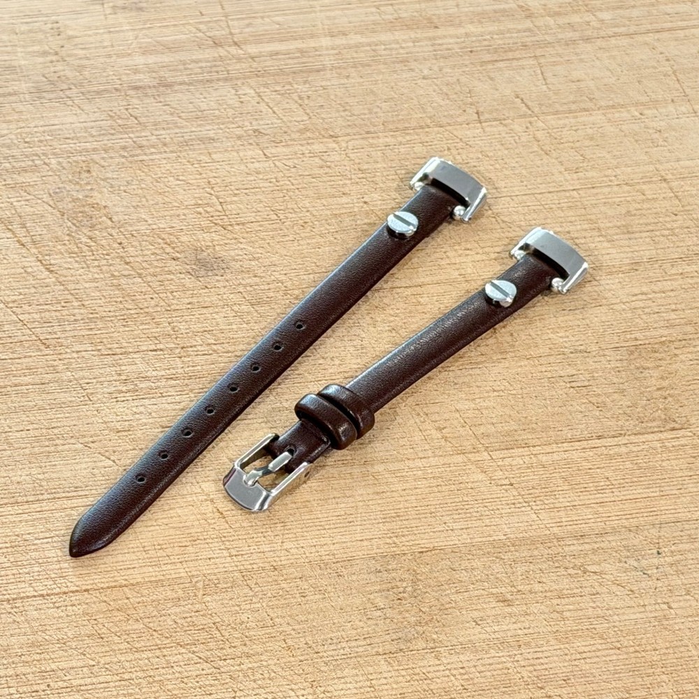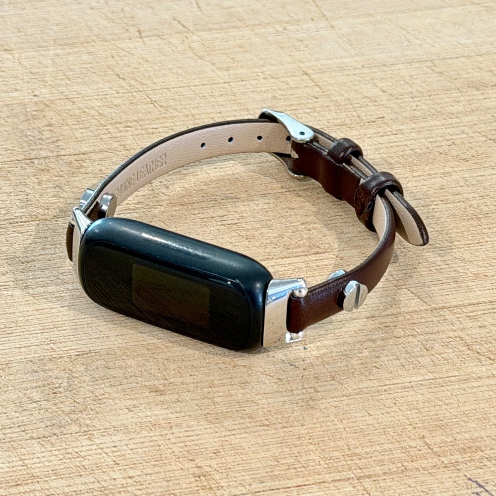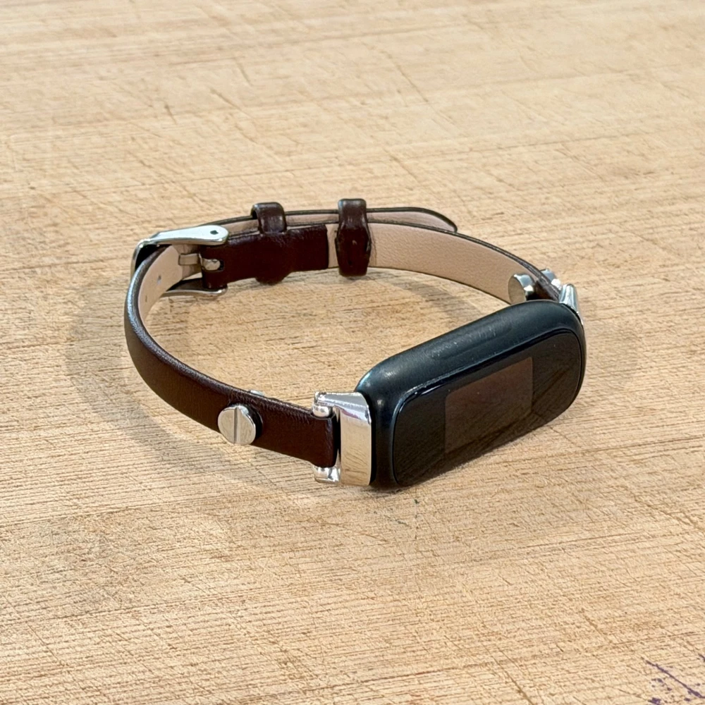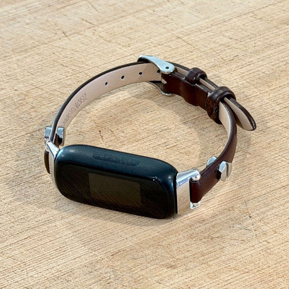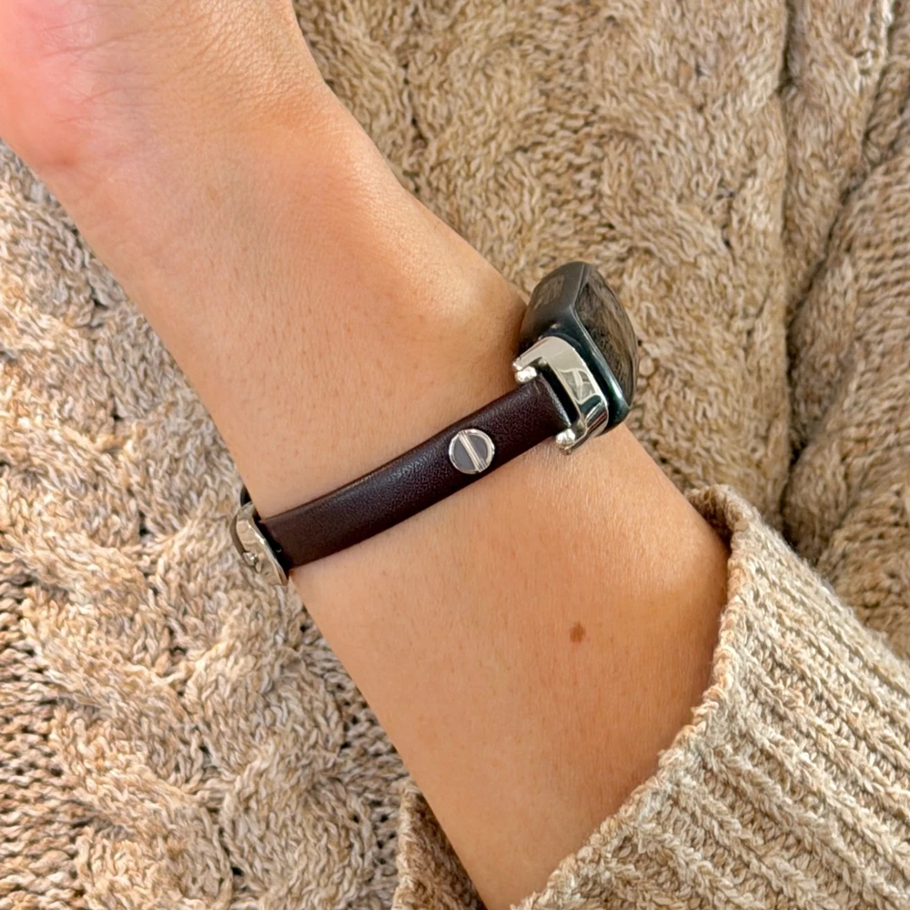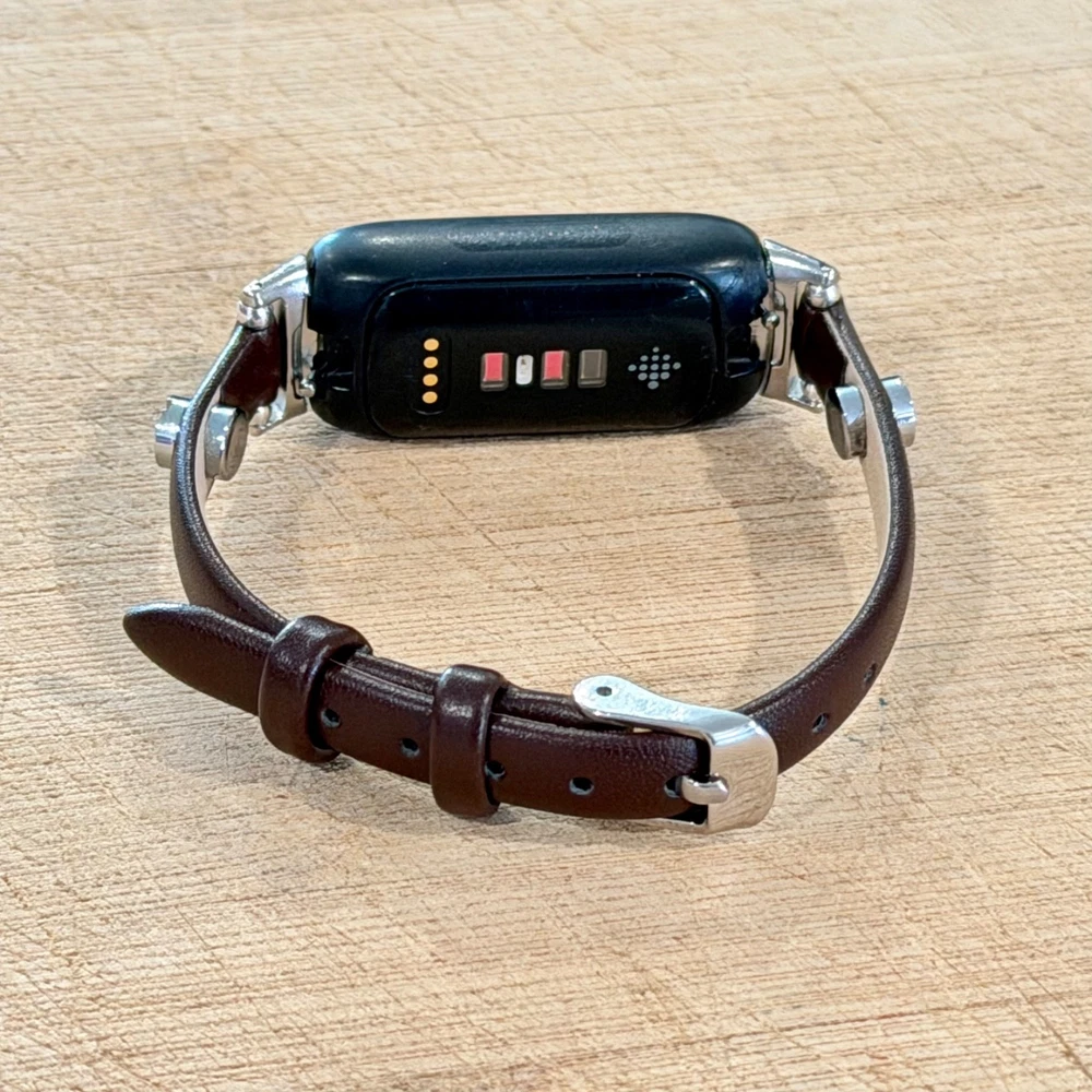 Slim dark brown leather Fitbit Inspire 3 band for women with elegant silver accents. This handmade 8mm genuine leather bracelet strap gives your Fitbit Inspire 3 a feminine, jewelry style look while staying lightweight and comfortable for everyday wear. What you’ll receive 1 dark brown leather Fitbit Inspire 3 bracelet band Slim 8mm genuine leather strap Silver tone accent hardware / buckle Features Slim, feminine bracelet style Adjustable buckle fit Lightweight and comfortable for daily wear Refined minimalist look for everyday outfits Compatibility Designed for Fitbit Inspire 3 Please double-check your tracker model before ordering. Wrist sizing Fits approx. 5"–7.5" wrist circumference Please measure your wrist before ordering for the best fit. Materials 8mm genuine leather Silver tone hardware/accent details (as shown in listing title/description snippets) Notes Fitbit tracker is NOT included