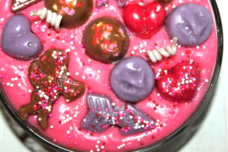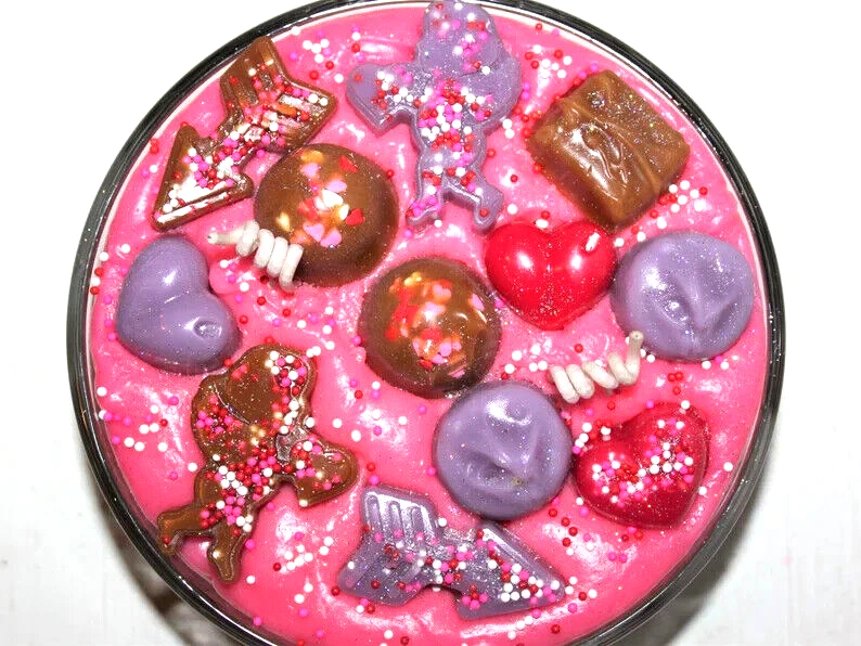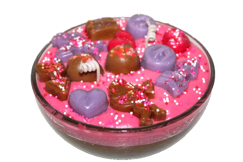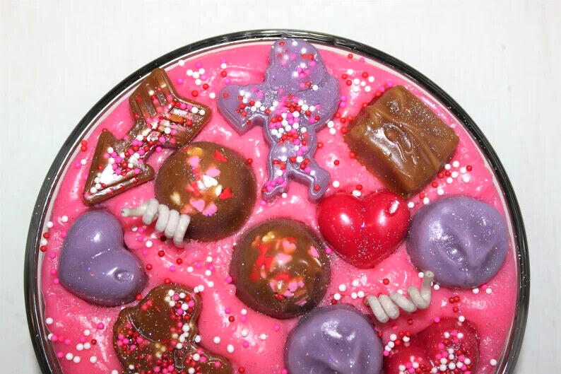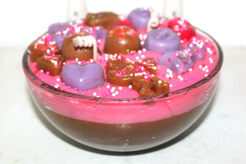 **** SHIPPING IS OFTEN CALCULATED HIGH WHEN PURCHASING MORE THAN 1 ITEM SO FEEL FREE TO MESSAGE ME FOR A SHIPPING QUOTE **** When combining purchases please click on "request total from seller" at checkout and wait for me to send you a invoice with combined shipping. If you are using your phone this option may not be available and if so just message me and I can make you a listing with everything combined and the correct amount on shipping. Thank You ;) This is my handmade highly scented Valentine's bowl candle. The bowl is 6" x 3". On top of the candle I put pieces of very real looking wax candy chocolates, cupids, arrow, hearts, sprinkles and glitter. It is highly scented in CHOCOLATE COVERED RASPBERRIES. A sweet aroma of fresh raspberries covered in a smooth creamy milk chocolate. International Buyers : Please contact me for shipping quote. Caution: Failure to follow instructions could result in fire hazard injury, or smoke damage. Keep wax free of matches, wick trimmings, or other flammable materials. Keep wick centered & trimmed to 1/4" to prevent smoking & soot build up on container or other items. Burn only on stable heat resistant surface for not more than 4 hours at a time. Keep out of drafts. Discontinue use when only 1/2" wax remains on bottom. Do not move candle while burning or if wax is hot. Keep out of reach of children & pets. Never leave a burning candle unattended. Shipping I strive to ship within 48 hours of payment received not including weekends and holidays. I ship USPS Priority or Parcel Post and for the heavier orders I can ship Fed-Ex. I do offer USPS Flat Rate shipping as well. Insurance is the buyers responsibility. I am always happy to combine auctions to save you money on shipping fees. Please email with any shipping questions or quotes if needed. Thanks for stopping by! Please do come back again soon~ *** Please note I do not accept returns for used merchandise. Must be returned in same condition as received. *** RETURNS ARE ONLY ACCEPTED IF ITEM HAS BEEN MISREPRESENTED