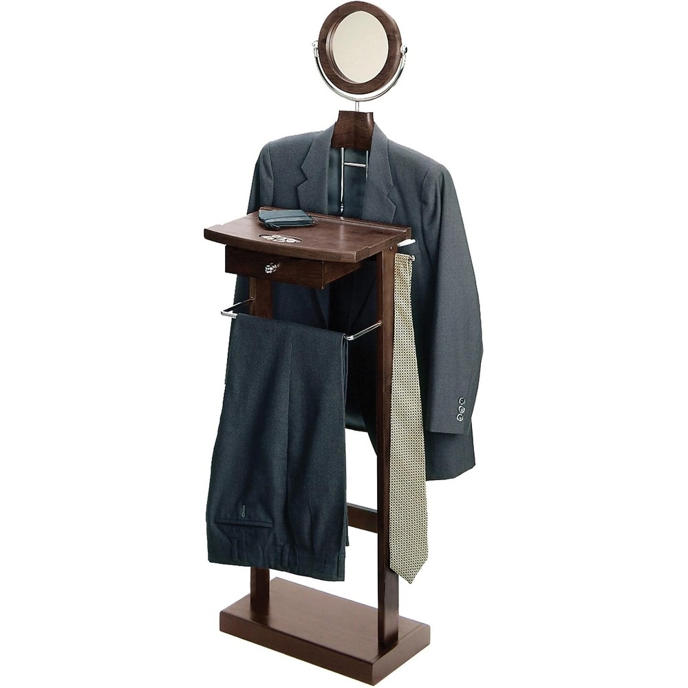 The Alfred Valet Stand accommodates a shirt, jacket, trousers, ties, and pair of shoes. This valet features a center storage drawer perfect for keys and a wallet, and a tilt mirror. The solid wood base for resting your shoes. Sold as 1 Each. Dark espresso solid wood construction. Features includes coat/shirt hanger, bar, mirror and drawer. Dimensions: 55.33"H x 19.84"W x 14.96"D. Functional and attractive addition to any bedroom or dressing area. Assembly required. Keep your clothing wrinkle-free and ready to go. Finish: Dark espresso.
