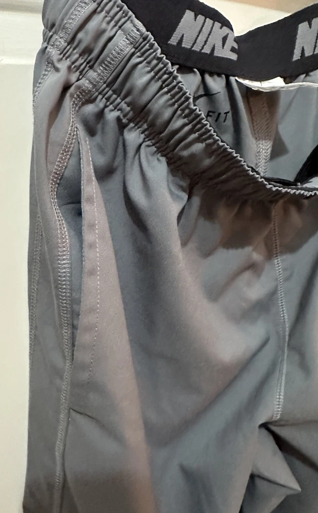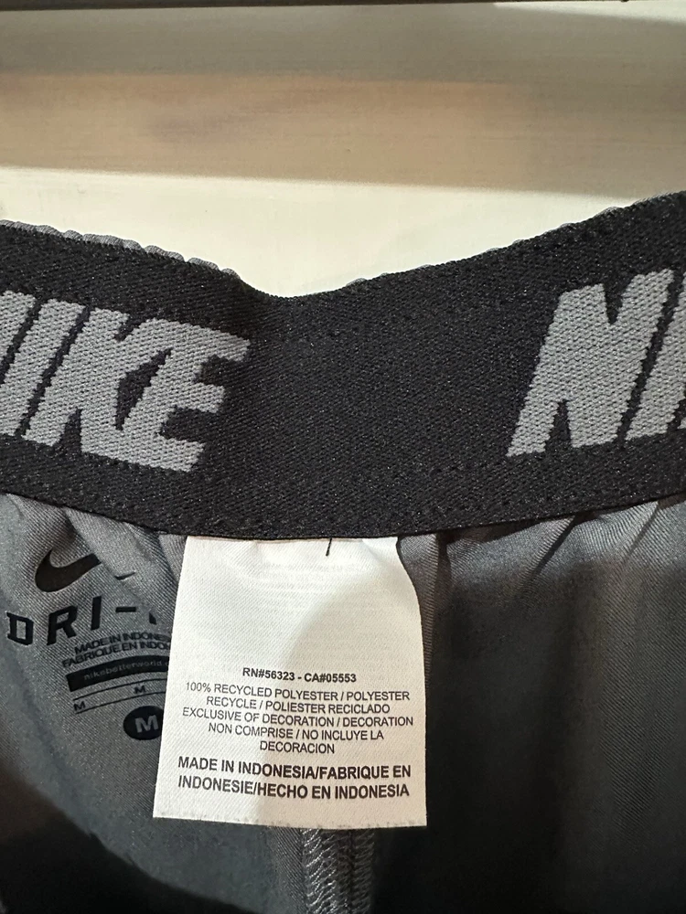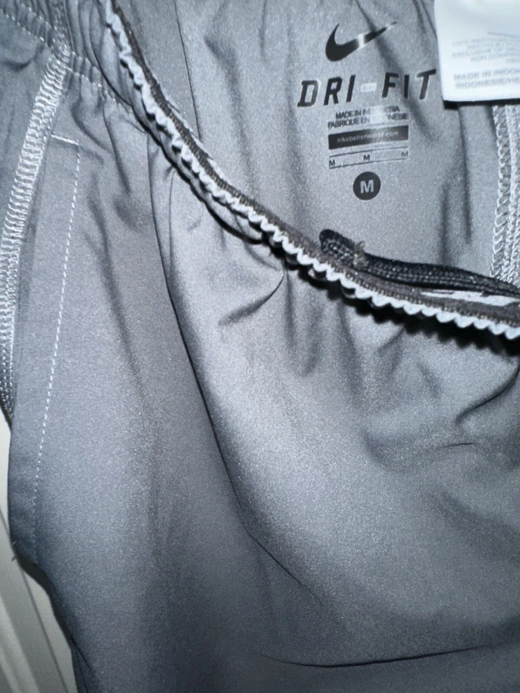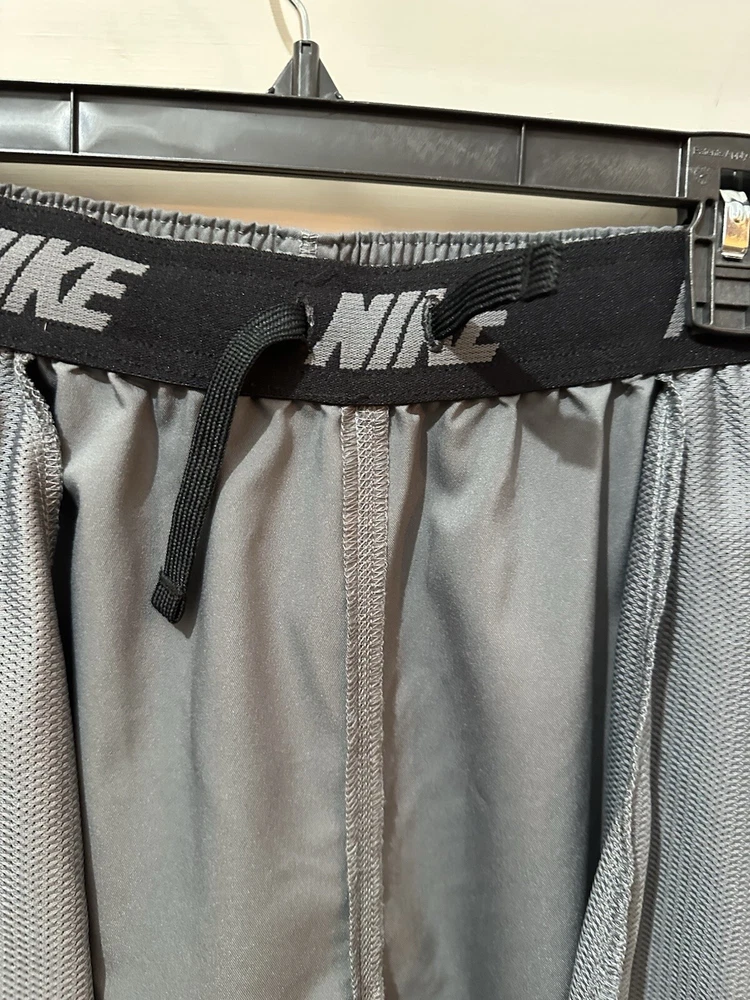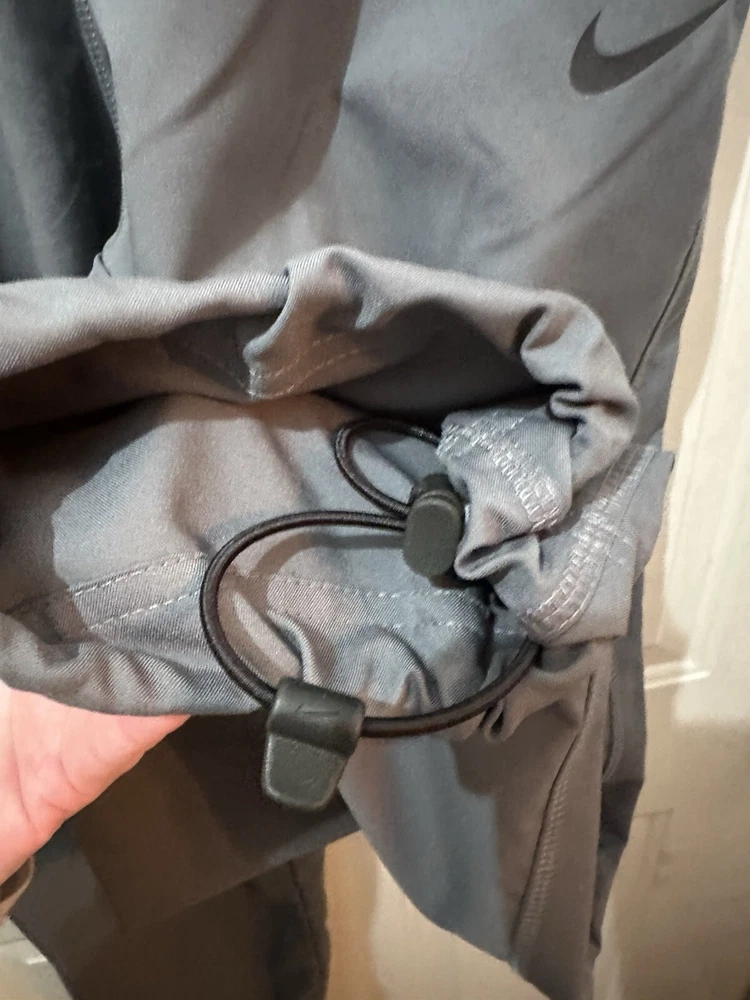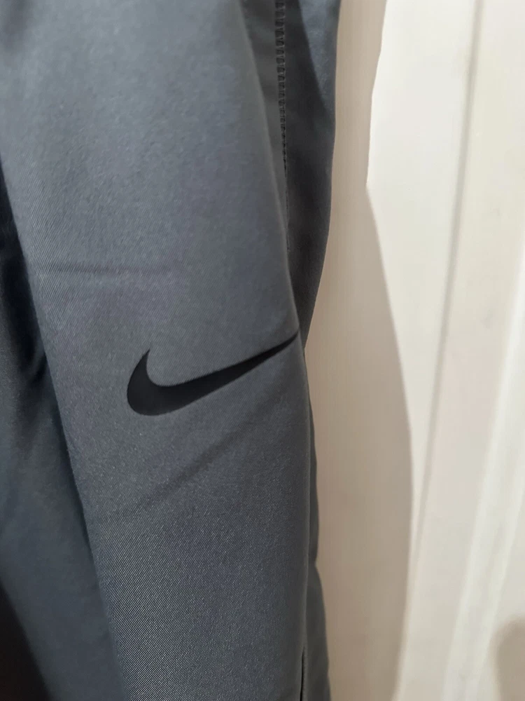 Preloved condition. These dark gray Nike Dri-Fit Windbreaker Pants in size Medium are designed for athletic wear. Made of 100% polyester blended fabric, they feature an elastic waist and pockets for convenience. With a solid pattern and Nike branding, these track pants are suitable for various activities like gym training, basketball, and running. The pants are machine washable and ideal for all seasons.