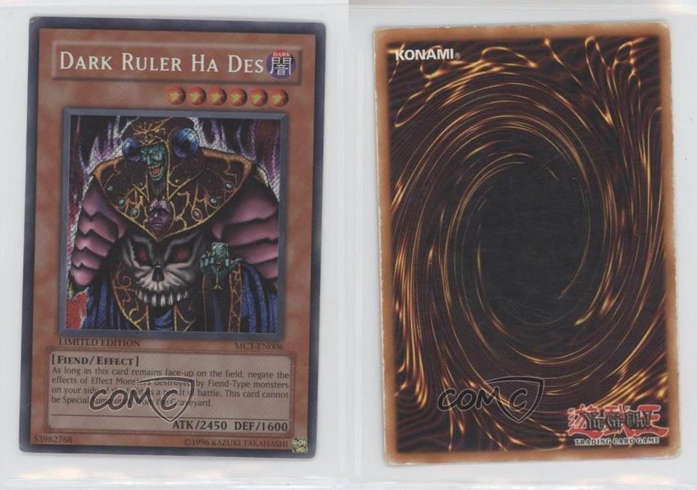 2004 Yu-Gi-Oh! Master Collection - Volume 1 Limited Edition Promos #MC1-EN006 Dark Ruler Ha Des COMC Item: 143039358 - YuGiOh Card - Featuring Dark Ruler Ha Des Search for more: 2004 Yu-Gi-Oh! Master Collection Search for more: 2004 Yu-Gi-Oh! Master Collection - Volume 1 Limited Edition Promos View all of our Listings Auctions Buy It Now About Us Located in the beautiful Pacific Northwest, COMC (Check Out My Cards) is the world's largest consignment service for trading card singles. More than 10,000 people have used our consignment service to list over 50 million trading cards. Find out how we can help you consign your items on eBay by contacting us through eBay messaging. COMC -- "The Safe & Easy Way to Buy & Sell" Raw Condition for Modern Cards Unless otherwise noted, raw modern cards are listed in Near Mint-Mint condition or better. A NM-MT card appears to be Mint at first glance, but upon closer inspection, may exhibit some of the following: minor print defects (e.g. roller marks, print line, dimple), minor scratches, slight edge wear, and slight corner wear. Centering is clearly visible in the images provided and does not factor into our condition assessment. Raw Condition for Vintage Cards Unless otherwise noted, raw vintage cards are listed in Excellent condition or better. An EX card may exhibit some of the following: minor rounding of corners, surface wear, print defects, light scratches, and slight edge wear/chipping. Centering is clearly visible in the images provided and does not factor into our condition assessment. Domestic Shipping Combined shipping for multiple items is available. To receive combined shipping, please ensure all desired items are in your eBay shopping cart before proceeding to checkout. eBay limits orders to 40 items per order. We automatically combine multiple orders placed on the same day. If you place multiple orders on the same day, please contact us to request a refund of applicable shipping costs. Signature confirmation may be required on invoices over $400. All cards are protected and shipped securely. International Shipping COMC offers eBay's International Shipping (EIS) for international orders under $2,500* (see country exceptions below). All duties and import fees are paid at checkout; in the rare event that there are additional import fees upon delivery, these are borne by the buyer. EIS packages route through a shipping hub in Erlanger, KY before shipping to their final destination. Please note that EIS does not allow for combined shipments. The shipping rates are determined by eBay and cannot be adjusted. *Maximum sale price exceptions: Colombia, Kuwait ($2,000); Taiwan ($1,539); Chile, Costa Rica, Guatemala, Honduras, Trinidad and Tobago ($1,000); Antigua and Barbuda, Aruba, Belize, Dominica, Grenada, Philippines, Saint Kitts and Nevis, Saint Lucia, Montserrat, Turks and Caicos Islands ($500); Dominican Republic, El Salvador ($200). Please request a shipping quote through eBay messaging for orders that exceed the maximum sale price supported by eBay's International Shipping. You will be responsible for all duties and import fees for international orders shipped outside the EIS. All cards are protected and shipped securely. Payment COMC does not accept offers on our cards through our eBay storefront. COMC utilizes eBay’s managed payments system. If you are experiencing difficulties making a payment, please contact eBay for assistance. Return Policy Returns are only accepted on the rare occasion the item is not as described. If you are making a return, please initiate the return process through eBay so a mailing label can be provided for you. Prior to listing, our expert team carefully assessed this item to represent it accurately. Please review the description and high-definition images prior to purchasing to ensure this item meets your satisfaction. We welcome you to contact us if you have further questions about this item. Trust and Integrity COMC carefully assesses each item consigned to us to prevent fraudulent items from entering the marketplace. If you believe an item offered on COMC may be fraudulent, please contact us with details so we can investigate the issue. Items we determine are outside our supported items policy may be removed. Last Modified: 6/2/2025 9:38:43 PM PDT