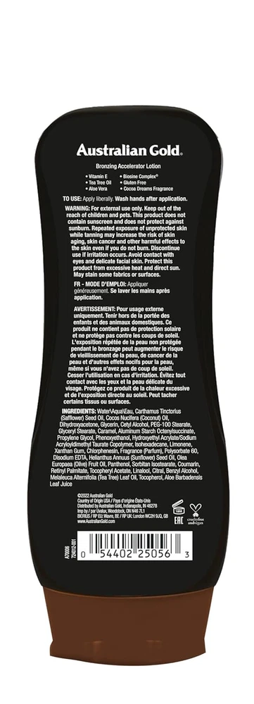 ACHIEVE A DEEPER, DARKER TAN - This dark tanning accelerator lotion with instant bronzer intensifies your bronze glow & helps you achieve a darker tan. Blends effortlessly and absorbs quickly, allowing for an even sunless tanning or outdoor sun tanning BLESSED WITH AUSTRALIAN NATURALS - This tan accelerator features a rich blend of Aloe Vera and Tea Tree Oil, a powerful antioxidant that helps fight off free radicals and features a rich blend of Tea Tree Oil, a powerful antioxidant that helps fight off free radicals and leaves skin fresh. Comes in a delectable Cocoa Dreams fragrance BIOSINE COMPLEX FOR A LONG-LASTING TAN - This tanning intensifier contains an advanced combination of ingredients that prepare your skin for a dark color development while soothing, smoothening & nourishing your skin. It does not contain sunscreen HYDRATION & SUPERIOR SKIN BENEFITS - Enriched with Vitamin A & E and Natural Oils, this accelerator & bronzer not only helps build a flawless tan but also supplies essential nutrients to the skin, while moisturizing & hydrating it for a soft & supple feel REFRESHING FRAGRANCE - This tanning accelerator lotion takes you on an instant vacation to the beach with its signature Cocoa Dreams fragrance in a delectable and long-lasting scent that keeps you fresh all day long B003GX5SSC