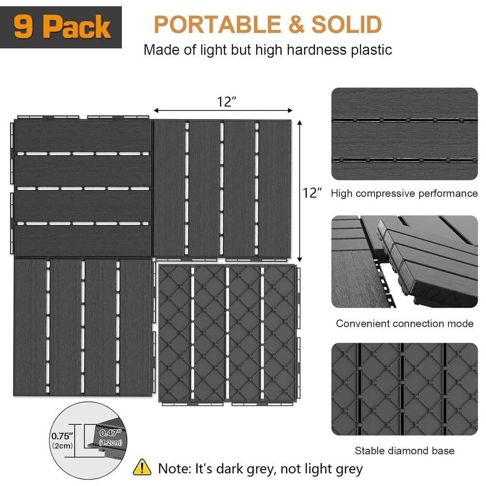 Lightweight 9-Pack Dark Grey Interlocking Deck Tiles - Easy Snap Installation ‹ › ‹ › ‹ › ‹ › ‹ › ‹ › ‹ › ‹ › ‹ › Lightweight 9-Pack Dark Grey Interlocking Deck Tiles Easy Snap Installation Features: Constructed from high hardness plastic, offering a lightweight yet firm alternative to wooden deck tiles. Exceptional load-bearing properties while maintaining moisture resistance. Stability ensured with high-density plastic that withstands direct sunlight, rain, and snow, perfect for all- use. Upgraded interlocking mode for faster and tool-free installation. Rectangular snaps create a secure connection between flooring tiles to prevent separation. Efficient drainage design with four flat surfaces and three drains to eliminate water accumulation. Rhombic structure on the back for improved friction, enhanced stability, and air circulation. Low maintenance cost; easily cleaned with water and a cleaning tool. Customizable with a saw for tailored sizing to fit your unique spaces. Benefits: Durable and weather-resistant for all seasons. Efficient drainage system keeps floors neat and safe. Convenient, low-maintenance design perfect for busy lifestyles. Versatile use in outdoor and indoor settings, such as patios, pool areas, gardens, and bathrooms. Easily customizable for any space, ensuring a perfect fit. Why choose our Interlocking Deck Tiles? Transform your outdoor space with our Lightweight 9-Pack Dark Grey Interlocking Deck Tiles, a perfect blend of style, durability, and practicality. Say goodbye to cumbersome wooden tiles and hello to a lightweight, high-performing alternative. With effortless snap installation and a unique drainage design, you can create a stunning area for relaxation or entertainment without sacrificing functionality. Elevate your outdoor aesthetic while ensuring ease of maintenance. Invest in a flooring solution that is both convenient and durable. Make your purchase today and redefine your living spaces effortlessly! Shipping Free & Fast Shipping - We offer free shipping to most of the USA with a normal delivery time of 3-7 days. However, due to the current situation, additional delivery time (up to 3 weeks) may be required for some items. Alternative Carriers - We may use alternative carriers (e.g. USPS, FedEx, UPS, etc.) to ensure your package arrives safely and on time. Due to the use of multiple carriers, we are unable to provide a tracking number automatically. Handling Time - Orders are processed and shipped within 1-2 business days of receiving cleared payment. Shipping Restrictions - Shipping to Alaska, Hawaii, Puerto Rico, Guam, and other US territories may incur shipping charges or delivery restrictions. Please contact us before ordering, or your order can be refunded/cancelled. State Restrictions - There may be restrictions based on your state of purchase. For example, certain items may not be shipped to California due to state regulations. Contact for Tracking Updates - If you require tracking updates or have any concerns about the delivery of your order, please feel free to contact us, and we will be happy to assist you. Return 30-Day Hassle-Free Returns - We want you to be completely satisfied with your purchase. If you are not, you can return the item within 30 days of receiving it for a full refund or exchange. Easy Return Process - To start a return, simply contact us and we will provide you with a prepaid return shipping label and detailed instructions. Restocking Fee - There are no restocking fees for returns. However, the buyer is responsible for return shipping costs if the return is not due to a seller's error. Refund Processing Time - Refunds will be processed within 5 business days of receiving the returned item in its condition. Payment We accept all major credit cards, PayPal, and Apple Pay for your convenience. Your payment information is secure and encrypted to ensure a safe and seamless transaction. Please complete your payment within 3 days of purchase to avoid any delays in shipping. Feedback Your feedback is extremely important to us. We strive to provide the best products and customer service possible. If you are satisfied with your purchase, please take a moment to leave us a positive review. If you have any concerns or issues with your order, please contact us before leaving negative feedback. We are committed to resolving any problems and ensuring your satisfaction. Contact Us If you have any questions or concerns, please feel free to out to our customer support team. You can contact us through the eBay messaging system. We are available Monday to Friday, 9:00 am to 5:00 pm EST, and we will do our best to respond to your inquiry within 24 hours. Buy it now and enjoy a pleasant shopping experience! Hardness: High Unit Quantity: 9 Pack Material: Plastic Installation: Click/Interlocking Features: Easy to Install,Non-Slip,Waterproof Installs over Subfloor: Concrete,Plywood Suitable For: Commercial,Commercial & Residential,Residential Installation Location: Below Grade/Concrete Subfloor,On Grade/Concrete Subfloor,Outside Room: Bathroom,Living Room,Patio,Balcony,Poolside,Garden,Outdoor Playground,Walkway Type: Flooring Tiles Wood Species: None Color: Dark Grey Finish: Smooth Shading: Dark Item Weight: 6.13 lb Gloss: Low Gloss Item Thickness: 1.5 cm Size: 12 x 12 in Number of Items: 9 Style: Modern Pack Size: Case Floor Surface Texture: Smooth Coverage: 10 ft² Plank Size: Medium Width Edge Type: Straight Edge Fire Rating: Efl Minimum Acclimation Period: No Acclimation Required Wear Layer Thickness: 0.05 cm