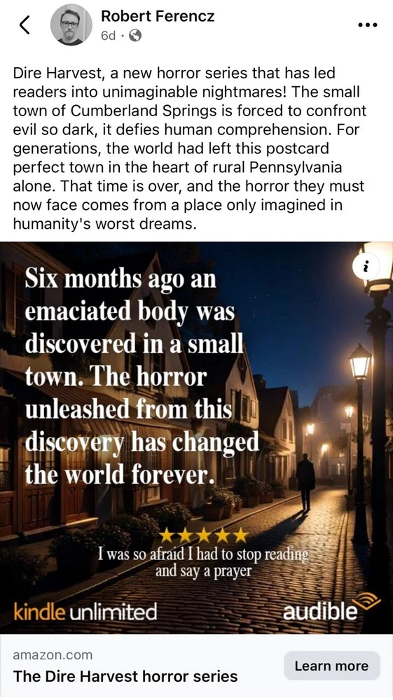 *Signature authenticated with a pic of author signing In the Dire Harvest series, Robert Ferencz explores themes such as the battle between good and evil, the psychological impact of isolation, and the supernatural's influence on human behavior. The series delves into how ordinary people confront extraordinary and often terrifying circumstances, reflecting on the resilience of the human spirit. Ferencz also examines the moral complexities and ethical dilemmas faced by his characters, creating a narrative that is both suspenseful and thought-provoking. These themes resonate with fans of horror and psychological thrillers, drawing comparisons to Stephen King's work. Robert Ferencz is the acclaimed author of the Dire Harvest series, a collection that has garnered high praise from readers, often drawing comparisons to Stephen King. His gripping narratives and well-developed characters resonate with fans of horror and suspense, leading to numerous reviews that suggest, "Move over Stephen King!" With impressive ratings, Ferencz's work captivates audiences, showcasing his ability to blend psychological depth with chilling storytelling. His growing popularity marks him as a significant voice in contemporary horror literature.