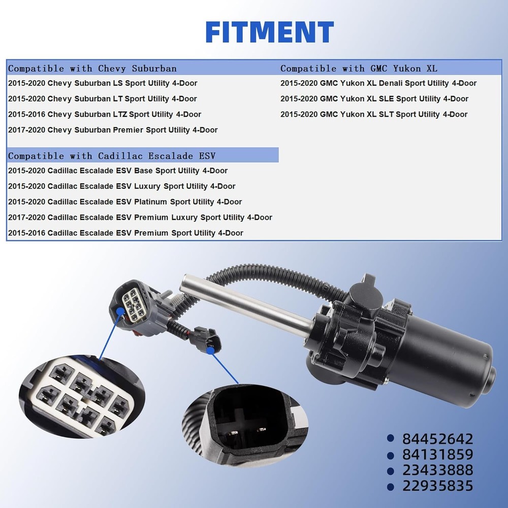Dasbecan Front Left Driver Side (without Bracket) Product Details Manufacturer: Dasbecan Brand: Dasbecan Model: Power Running Board Motor Item Weight: 4.62 pounds Product Dimensions: 12.01 x 5.12 x 5.12 inches Country of Origin: China Item model number: 84452642 Exterior: Aluminum Manufacturer Part Number: 84452642 Special Features: Power Running Board motor Brand: Dasbecan Model Name: Power Running Board Motor Material: Aluminum Item Weight: 2.1 Kilograms Manufacturer: Dasbecan 【Compatible With Chevy】 Power running board motor fits for 2015-2020 Chevy Suburban LS Sport Utility 4-Door ; 2015-2020 Chevy Suburban LT Sport Utility 4-Door ; 2015-2016 Chevy Suburban LTZ Sport Utility 4-Door ; 2017-2020 Chevy Suburban Premier Sport Utility 4-Door 【Compatible With Cadillac】 Power running board motor fits for 2015-2020 Cadillac Escalade ESV Base Sport Utility 4-Door / ESV Luxury Sport Utility 4-Door / ESV Platinum Sport Utility 4-Door ; 2017-2020 Cadillac Escalade ESV Premium Luxury Sport Utility 4-Door ; 2015-2016 Cadillac Escalade ESV Premium Sport Utility 4-Door 【Compatible With GMC】Power running board motor fits for 2015-2020 GMC Yukon XL Denali Sport Utility 4-Door / XL SLE Sport Utility 4-Door / XL SLT Sport Utility 4-Door 【Feature】With high response speed, Reliable and Stable, with Good Hardness and Toughness to Improve Long Life, Wear-Resistant and Scratch-Resistant,the running board motor is easy to install, totally meets or exceeds OEM requirements.