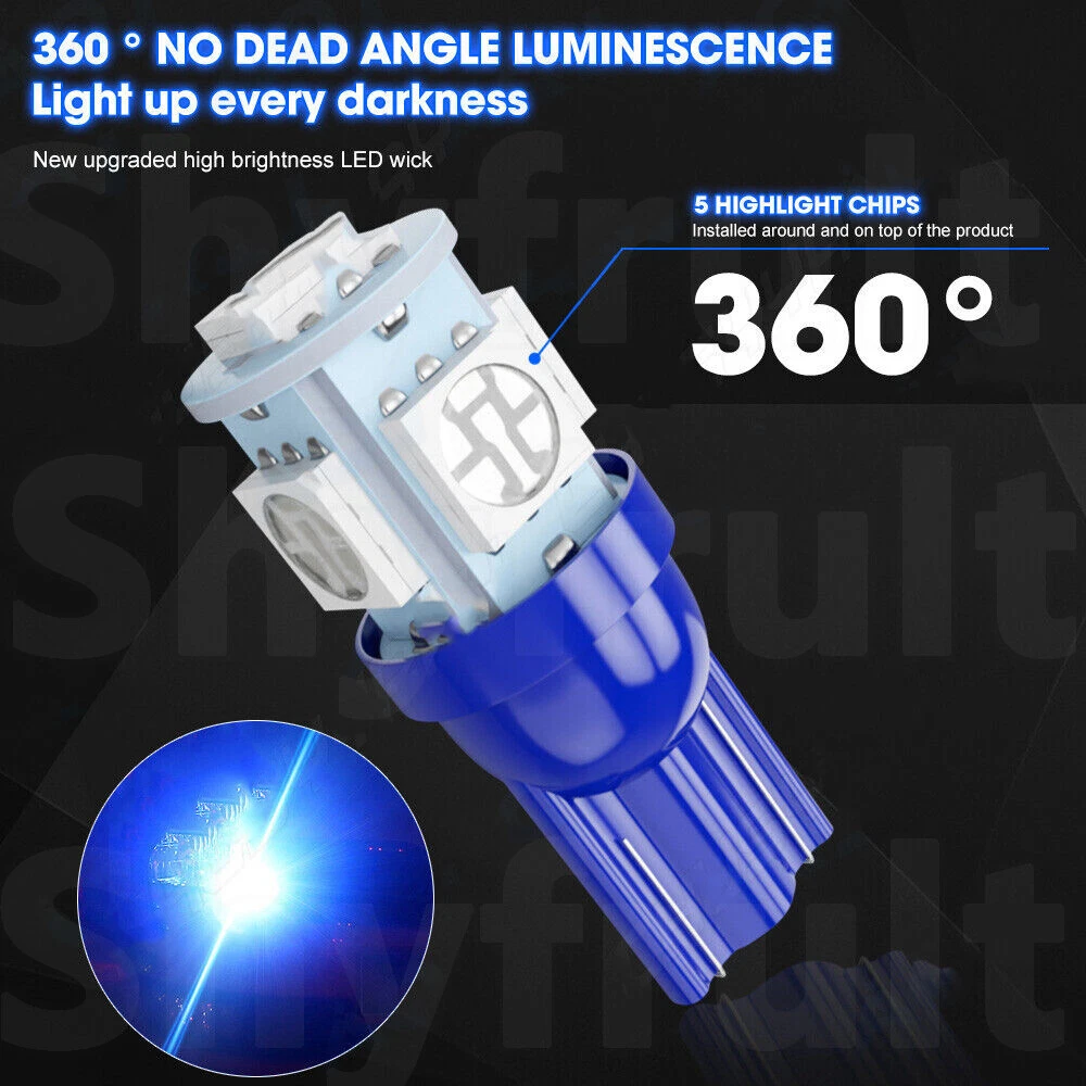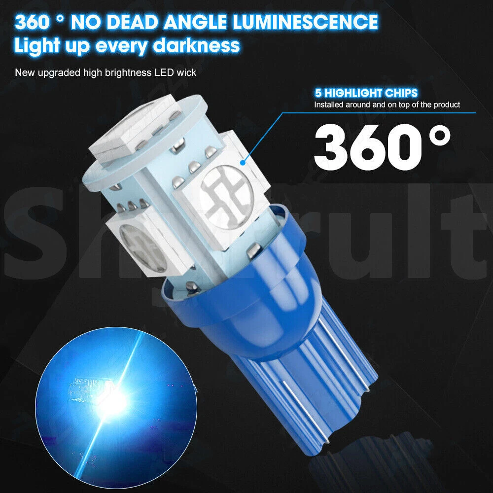 ABOUT THIS ITEM: aqj This listing features 10 pieces of Brand New, Super bright UlTRA Ice Blue SIDE WEDGE 5050 5-SMD bulbs. This is the high quality and produces super bright LED light bulbs that you've been waiting for so long, and it's producing intense light over a large area. An aggressive, yet clean & stylish LED lights, enhanced the outline, make your car stands out in the crowd. -12V DC replacement bulb for Car T10 Wedge T10 Interior Light & Guage Instrument Cluster Light -Replaces 168/194 LED Bulb size Wedge Base bulbs -Immediate response, 1000 times fast than traditional lights SPECIFICATION: 1.Part Number: W5W 194 147 152 158 159 161 168 184 192 193 259 280 285 447 464 555 558 585 655 656 657 1250 1251 1252 2450 2652 2921 2825 906 579 2.Voltage: DC 12V 3.LED Color : Ice Blue 4.LED Type: 5050 3-chips , Each LED has 5 5050 SMD in total 5.LED Brightness: 60-100 LMs 6.Dimension: 9mm x 30mm 7.Life Span: 50.000hours 8. Weight: 25g 9. Application: Great for T10 License Plate tag Light, &Interior Package Light (Dome,Map,Door,Trunk cargo,Glove box...), etc. NOTE: - Suitable for car T10 W5W socket. - Make sure this is the correct application type of bulb before placing order. - Becuase the LED bulbs have lower power cosumption, German brand name of cars may need to tap on Load Resistors to remove the error code on dashboard. After service Notification: If you are satisfied with our product and service please leave us a positive feedback,if there is any problem when you received the package,please feel free to contact us,we will be definitely give you a satisfying solution,when you choose the return reason .please choose the reason"i don't like it". by this option we will accept your return immediately and provide return label for full refund. the others reason to return will take both of us many troubles to handle.