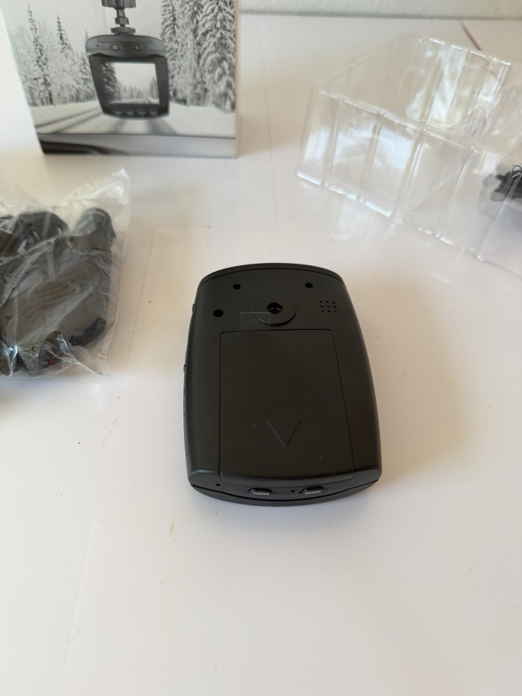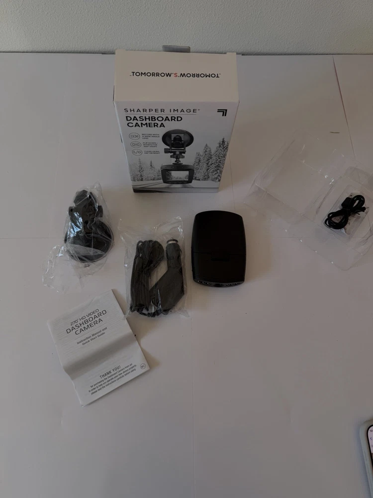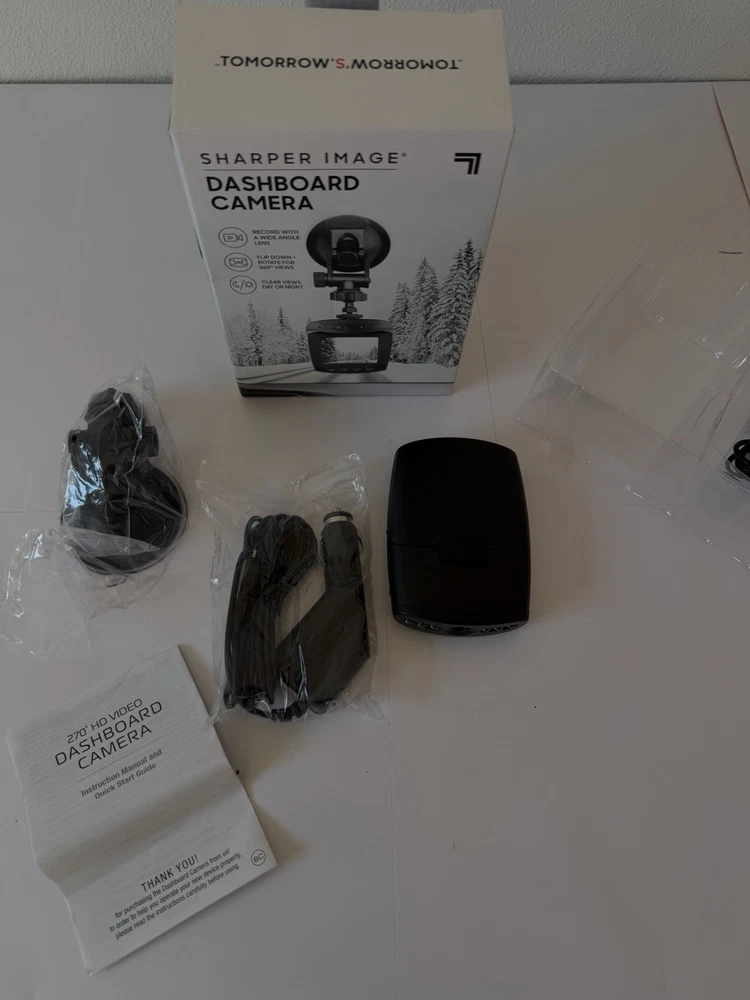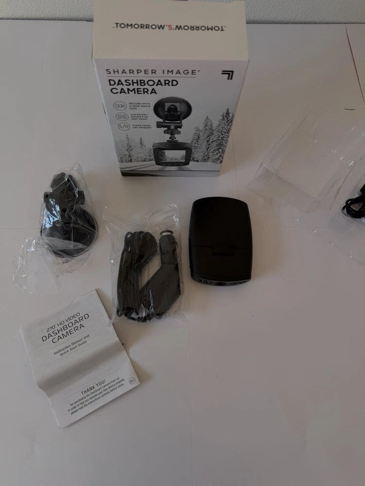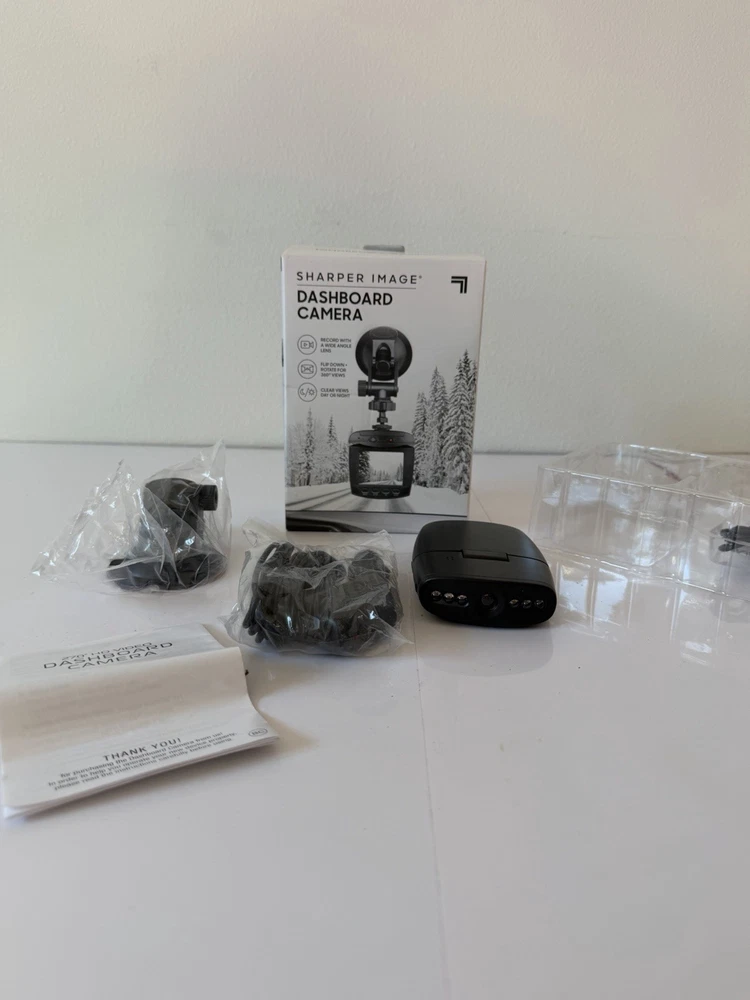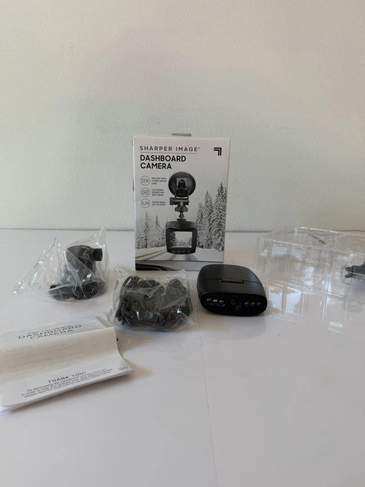 Sharpen Image Dashboard Camera with wide-angle lens. Provides clear video recording day and night. Compact design with flip-down screen and rotating camera head for optimal viewing angles.