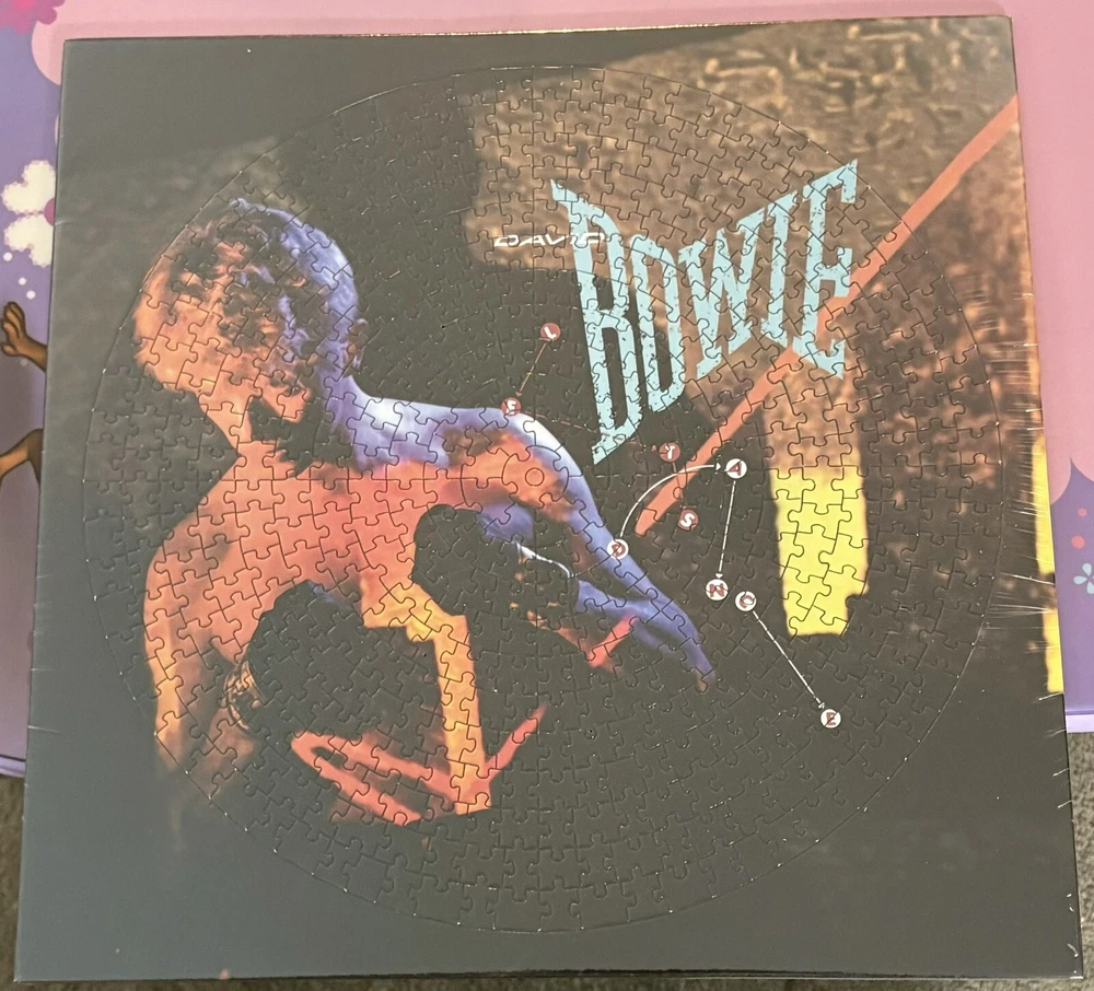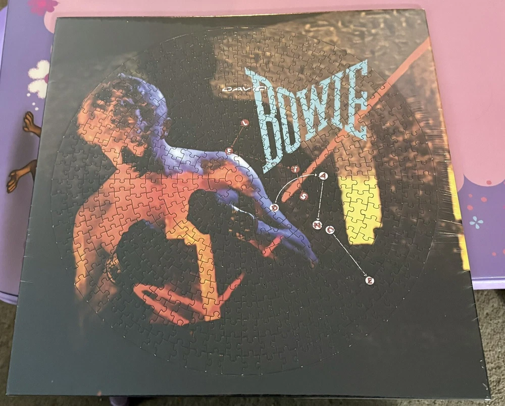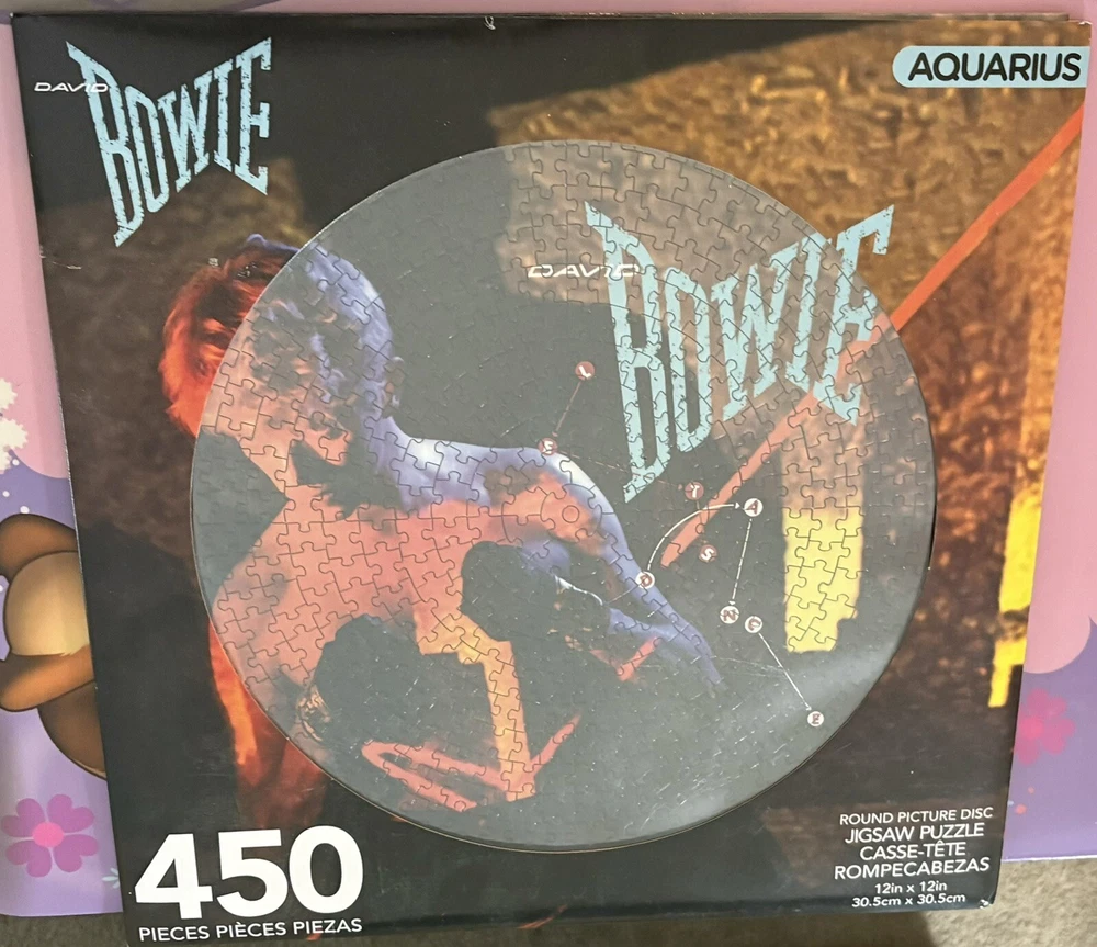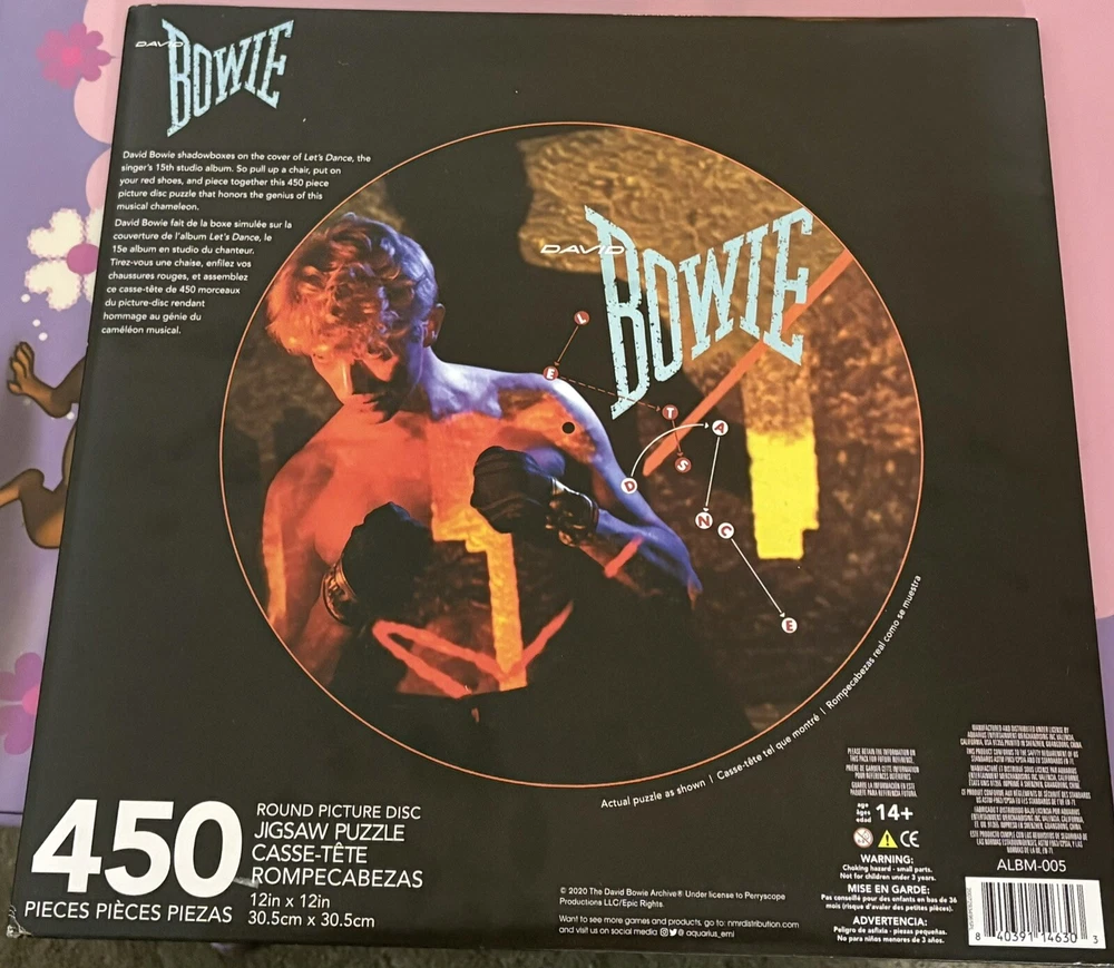 Up for auction is a David Bowie let’s dance round picture disc jigsaw puzzle FUN CHALLENGE: Rock out with this jigsaw puzzle shaped like a vinyl record featuring David Bowie's Let's Dance album art 450 PIECE PUZZLE: Hours of entertainment! The puzzle pieces are secured inside a bag and packaged in a full-color box with puzzle image for solving. QUALITY CONSTRUCTION: Strong high-quality, easy fit puzzle pieces that won't break. DIMENSIONS: Completed puzzle measures 12 inches round Rock out with this jigsaw puzzle shaped like a vinyl record featuring David Bowie's Let's Dance album art. A fun challenge that makes for an amazing display piece once completed. See pictures for condition